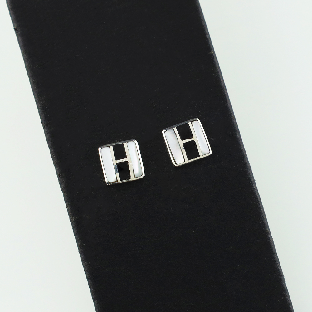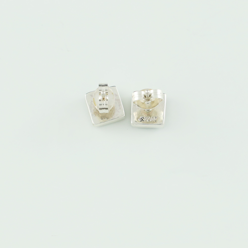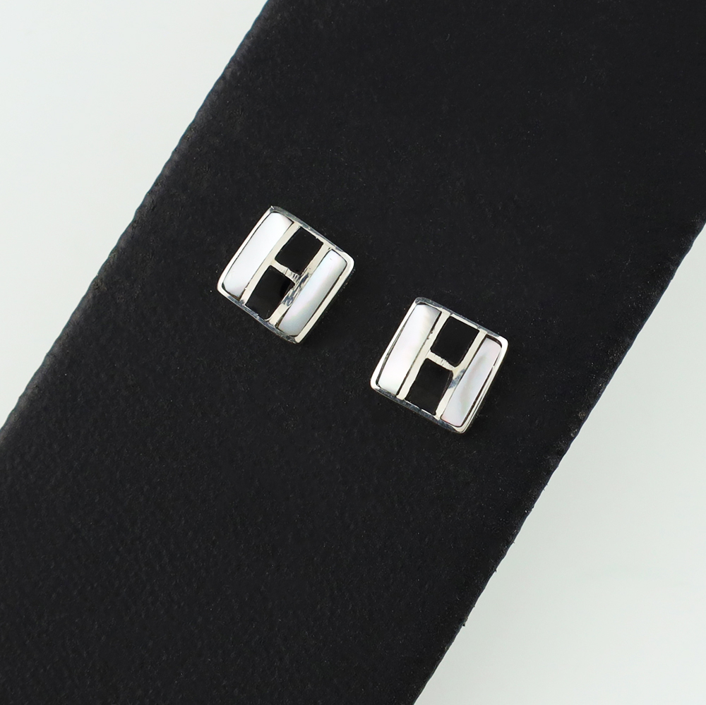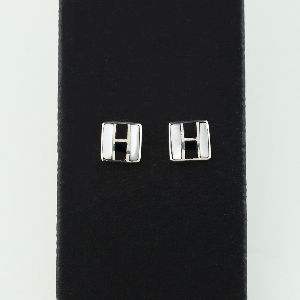 Zuni artists Nancy and Sheldon Westika hand made these exquisite earrings. Made out of sterling silver and inlaid with Mother of Pearl Shell and Jet. Zuni artists are known for their lapidary work. The Westikas have been making jewelry since the 1970’s and they are known for their fine inlay work. Weighs 2 grams. Signed