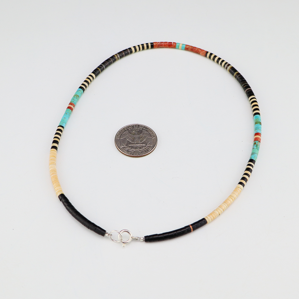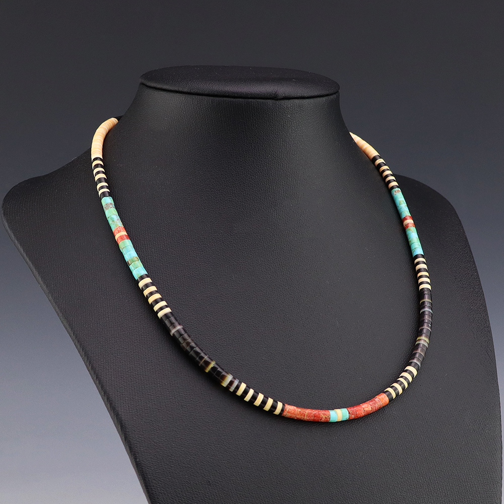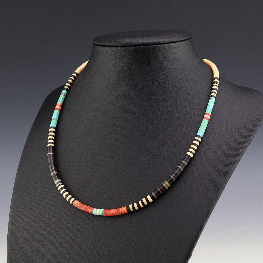 Kewa (Santo Domingo) artists are known for their heishi. The word “heishi“ means “shell” in the Keresan language. Traditionally Santo Domingo jewelry makers created their heishi jewelry out of shell. The shell is hand cut into a flat disc. Today, other stones that Santo Domingo artists cut in this manner, are also referred to as heishi. With modern tools and innovations, artists can create different styles of beads and use different gemstones like turquoise, coral, jet, serpentine, and spiny oyster.