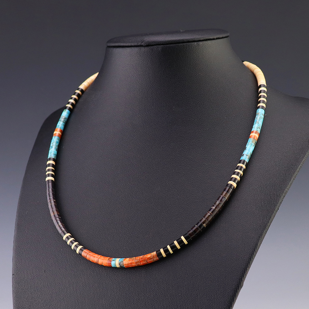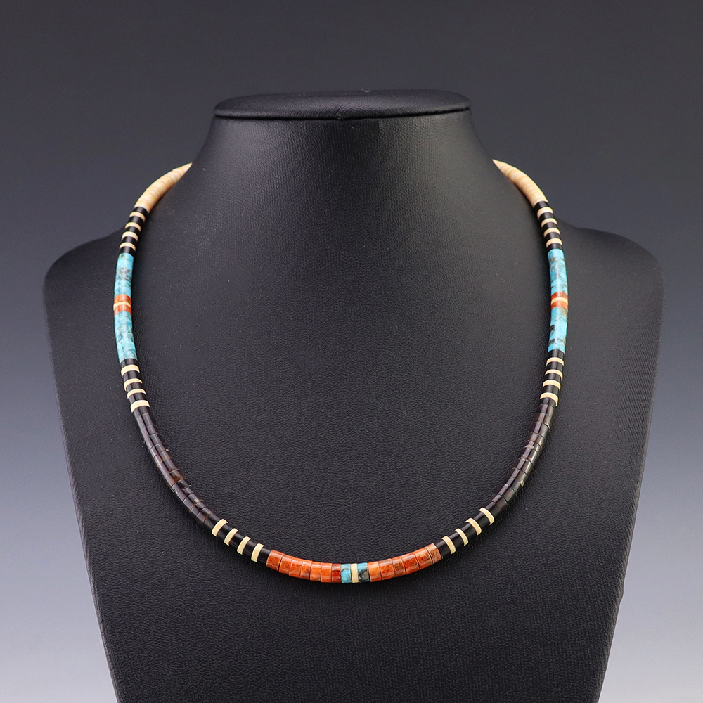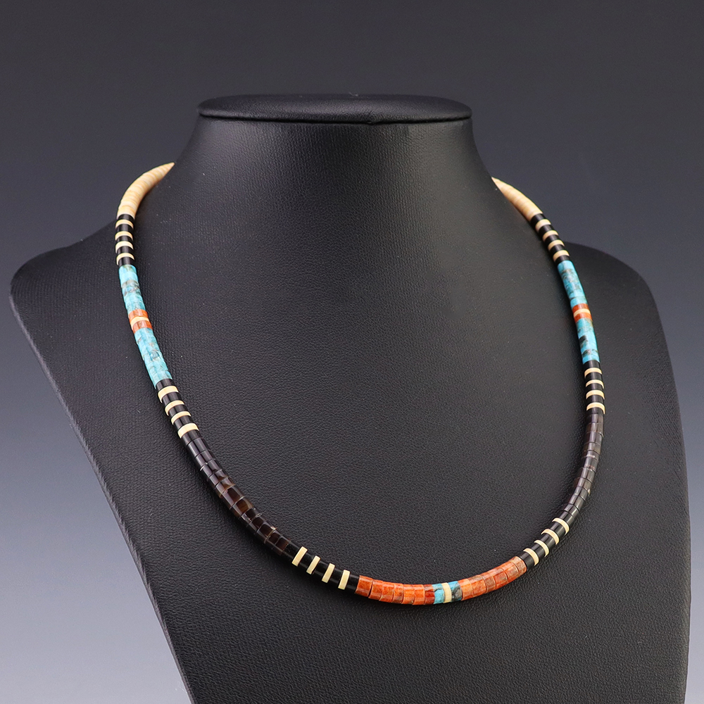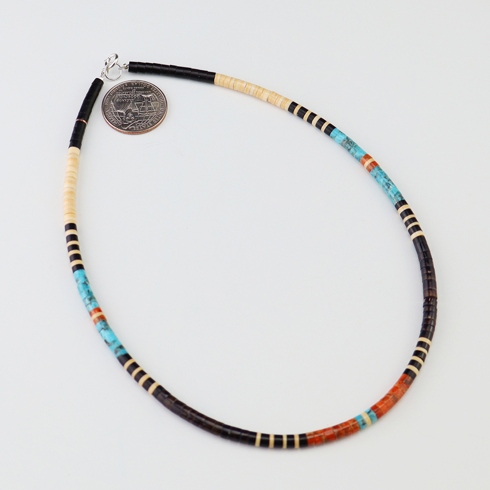 Kewa (Santo Domingo) artists are known for their heishi. The word “heishi“ means “shell” in the Keresan language. Traditionally Santo Domingo jewelry makers created their heishi jewelry out of shell. The shell is hand cut into a flat disc. Today, other stones that Santo Domingo artists cut in this manner, are also referred to as heishi. With modern tools and innovations, artists can create different styles of beads and use different gemstones like turquoise, coral, jet, serpentine, and spiny oyster.