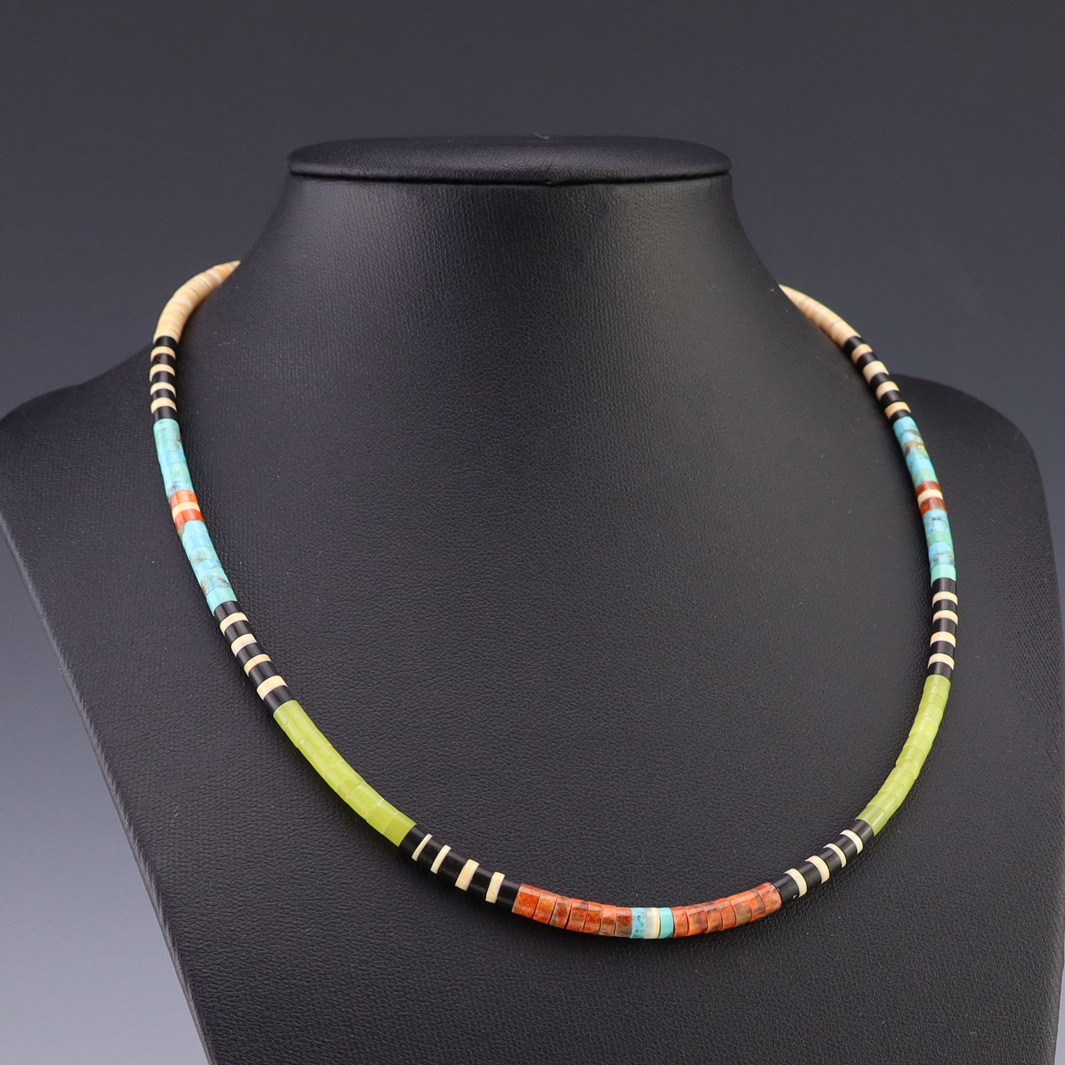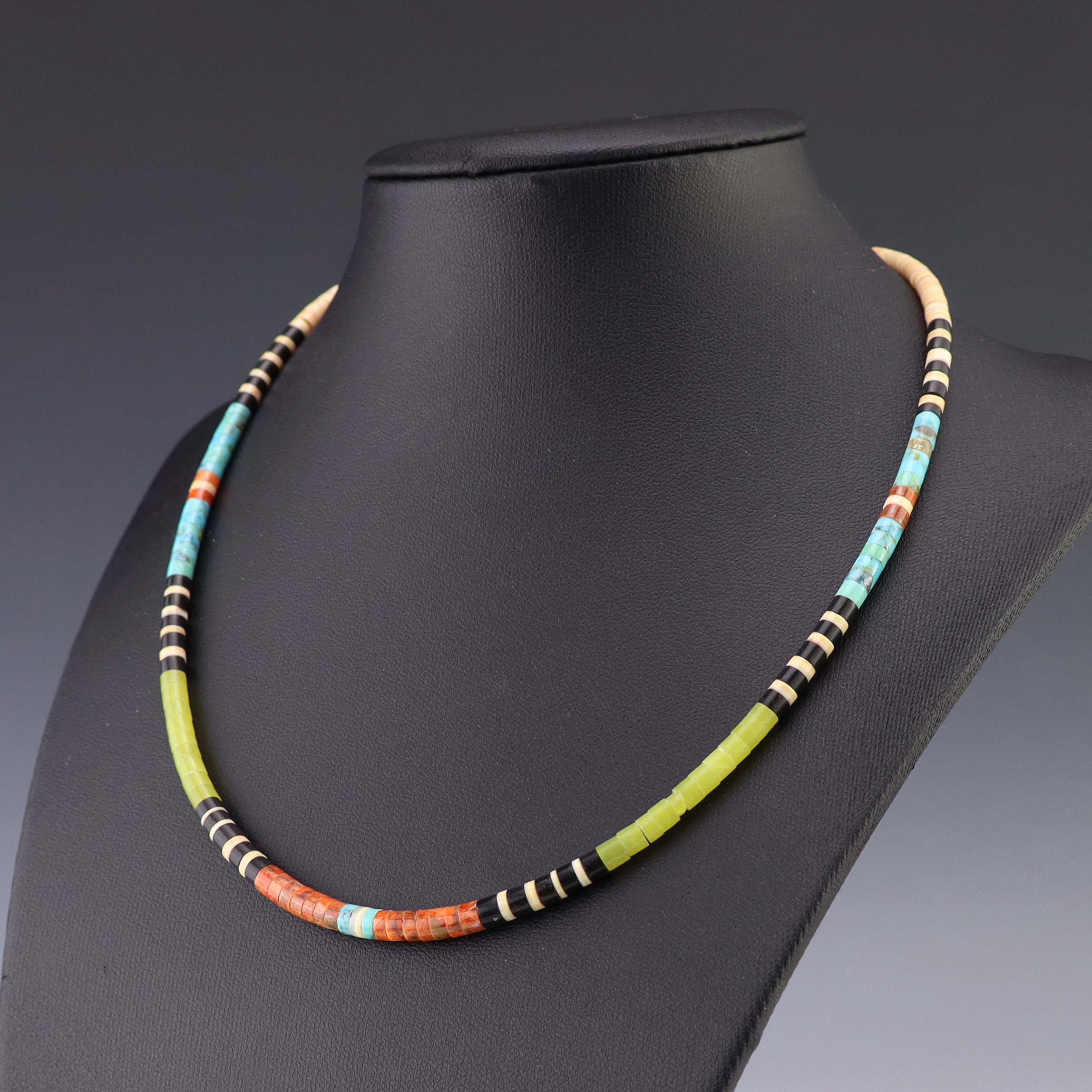 Kewa (Santo Domingo) artists are known for their heishi. The word “heishi“ means “shell” in the Keresan language. Traditionally Santo Domingo jewelry makers created their heishi jewelry out of shell. The shell is hand cut into a flat disc. Today, other stones that Santo Domingo artists cut in this manner, are also referred to as heishi. With modern tools and innovations, artists can create different styles of beads and use different gemstones like turquoise, coral, jet, serpentine, and spiny oyster.