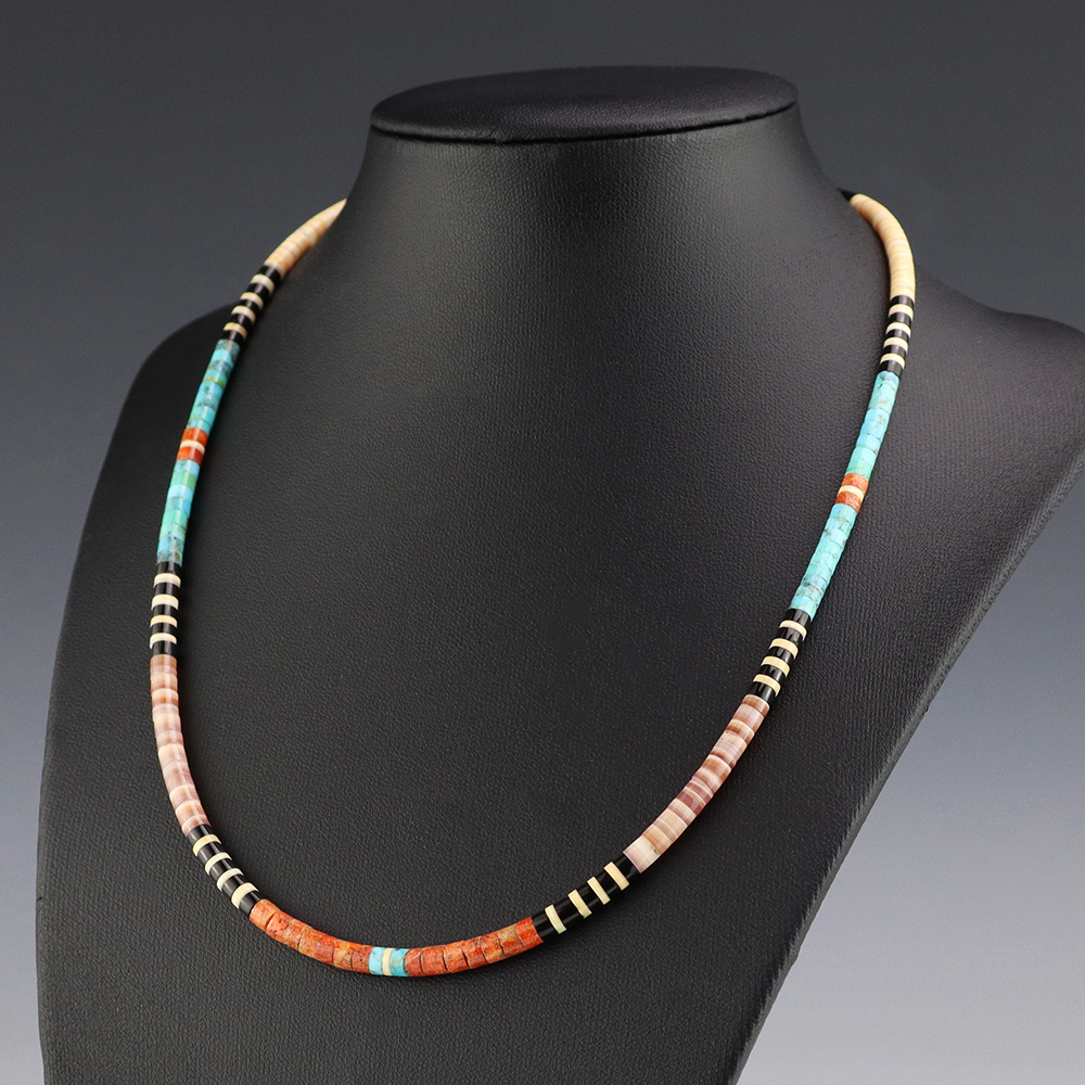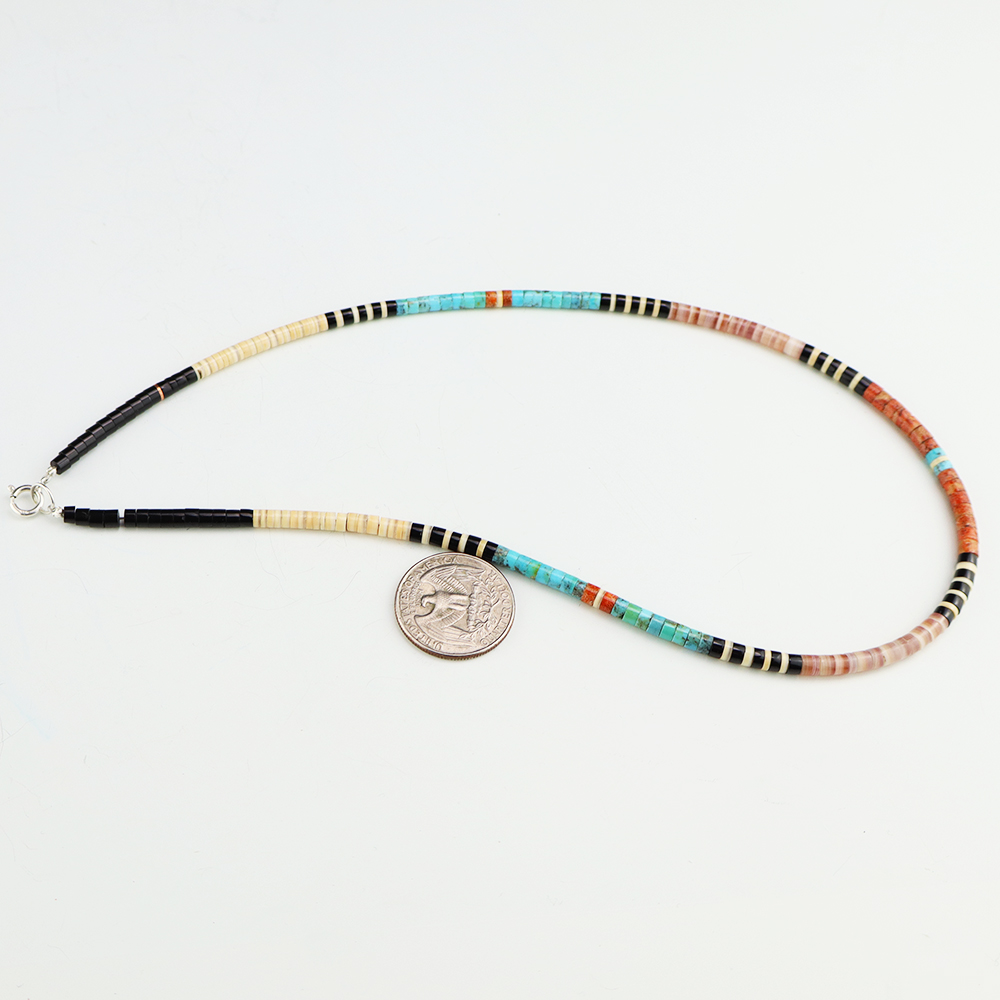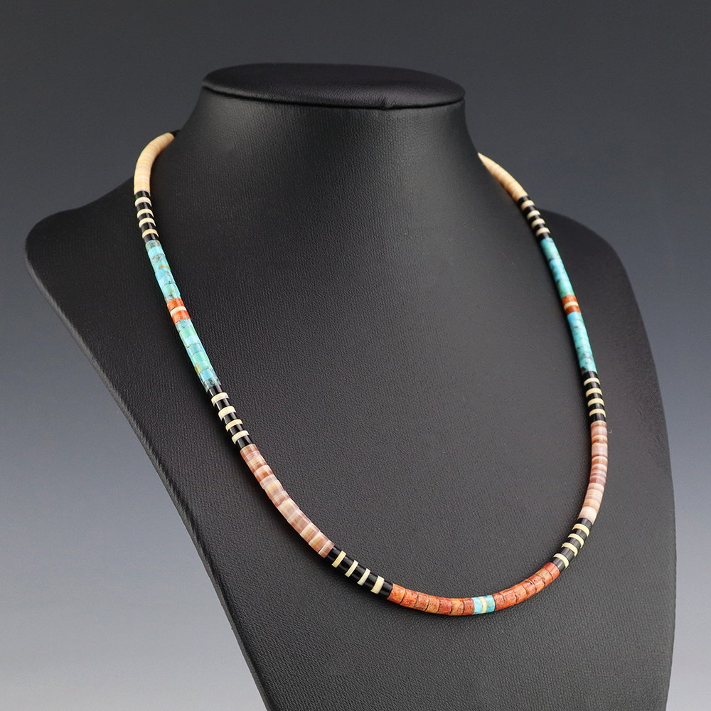 Kewa (Santo Domingo) artists are known for their heishi. The word “heishi“ means “shell” in the Keresan language. Traditionally Santo Domingo jewelry makers created their heishi jewelry out of shell. The shell is hand cut into a flat disc. Today, other stones that Santo Domingo artists cut in this manner, are also referred to as heishi. With modern tools and innovations, artists can create different styles of beads and use different gemstones like turquoise, coral, jet, serpentine, and spiny oyster.