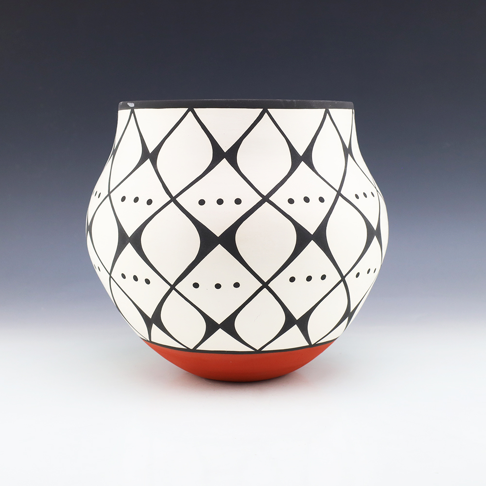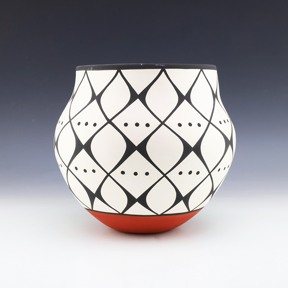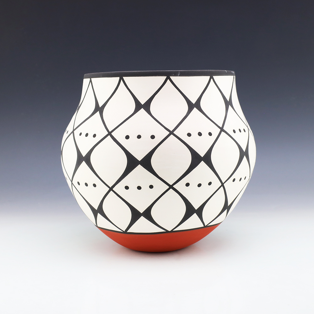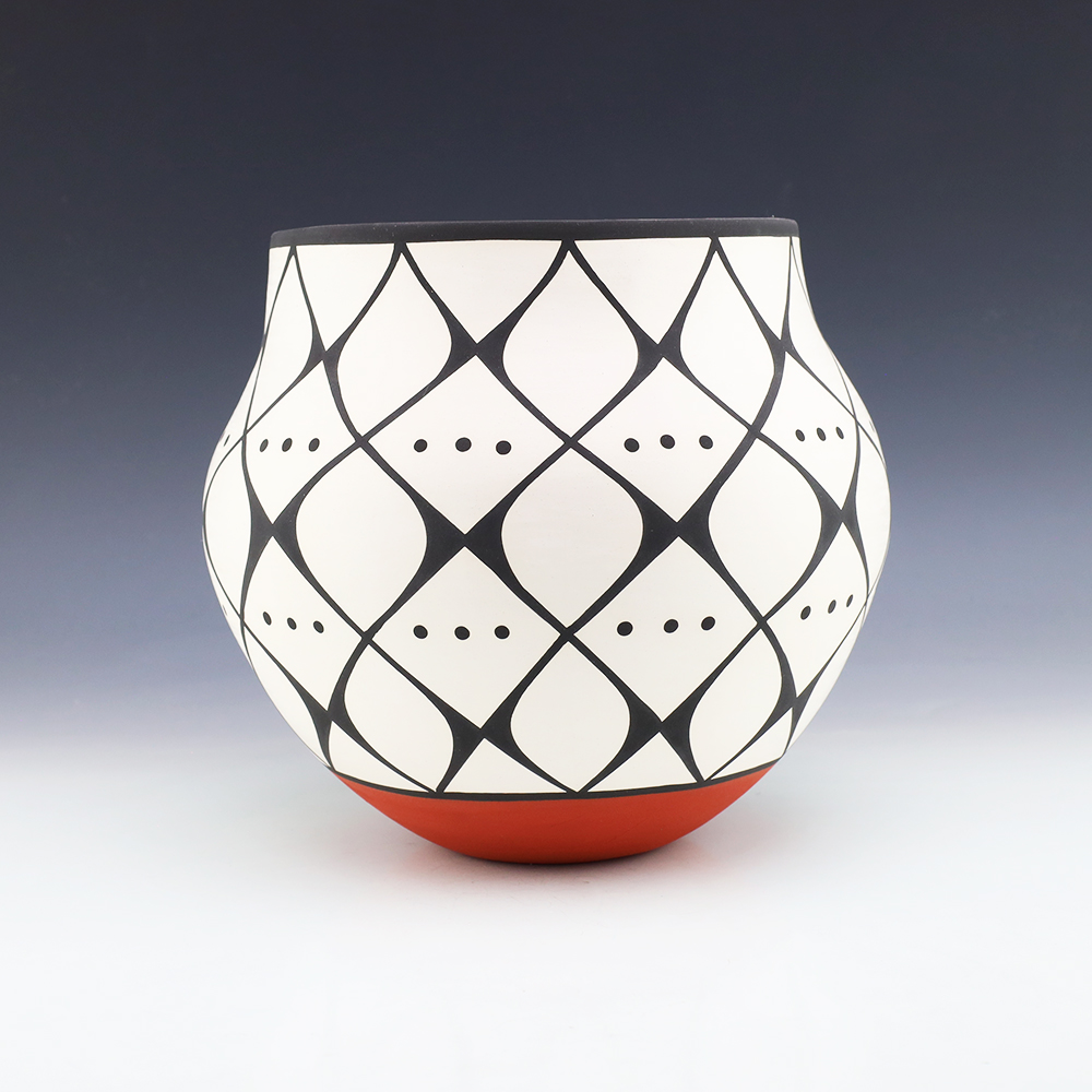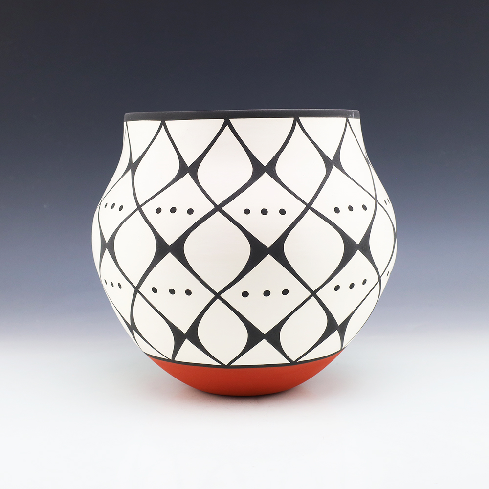 Kewa potter Robert Tenorio is known for his polychrome pots created in the traditional Santo Domingo style, which typically features a red base and red interior and black designs painted on a buff background. This exquisite vase is created in this manner. Robert was born in 1950 into the Santo...