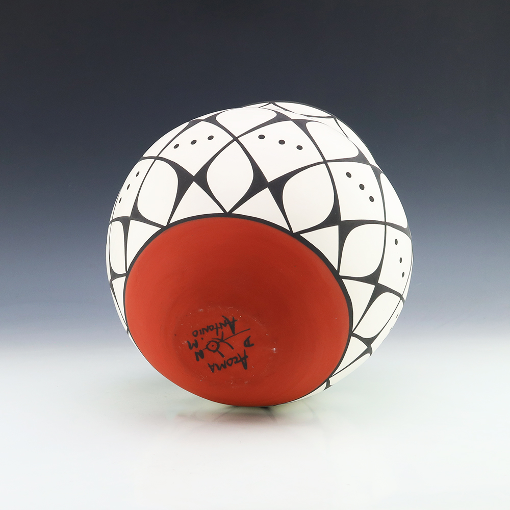 Brilliantly constructed by hand from natural clay, the pot is covered in intricate designs. Acoma potter David Antonio created this lovely olla. David was born in 1961 to David Sr. and Hilda Antonio of the Acoma Pueblo. He was taught by his grandmother, Mary L. Antonio. A unique addition to any pottery or Native American art collection. Signed