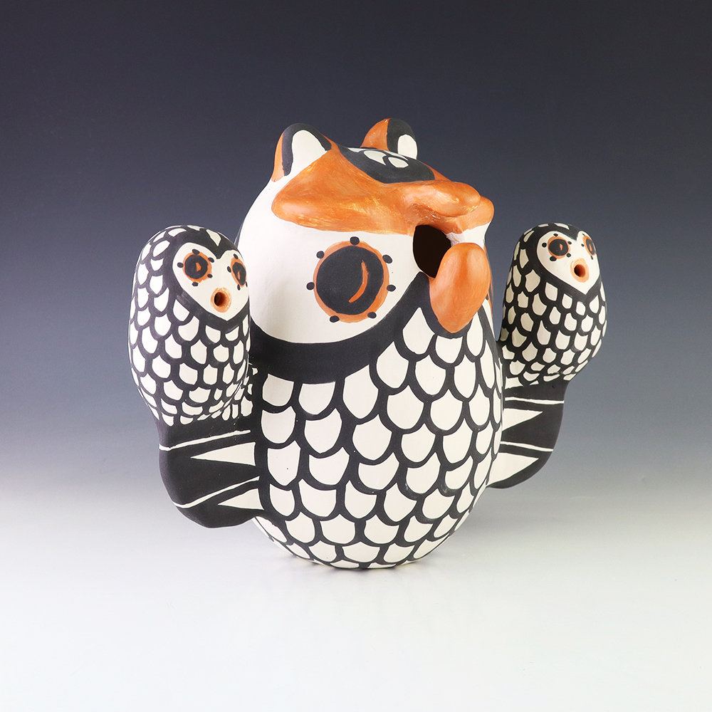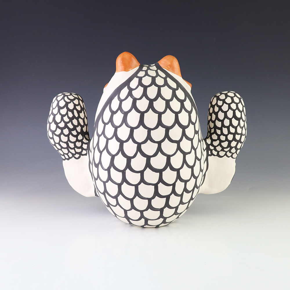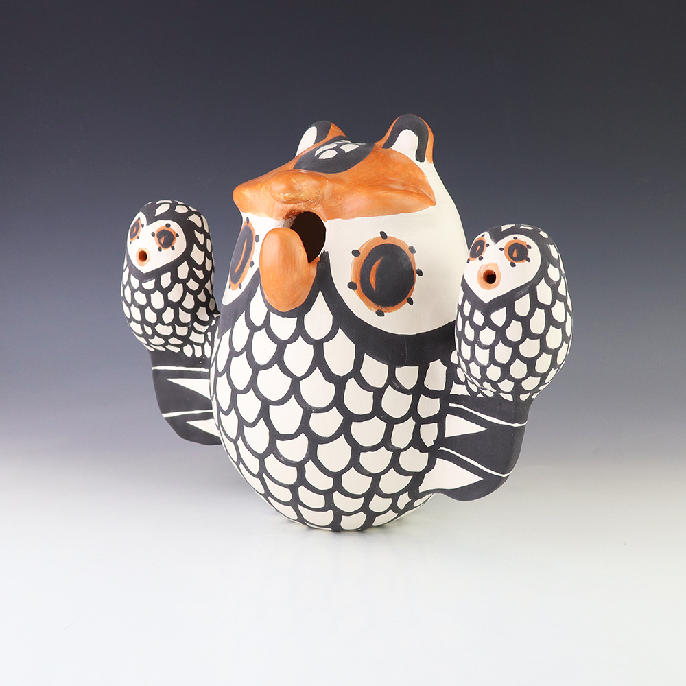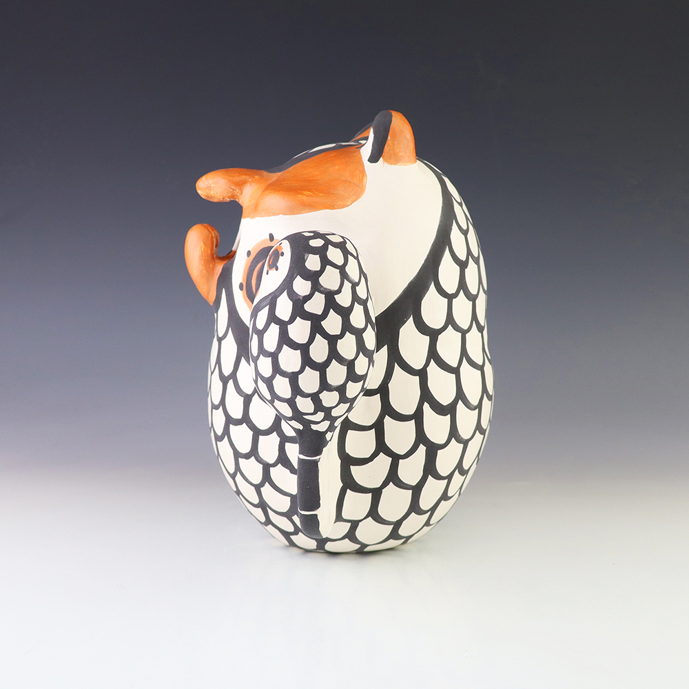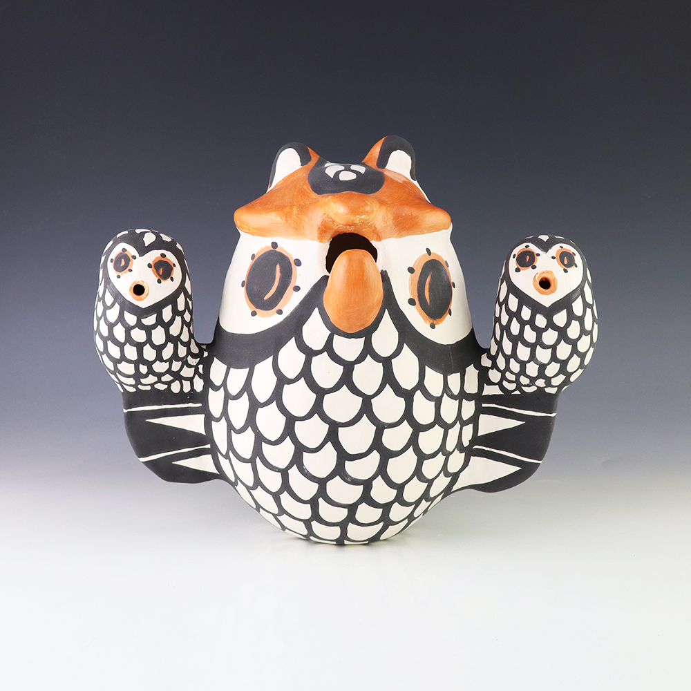 Brilliantly constructed by hand from natural clay, the owl is covered in intricate polychrome designs. Hand made by Acoma artist Mary Antonio. A unique addition to any pottery or Native American art collection. Signed