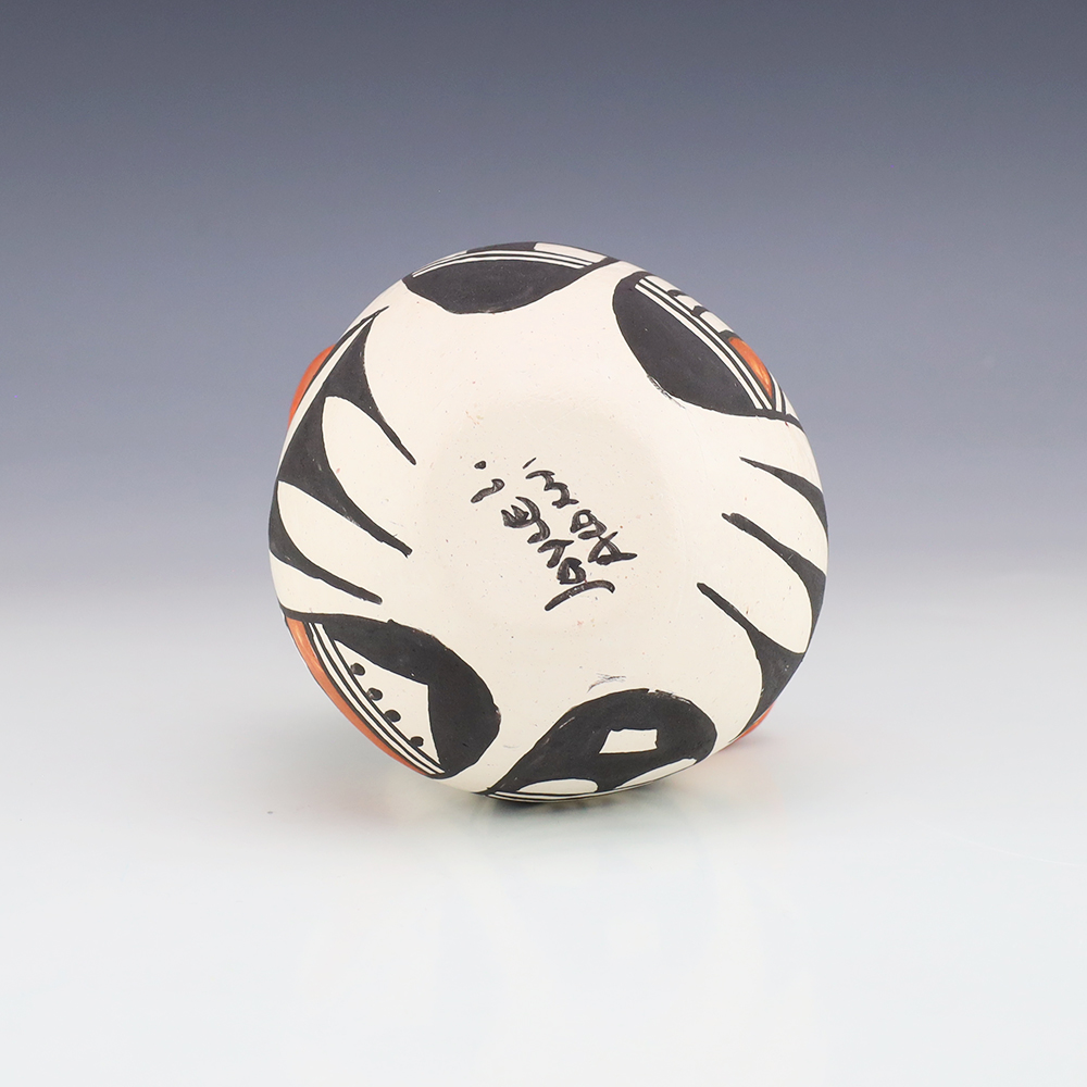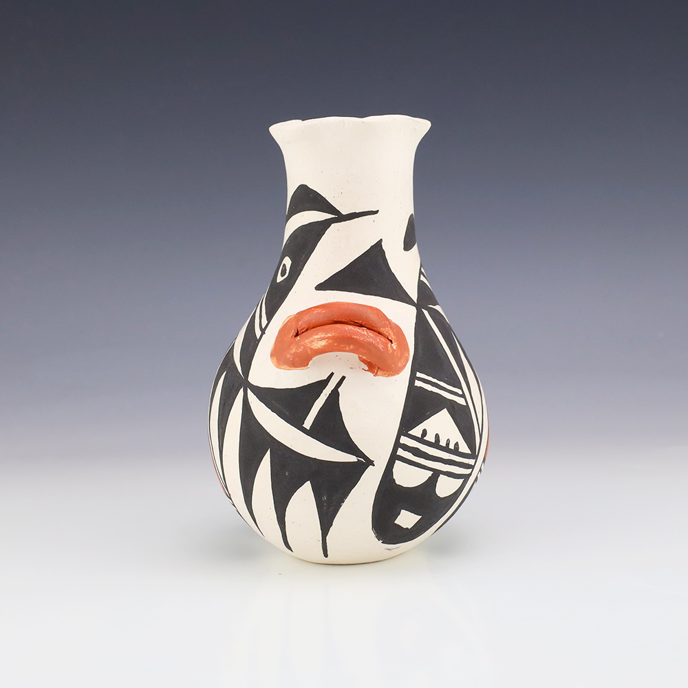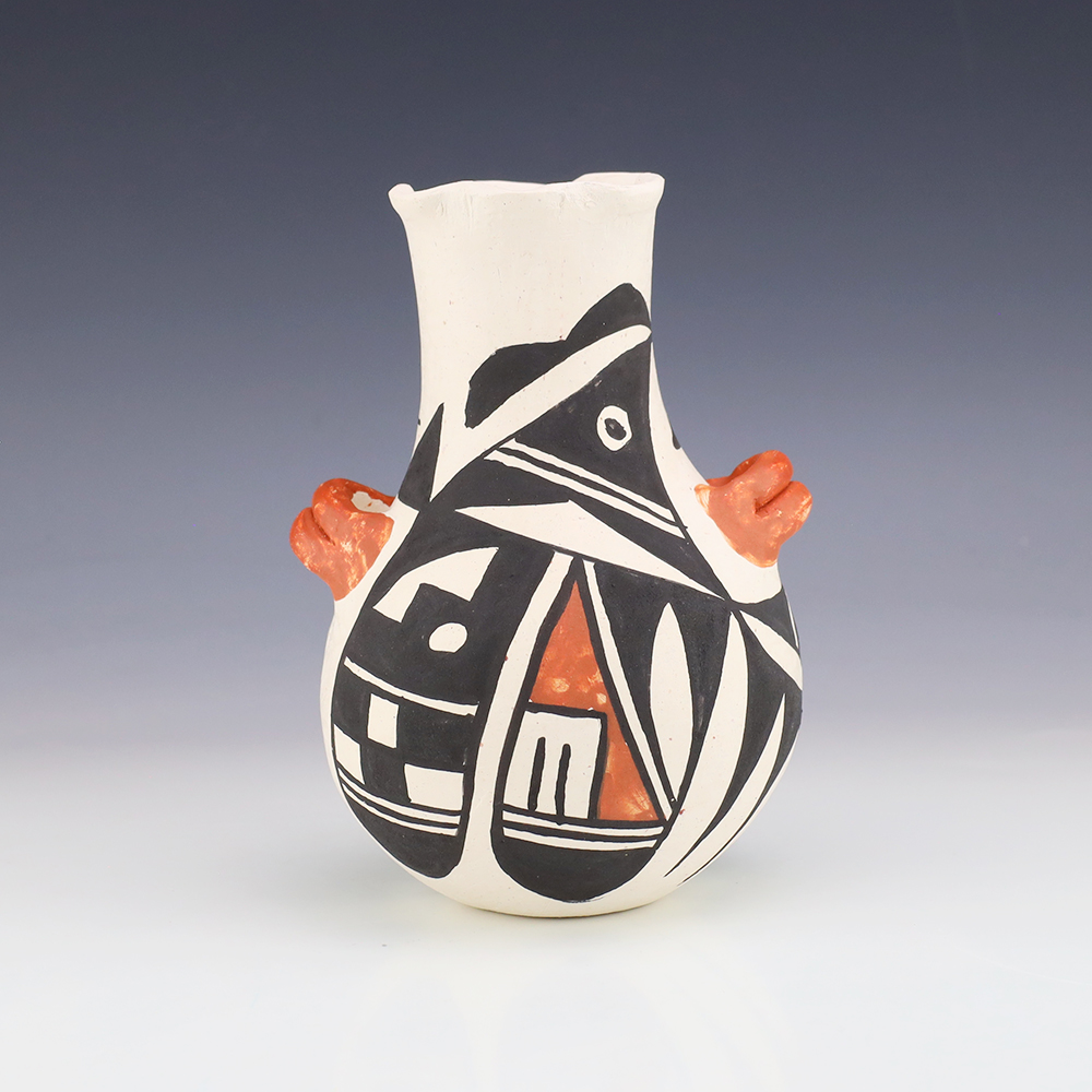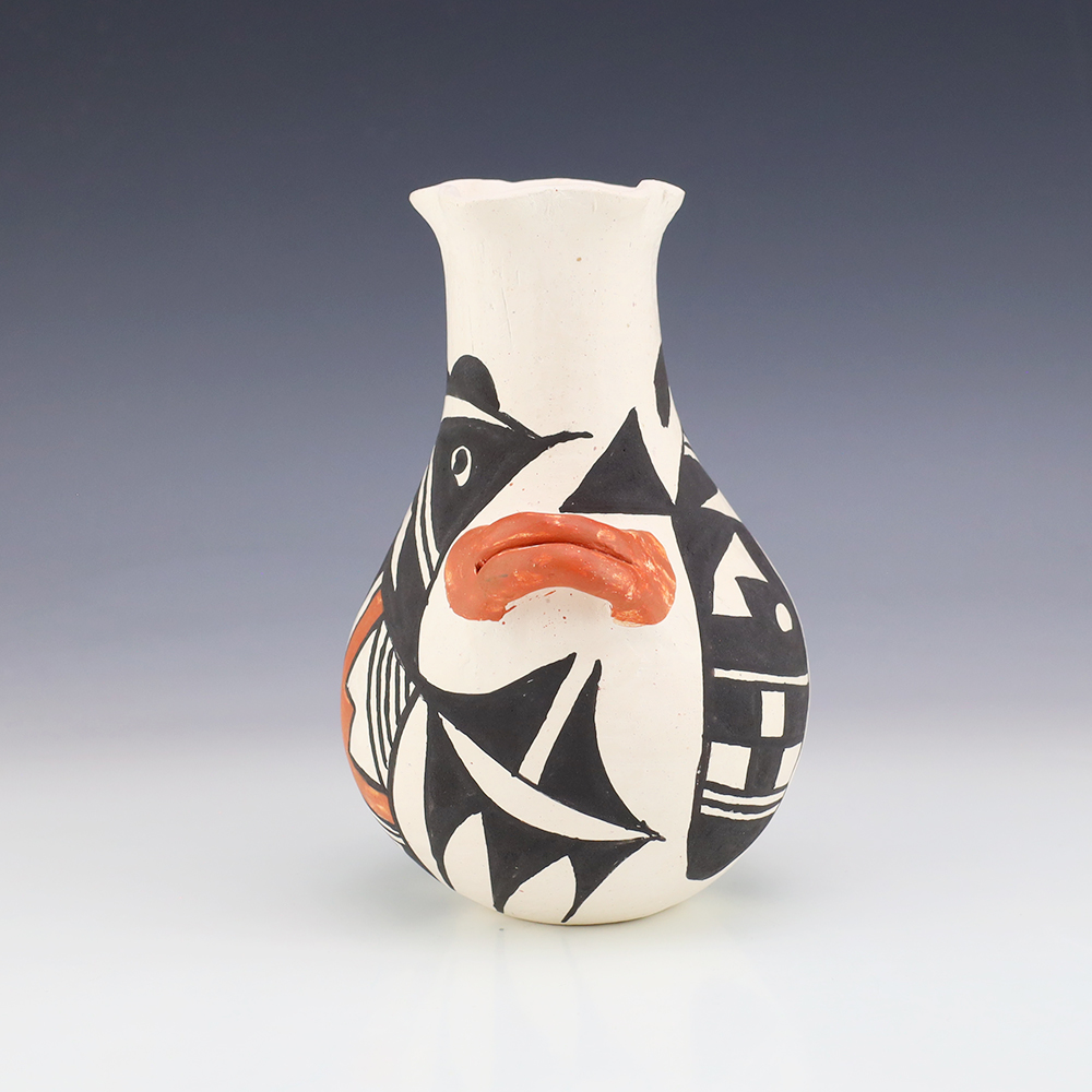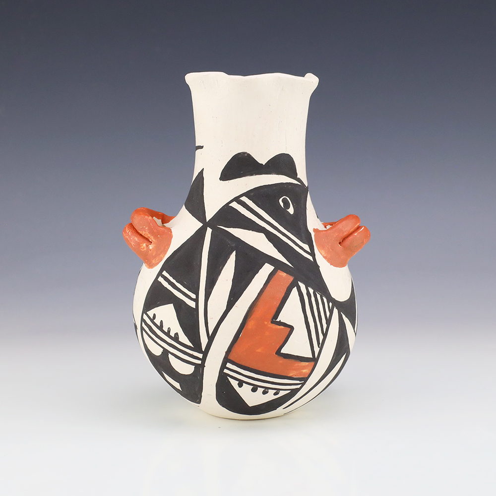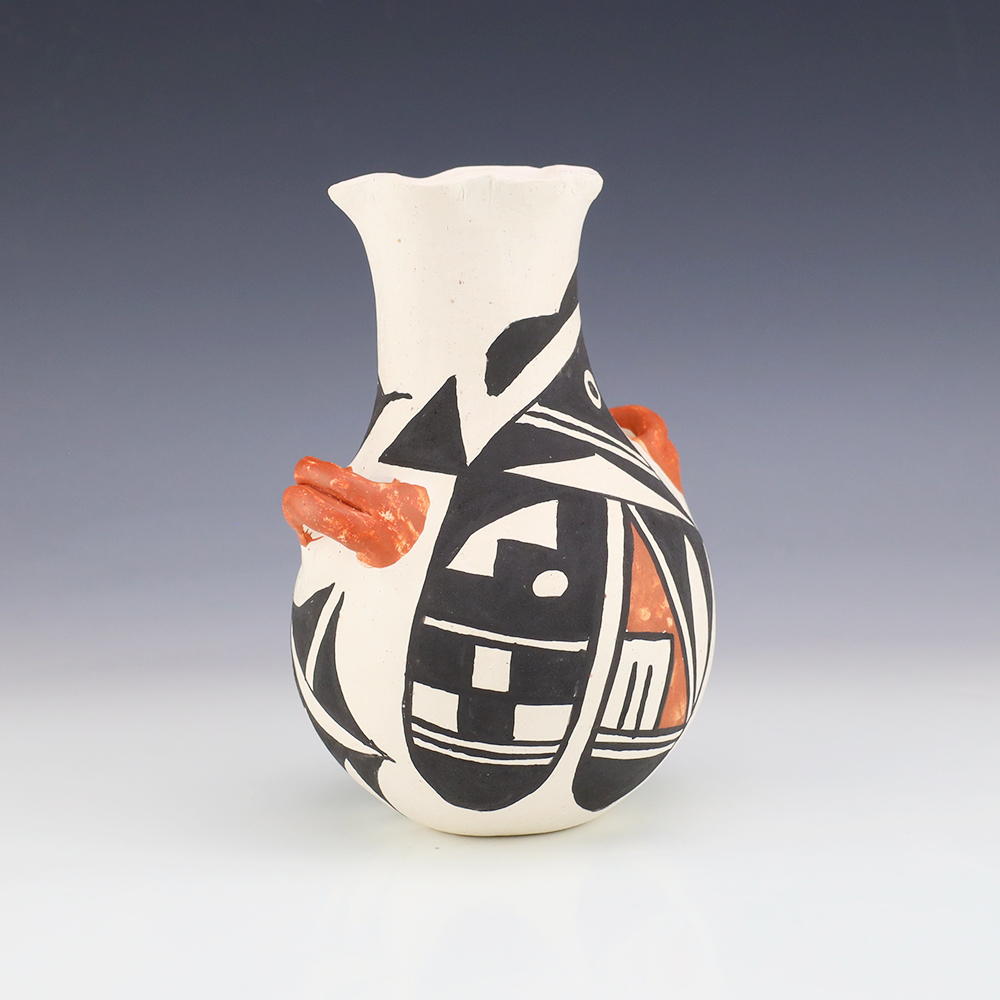 This handmade vase from Acoma potter Joyce Leno showcases the vibrant personality of her work. Created through traditional methods, the vase was entirely made by hand, from the gathering of clay to painting and firing. Joyce was born into the Acoma Pueblo in 1952. She is the daughter of Tom and Juana Leno, and she has been creating pottery since 1959. A wonderful addition to any pottery or Native American art collection. Signed