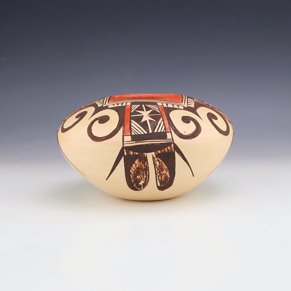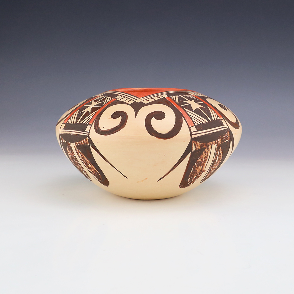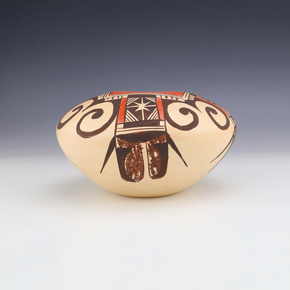 The Hopi pueblos are located in Northern Arizona, atop three large mesas. On First Mesa there is a long tradition of pottery making, that was ultimately shaped by the master potter Nampeyo at the turn of the 20th century. Nampeyo is credited with the revival of a prehistoric Hopi pottery type named Sikyatki, after an archaeological site near First Mesa. In addition to the distinct designs that Nampeyo revived, Hopi pottery is also known for it wonderful blushes. The blushes are created by a combination of the natural iron rich clay and the pit firing technique. It is the tonal yellow to dark orange surface of Hopi pottery that distinguishes it from the other Pueblos.