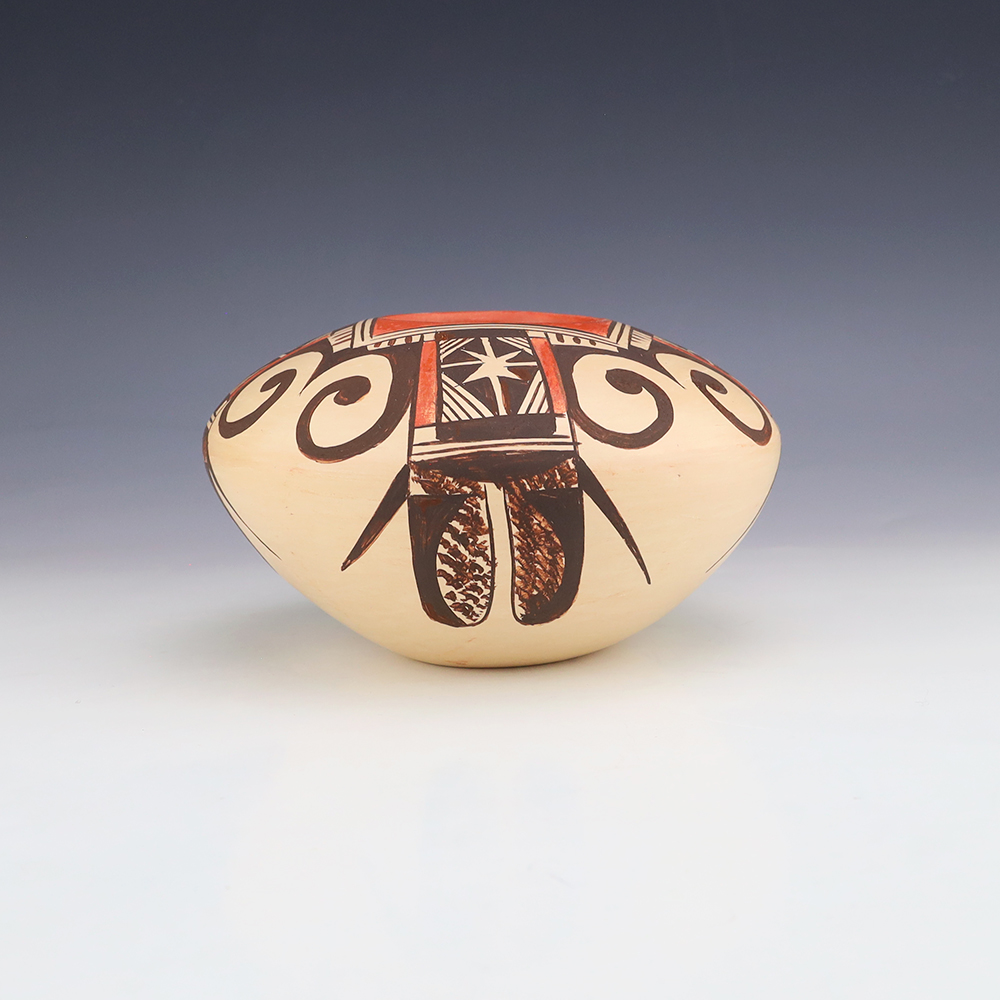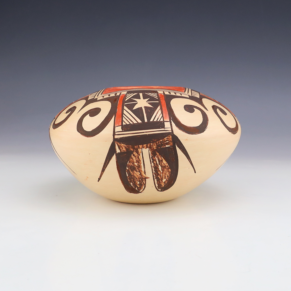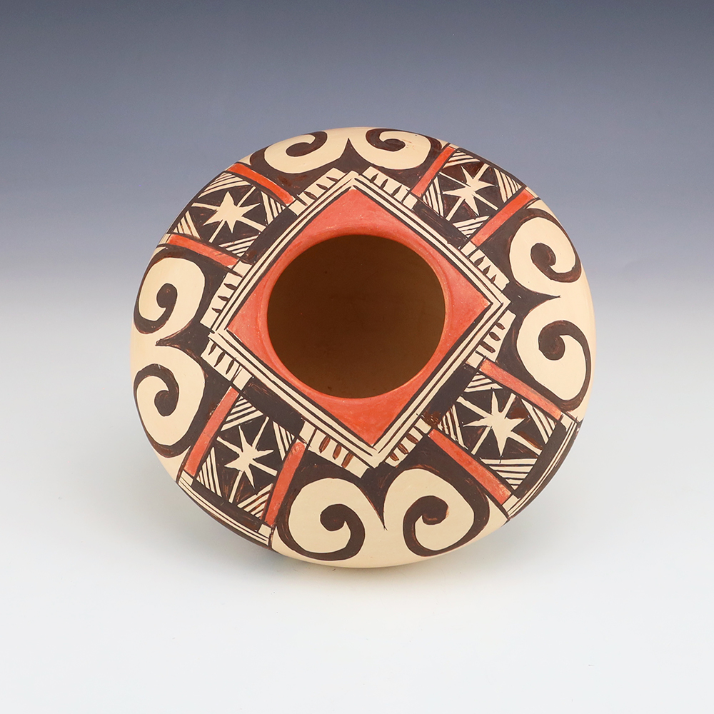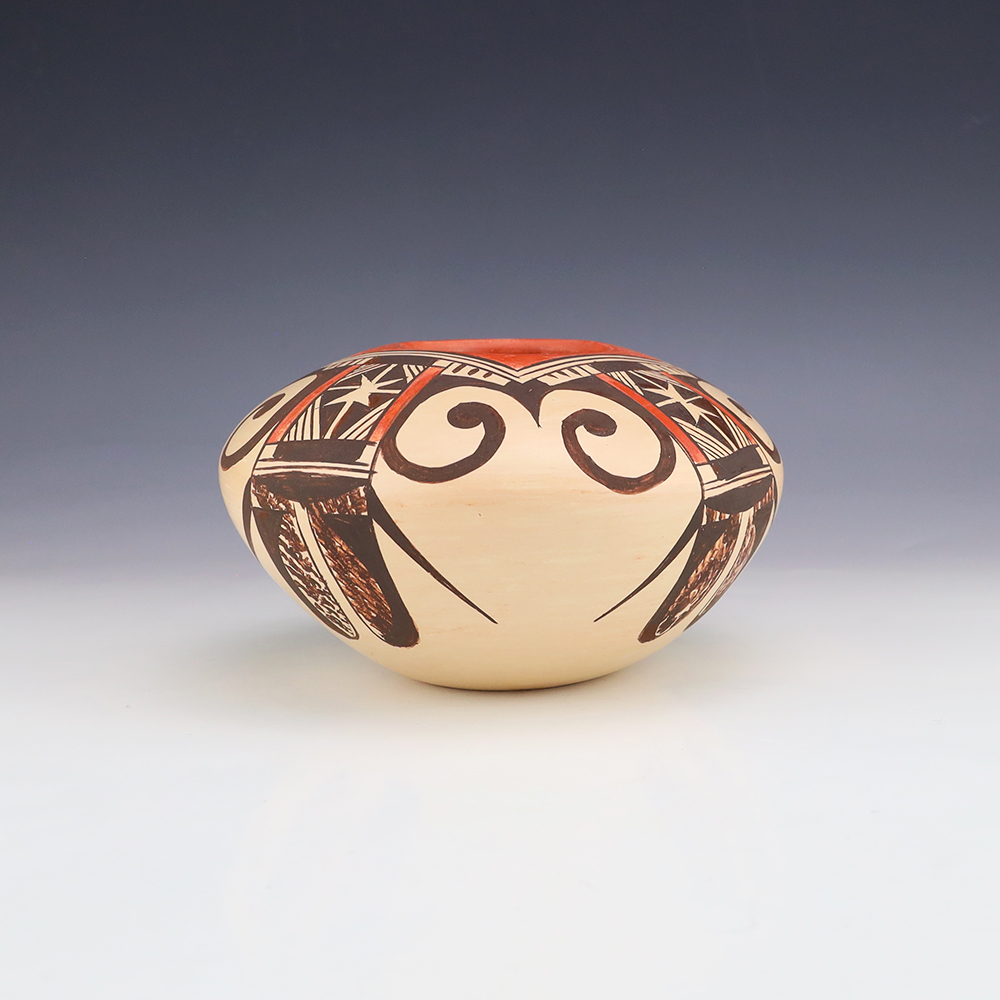 The Hopi pueblos are located in Northern Arizona, atop three large mesas. On First Mesa there is a long tradition of pottery making, that was ultimately shaped by the master potter Nampeyo at the turn of the 20th century. Nampeyo is credited with the revival of a prehistoric Hopi pottery type named Sikyatki, after an archaeological site near First Mesa. In addition to the distinct designs that Nampeyo revived, Hopi pottery is also known for it wonderful blushes. The blushes are created by a combination of the natural iron rich clay and the pit firing technique. It is the tonal yellow to dark orange surface of Hopi pottery that distinguishes it from the other Pueblos.