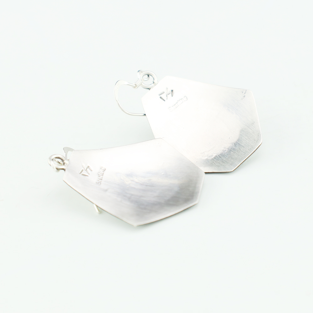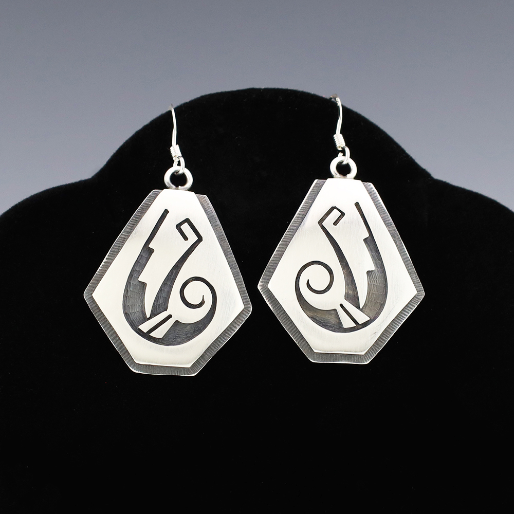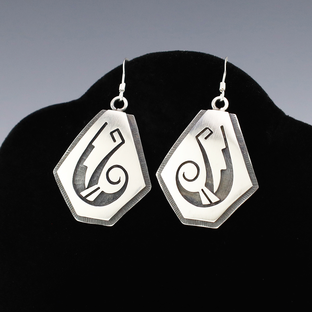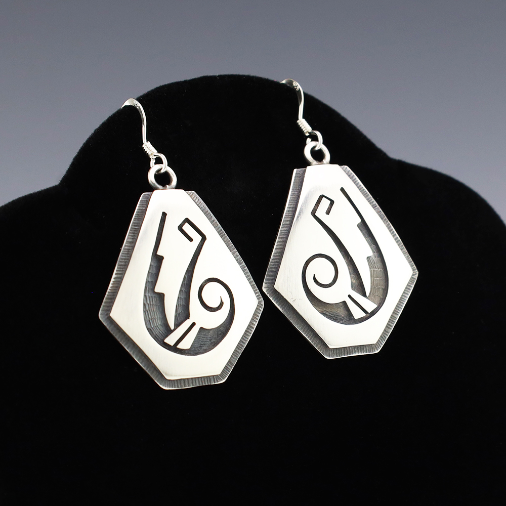 Hopi artist, Darren Seweyestewa created these wonderful earrings through the overlay technique. Hopi overlay is constructed from two layers of sterling silver. A design is cut out with a jeweler’s saw by hand. This top design layer is then silver soldered to another sheet, the bottom layer, of silver. Texturing is added to the bottom layer in all the open areas of the design using a hammer and a small punch. The piece is then formed to its final shape and size. The bottom layer is then oxidized to enhance the design. A unique addition of high-quality craftsmanship to your jewelry wardrobe. Weighs 10 grams. Signed