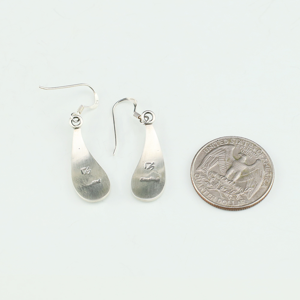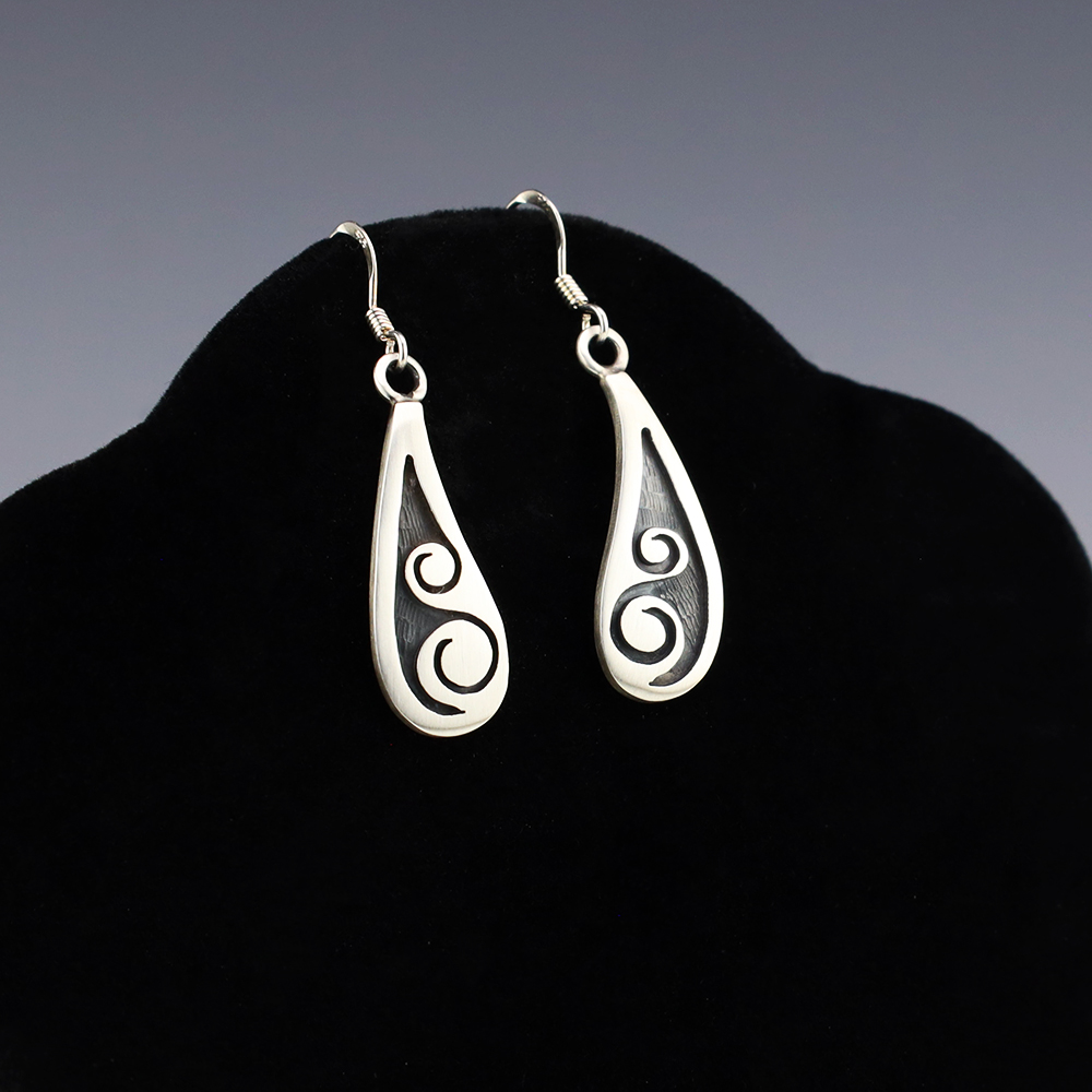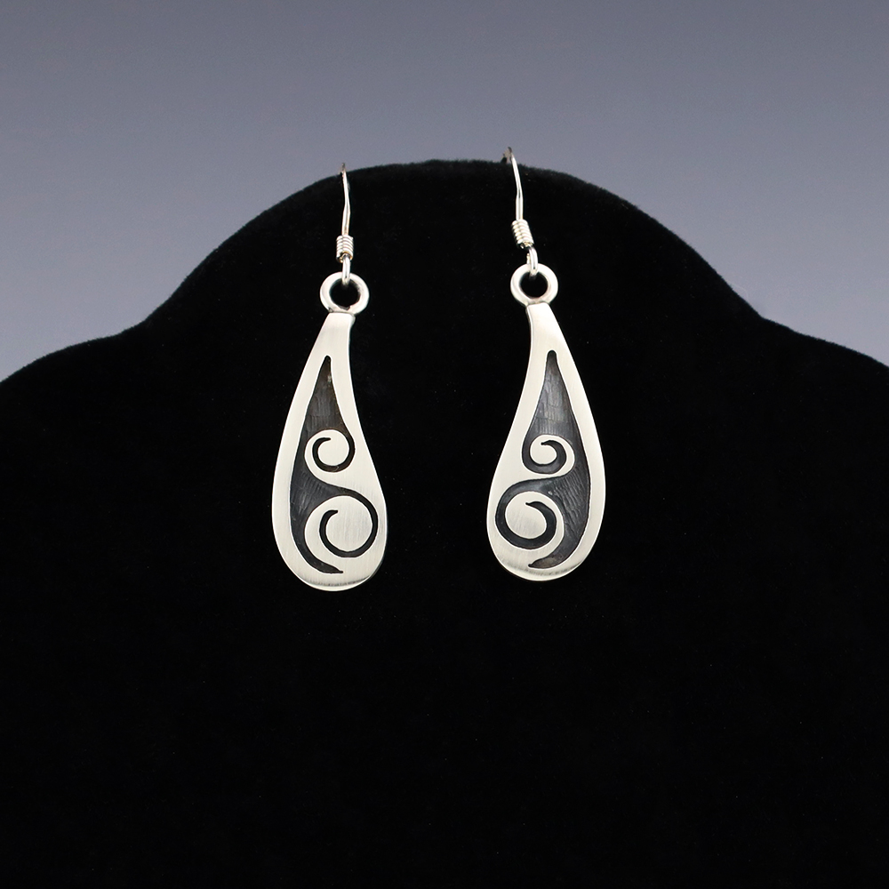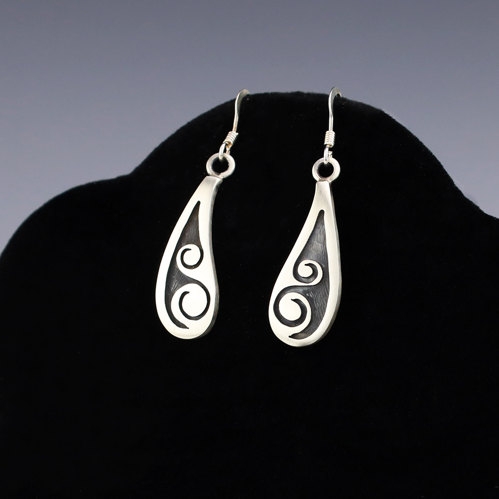 Hopi artist, Darren Seweyestewa created these fabulous earrings through the overlay technique. Hopi overlay is constructed from two layers of sterling silver. A design is cut out with a jeweler’s saw by hand. This top design layer is then silver soldered to another sheet, the bottom layer, of silver. Texturing is added to the bottom layer in all the open areas of the design using a hammer and a small punch. The piece is then formed to its final shape and size. The bottom layer is then oxidized to enhance the design. A unique addition of high-quality craftsmanship to your jewelry wardrobe. Weighs 6 grams. Signed