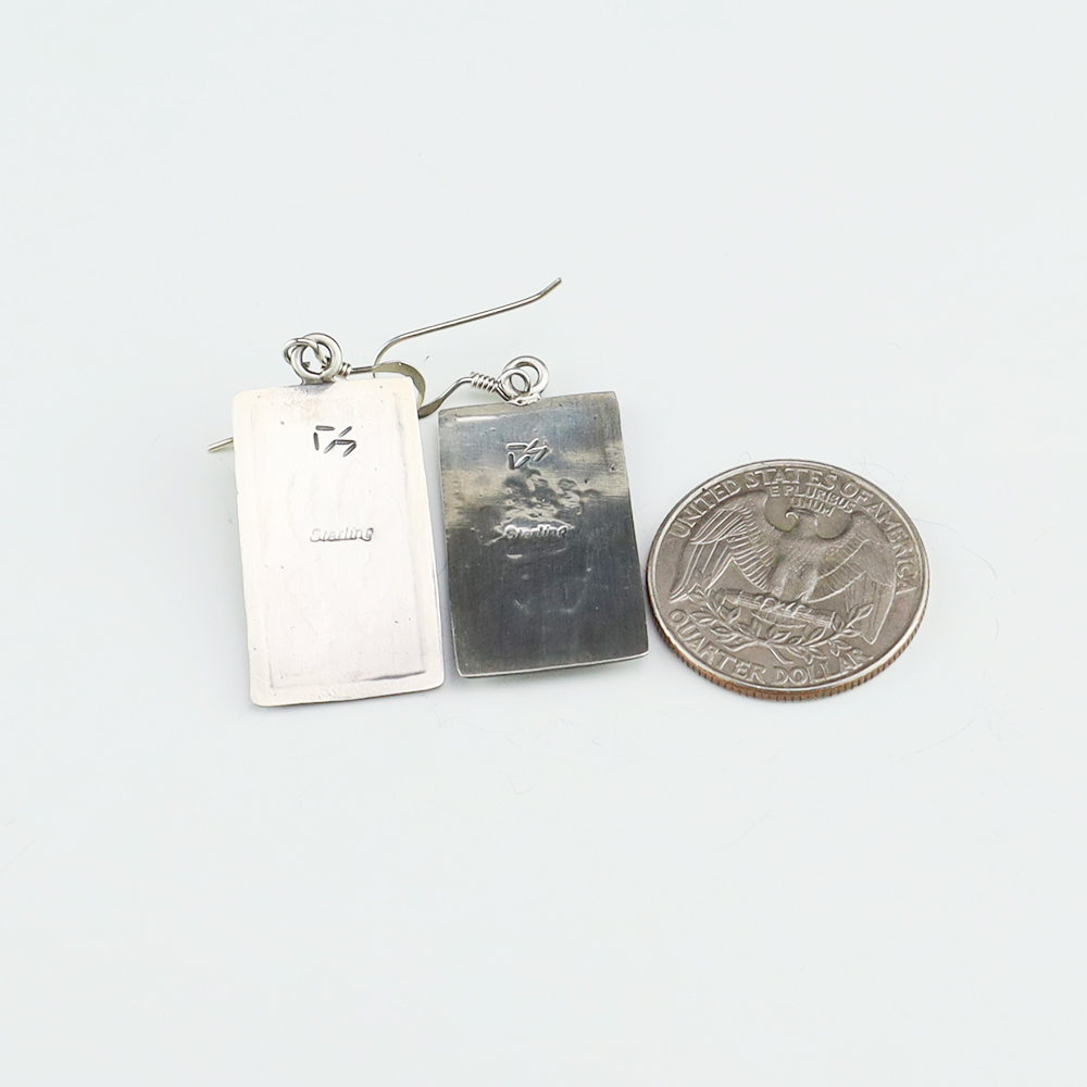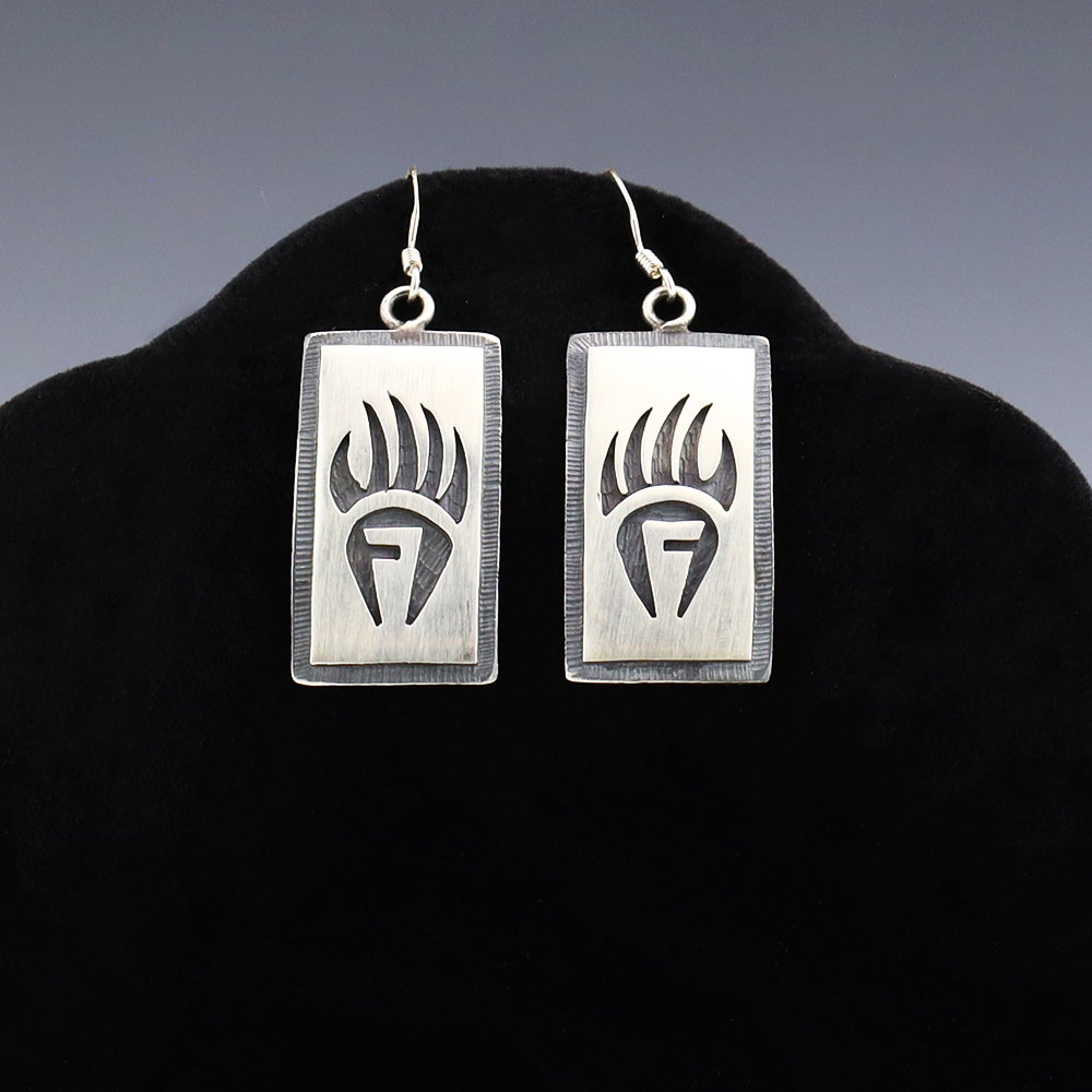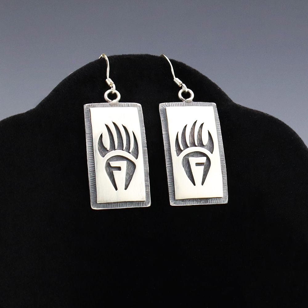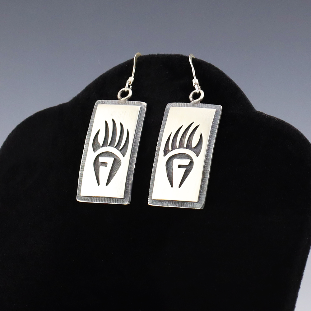 Hopi artist, Darren Seweyestewa created these fabulous earrings through the overlay technique. Hopi overlay is constructed from two layers of sterling silver. A design is cut out with a jeweler’s saw by hand. This top design layer is then silver soldered to another sheet, the bottom layer, of silver. Texturing is added to the bottom layer in all the open areas of the design using a hammer and a small punch. The piece is then formed to its final shape and size. The bottom layer is then oxidized to enhance the design. A unique addition of high-quality craftsmanship to your jewelry wardrobe. Weighs 8 grams. Signed