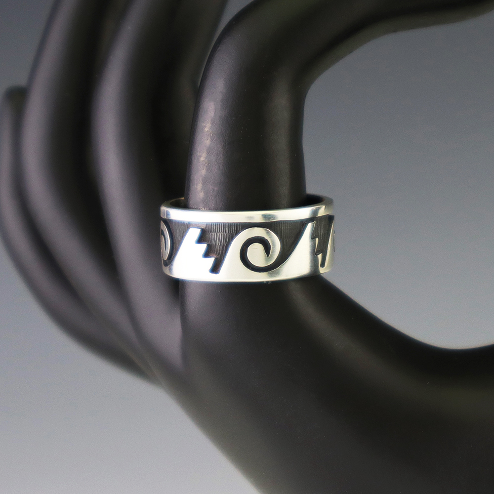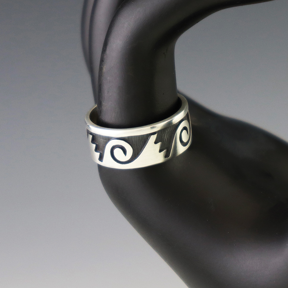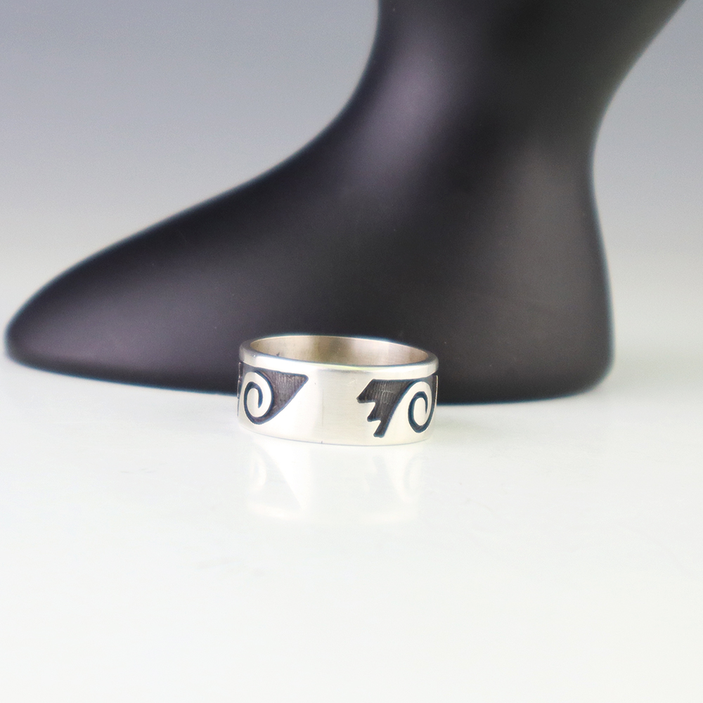 Hopi artist Darren Seweyestewa created this wonderful ring through the overlay technique. Hopi overlay is constructed from two layers of sterling silver. A design is cut out with a jeweler’s saw by hand. This top design layer is then silver soldered to another sheet, the bottom layer, of silver. Texturing is added to the bottom layer in all the open areas of the design using a hammer and a small punch. The piece is then formed to its final shape and size. The bottom layer is then oxidized to enhance the design. A unique addition of high-quality craftsmanship to your jewelry wardrobe. Weighs 8 grams. Size 10. Signed