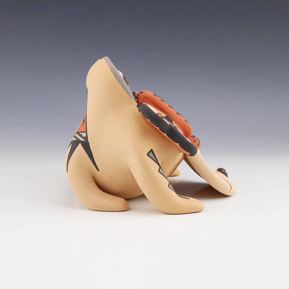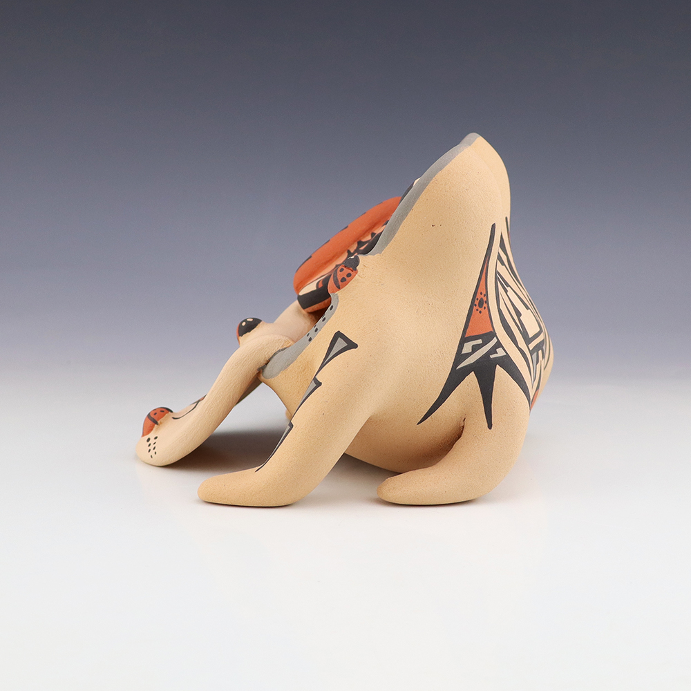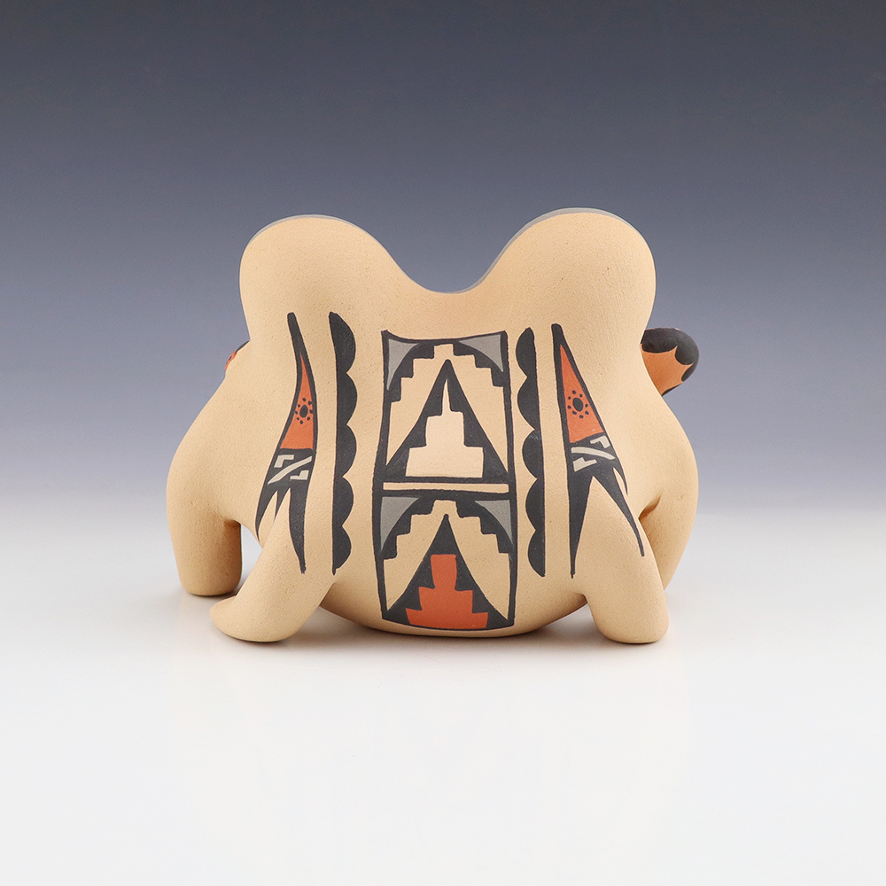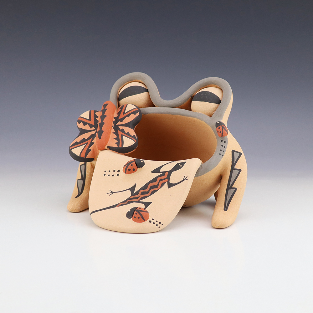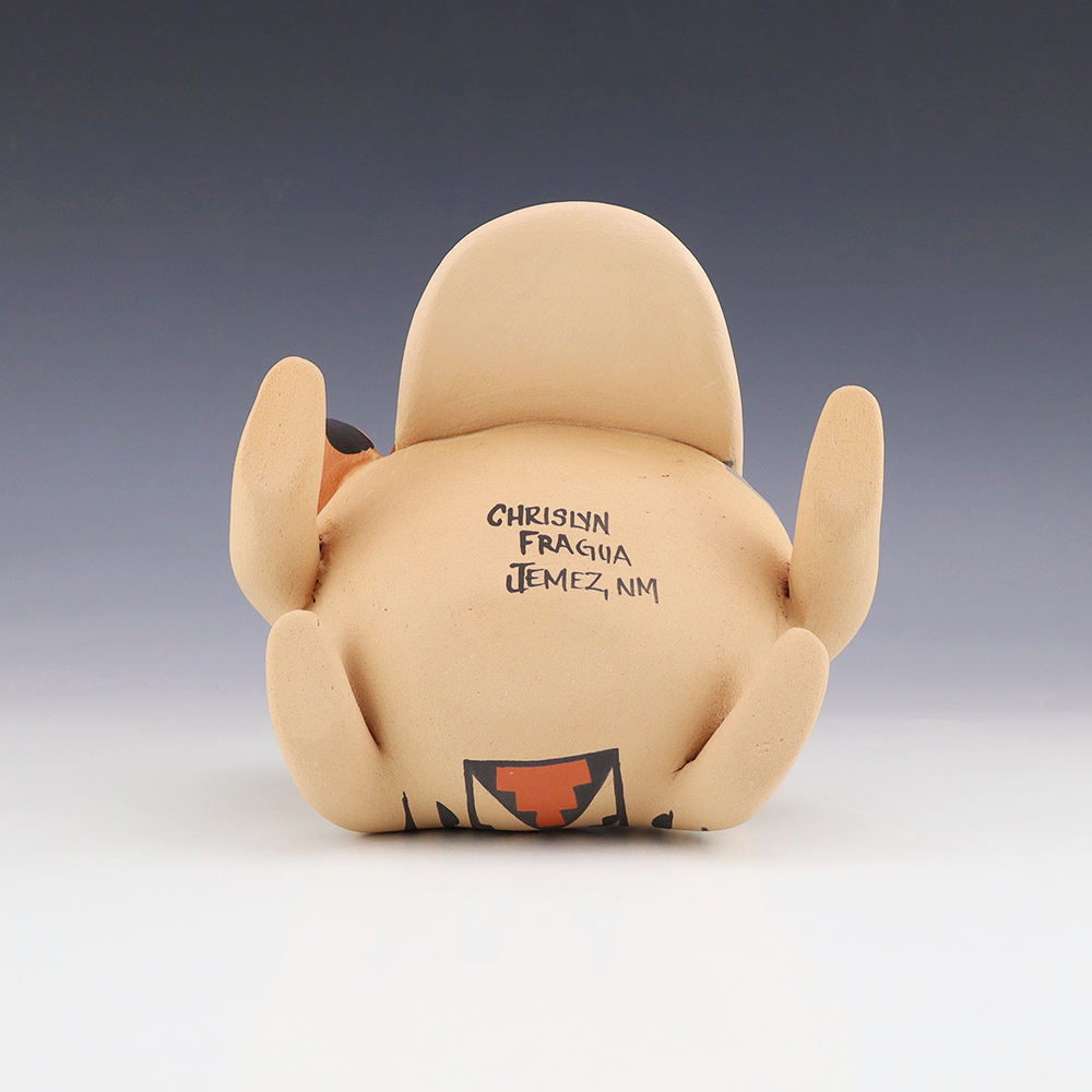 This wonderfully painted storyteller was handmade by Jemez Pueblo potter Chrislyn Fragua and depicts a frog adorned with ladybugs, a butterfly, and a lizard. Chrislyn uses both the coil method and pinch method to create her pottery piece and as in traditional storytellers, Chrislyn’s storytellers have their mouths open. Storytellers represent the passing down of stories orally through Pueblo tradition. Signed