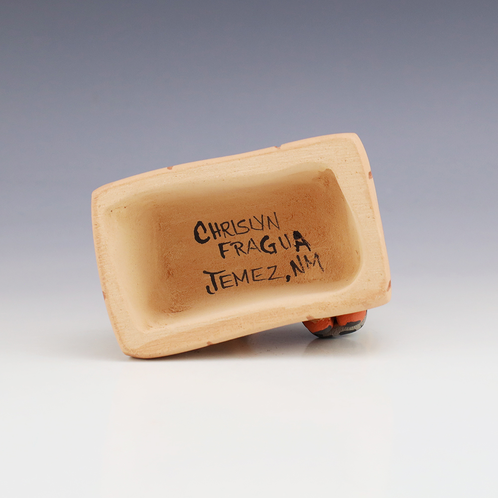 Jemez Pueblo potter Chrislyn Fragua made these wonderful pottery Koshares. Chrislyn uses both the coil method and pinch method to create her pottery piece and as in traditional storytellers, Chrislyn’s storytellers have their mouths open. Storytellers represent the passing down of stories orally through Pueblo tradition. Signed
