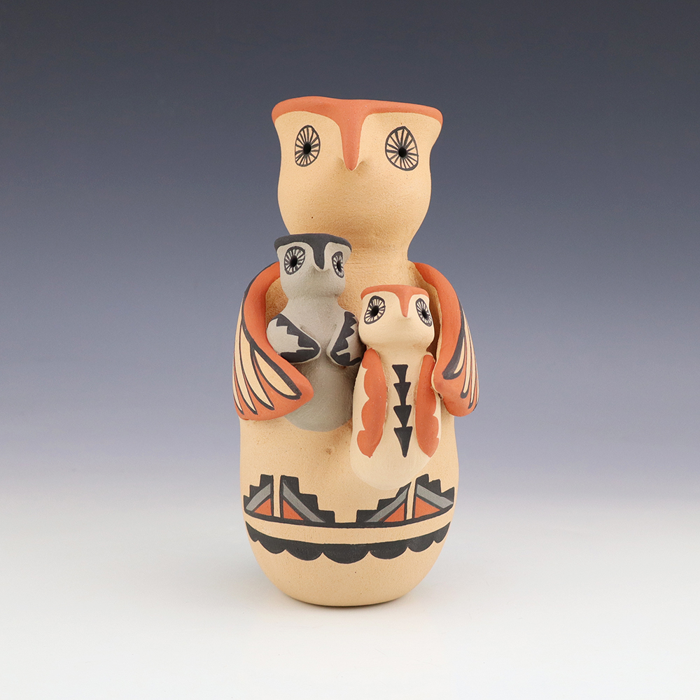 Within the Jemez Pueblo there are many exceptional potters. The work is generally characterized by the buff and red clays used, and the range of styles and subjects.  Storyteller, figures, sgrafitto designs, wedding vases, and melon pots are a few of their favorites. Before the arrival of the Spanish, Jemez was known for its traditional black-on-white ware, but production of this type of pottery died out in the early 18th century. There was a revival of Jemez pottery-making in the early 20th century inspired and influenced by Zia pottery designs, but it was not until the 1960’s and 70’s that a significant number of Jemez potters began producing high-quality work using traditional methods.