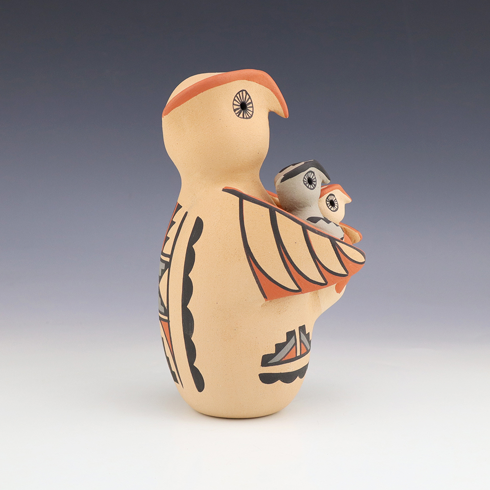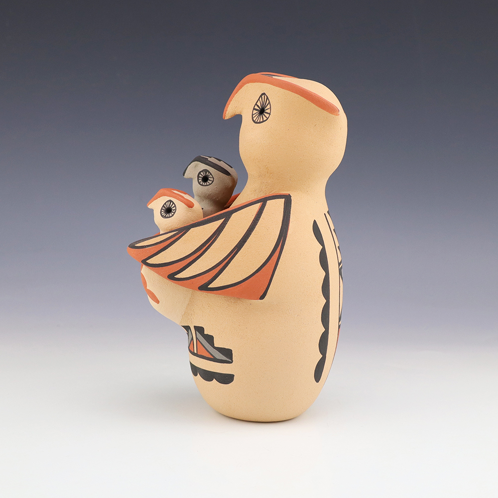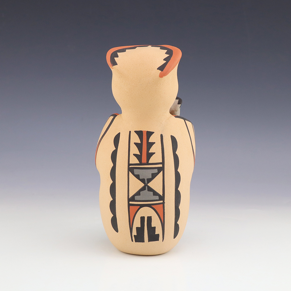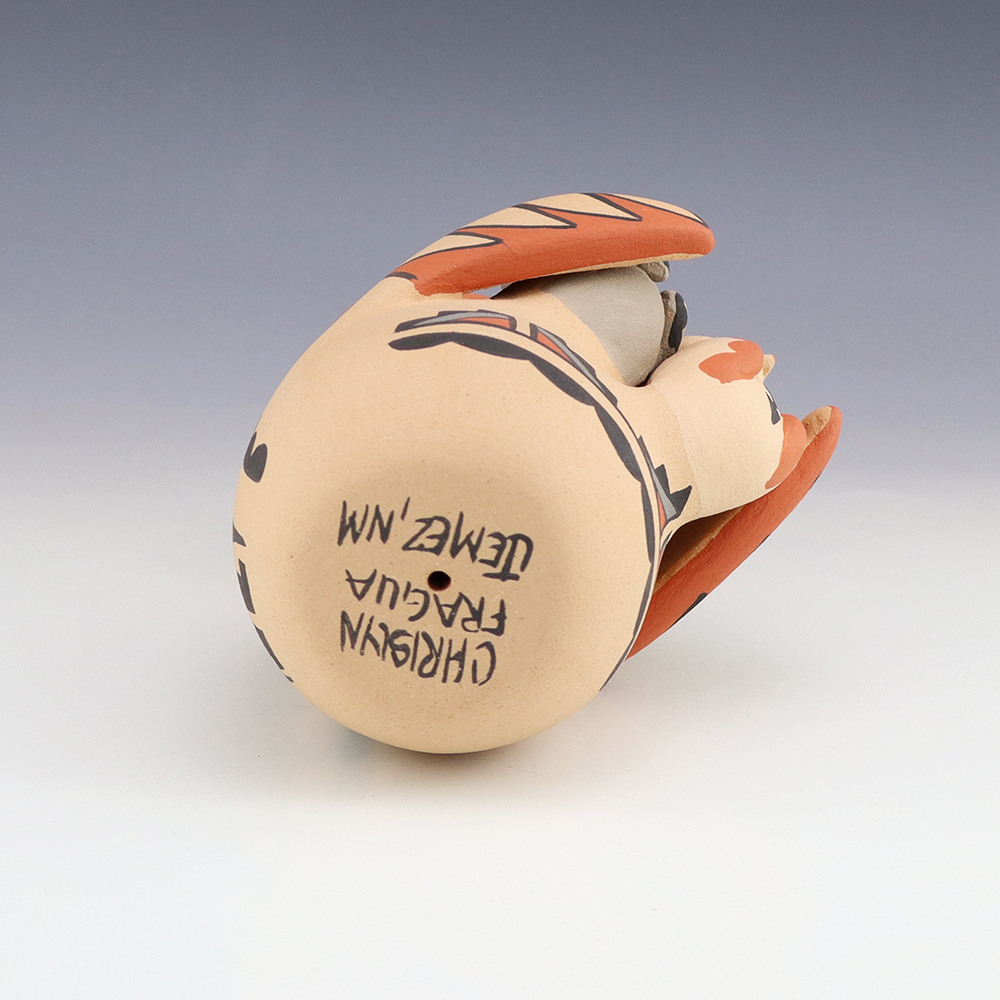 This wonderfully painted storyteller was handmade by Jemez Pueblo potter Chrislyn Fragua and depicts a woman with a baby and a child with a basketball. Chrislyn uses both the coil method and pinch method to create her pottery piece and as in traditional storytellers, Chrislyn’s storytellers have their mouths open. ...