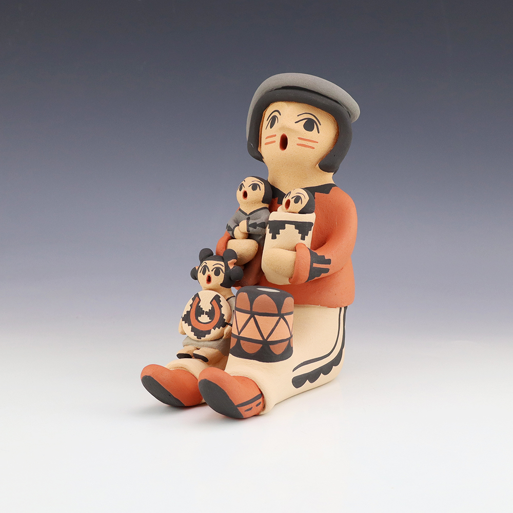 This wonderfully painted storyteller was handmade by Jemez Pueblo potter Chrislyn Fragua and depicts a woman with three children. Chrislyn uses both the coil method and pinch method to create her pottery piece and as in traditional storytellers, Chrislyn’s storytellers have their mouths open. Storytellers represent the passing down of...