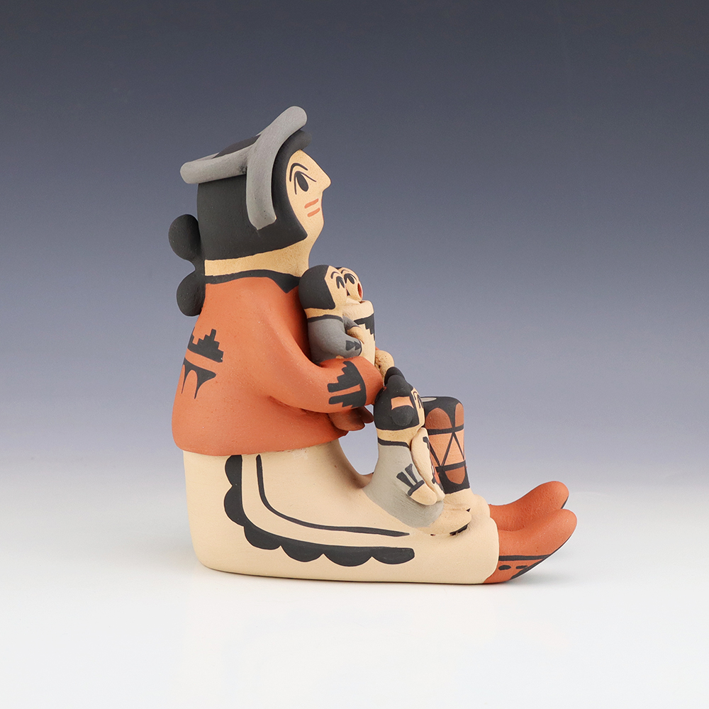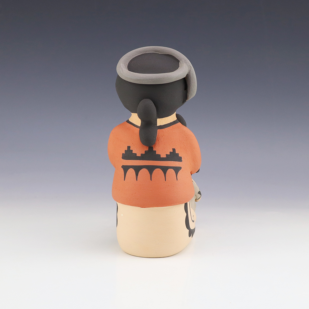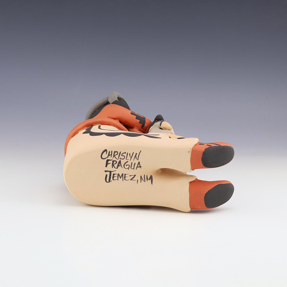 This wonderfully painted storyteller was handmade by Jemez Pueblo potter Chrislyn Fragua and depicts a woman with a baby and a child with a basketball. Chrislyn uses both the coil method and pinch method to create her pottery piece and as in traditional storytellers, Chrislyn’s storytellers have their mouths open. ...