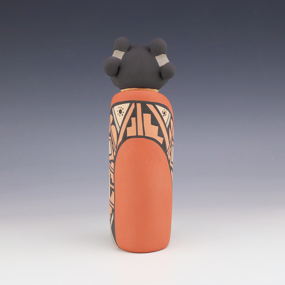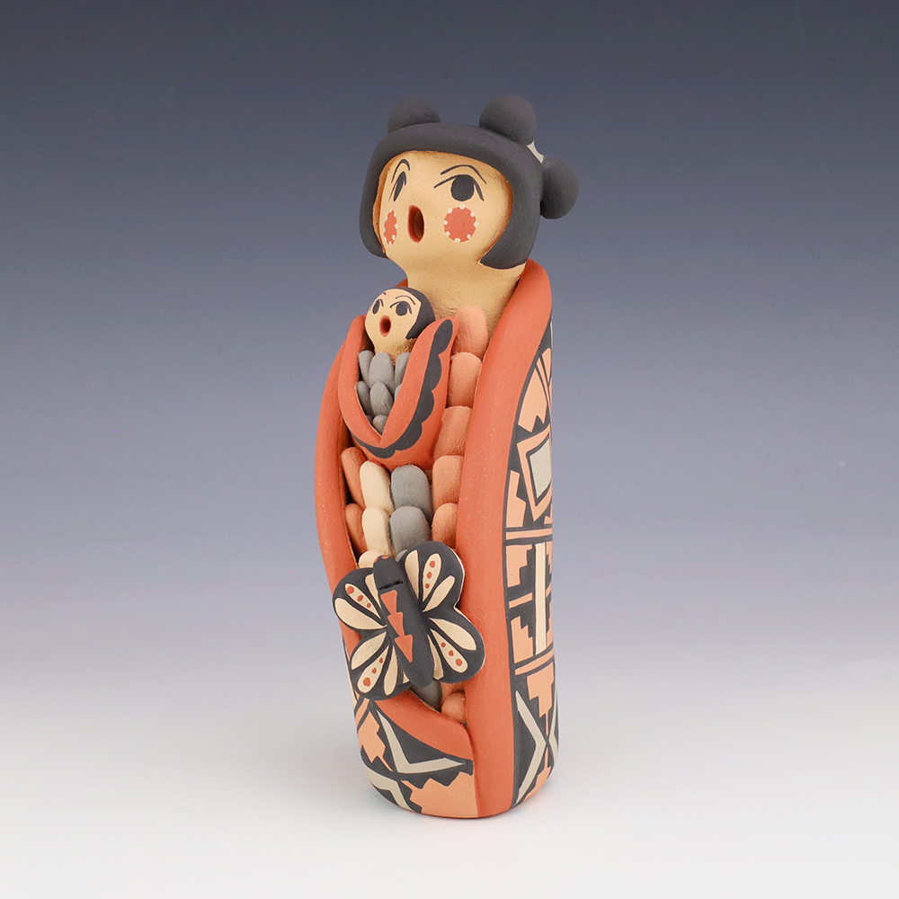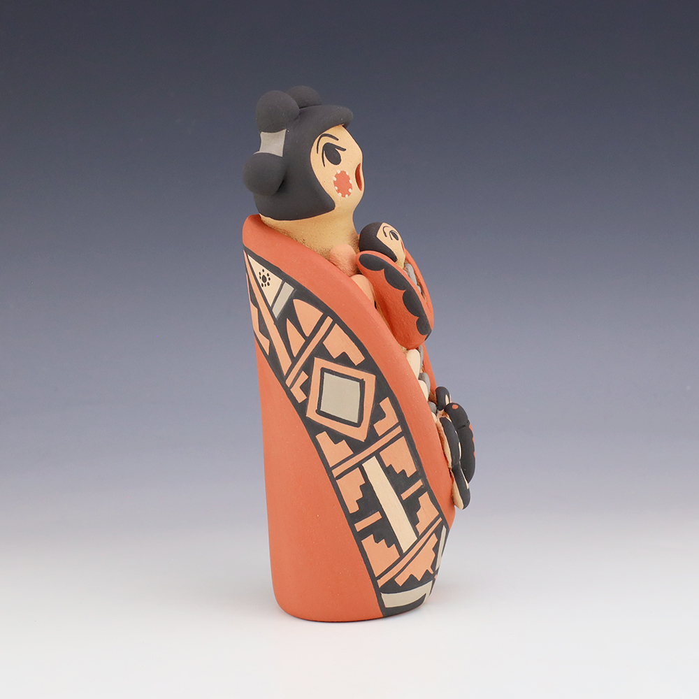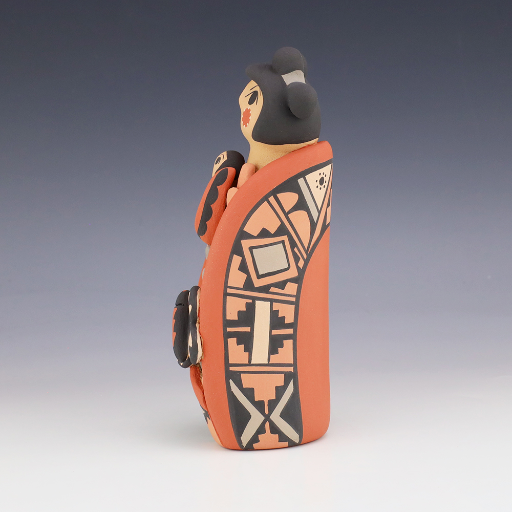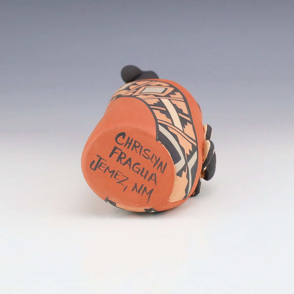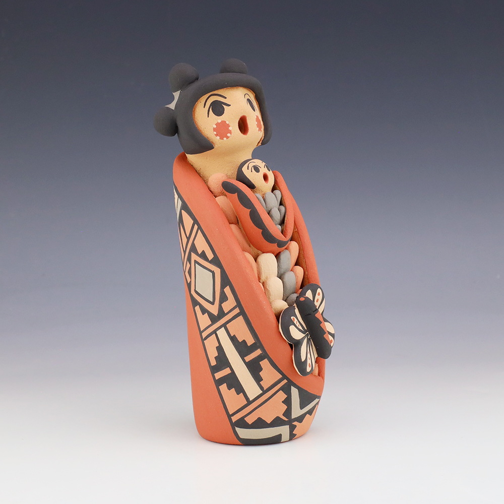 This wonderfully painted storyteller was handmade by Jemez Pueblo potter Chrislyn Fragua and depicts a woman holding a child and a baby. Chrislyn uses both the coil method and pinch method to create her pottery piece and as in traditional storytellers, Chrislyn’s storytellers have their mouths open. Storytellers represent the...