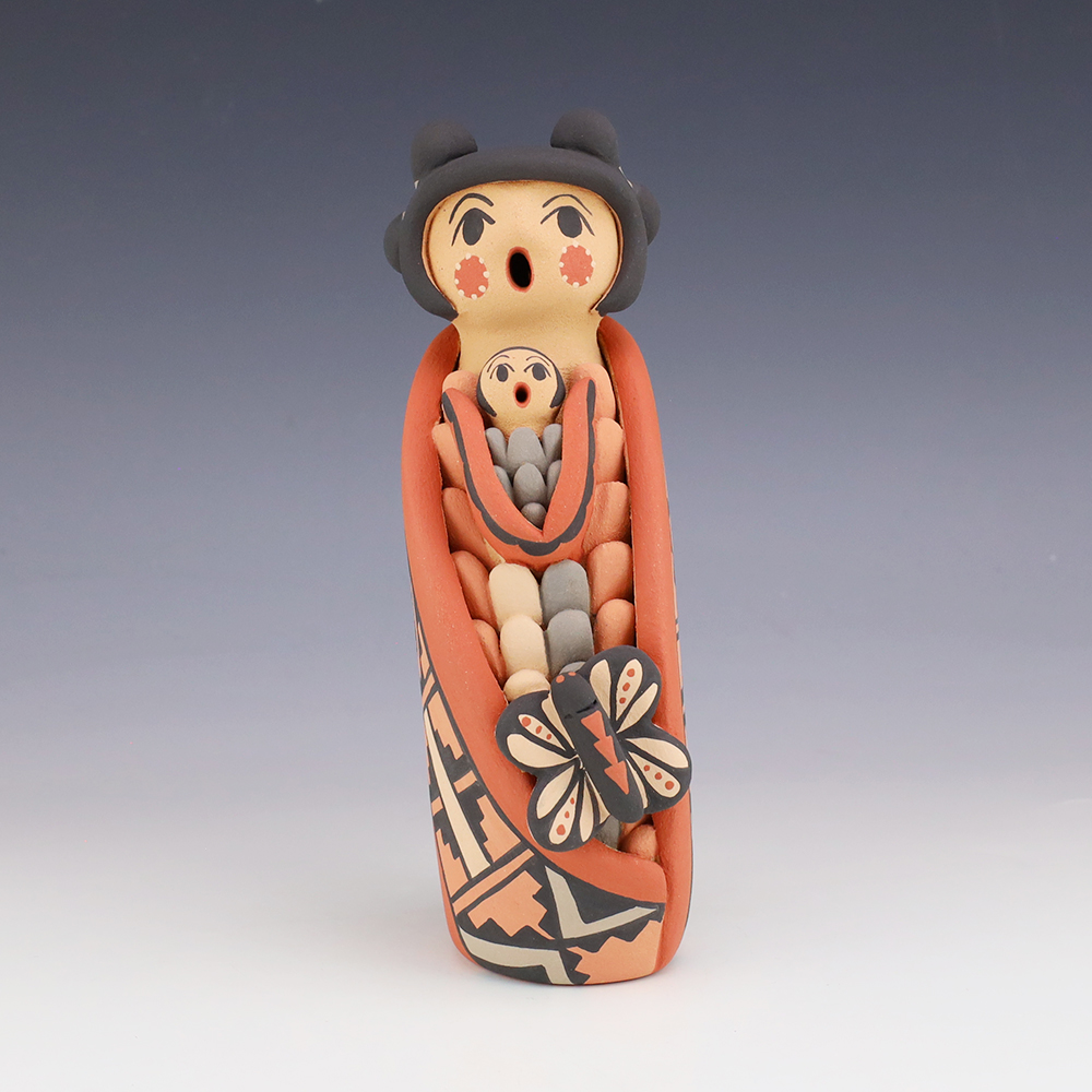 This wonderfully painted storyteller was handmade by Jemez Pueblo potter Chrislyn Fragua and depicts a woman holding a child and a baby. Chrislyn uses both the coil method and pinch method to create her pottery piece and as in traditional storytellers, Chrislyn’s storytellers have their mouths open. Storytellers represent the...