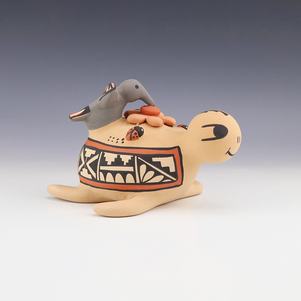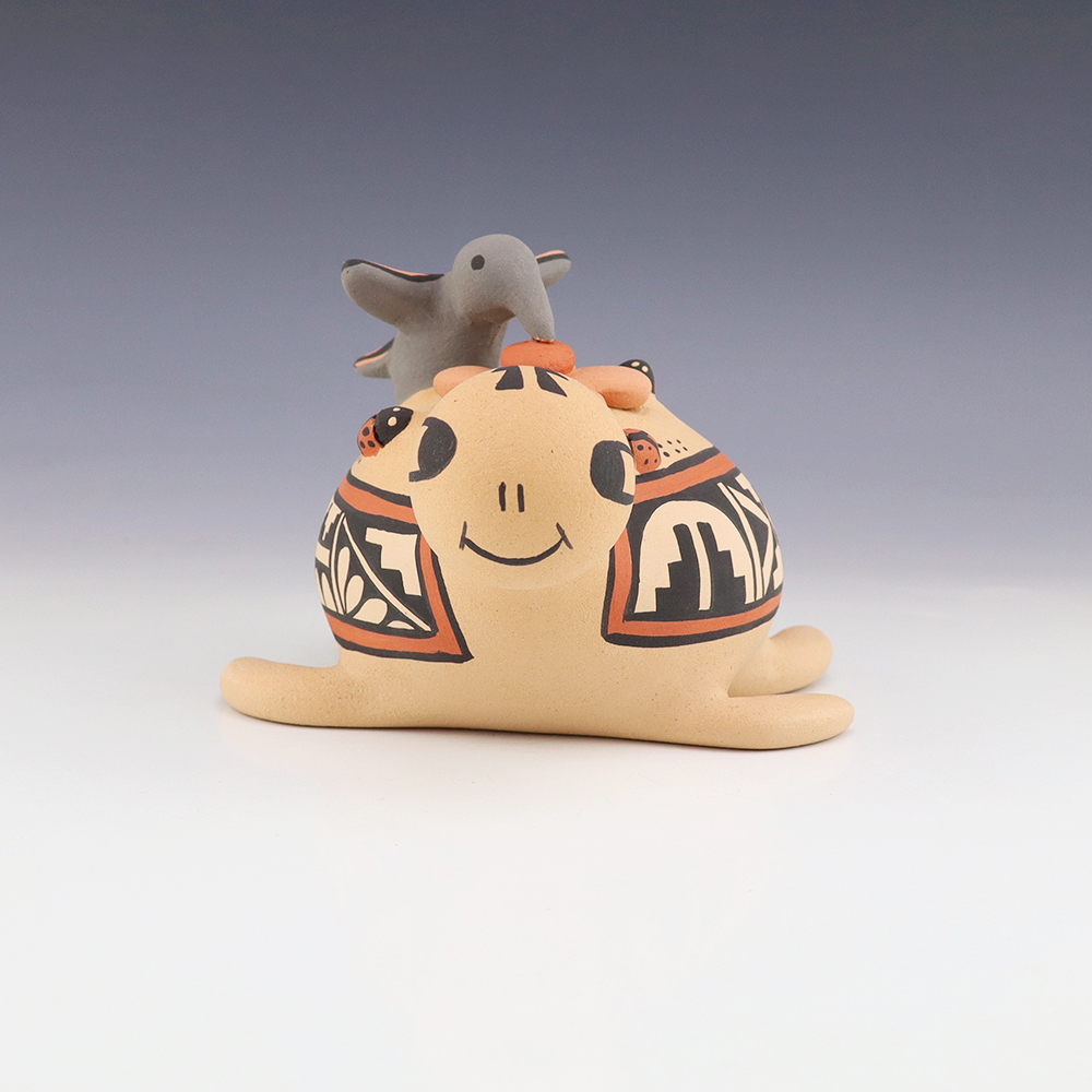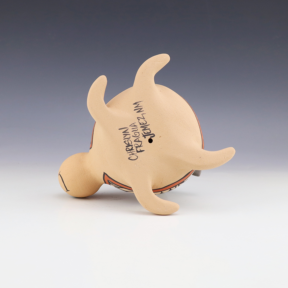 This wonderfully painted storyteller was handmade by Jemez Pueblo potter Chrislyn Fragua and depicts a Turtle with a hummingbird, flower and ladybugs on her back. Chrislyn uses both the coil method and pinch method to create her pottery piece and as in traditional storytellers, Chrislyn’s storytellers have their mouths open. Storytellers represent the passing down of stories orally through Pueblo tradition. Signed