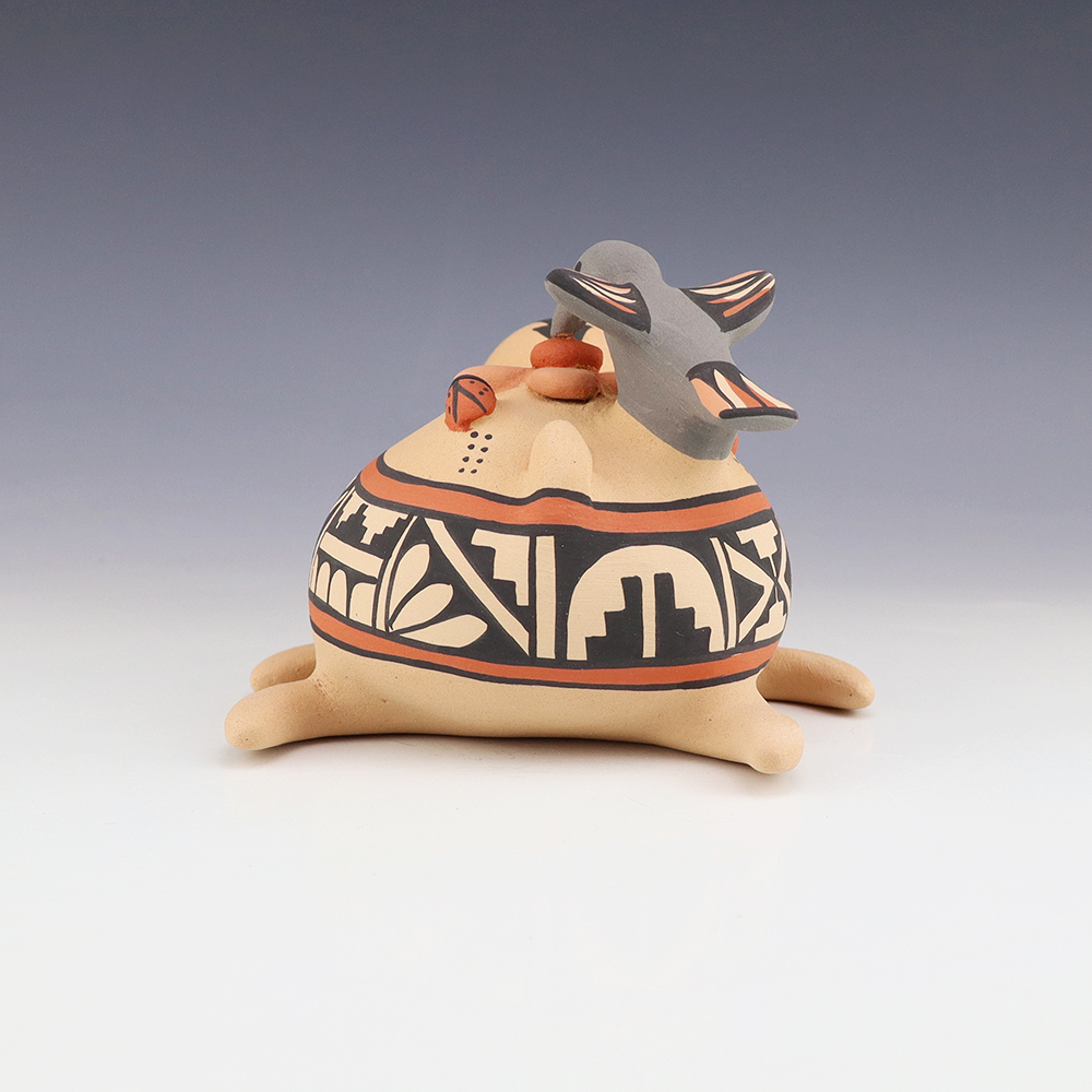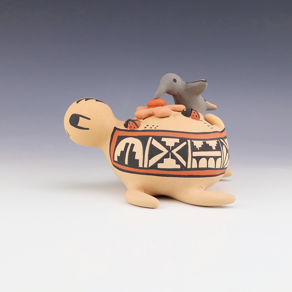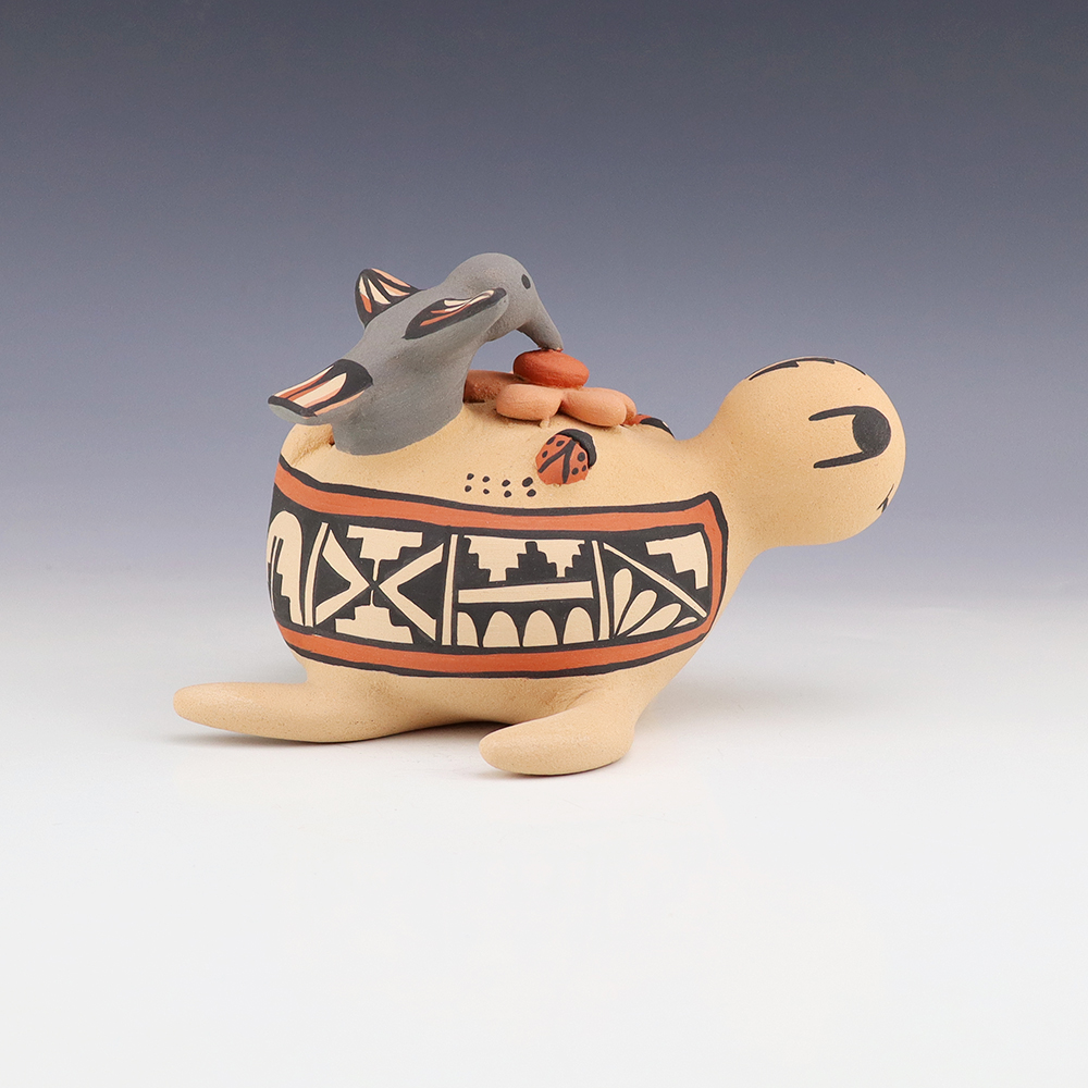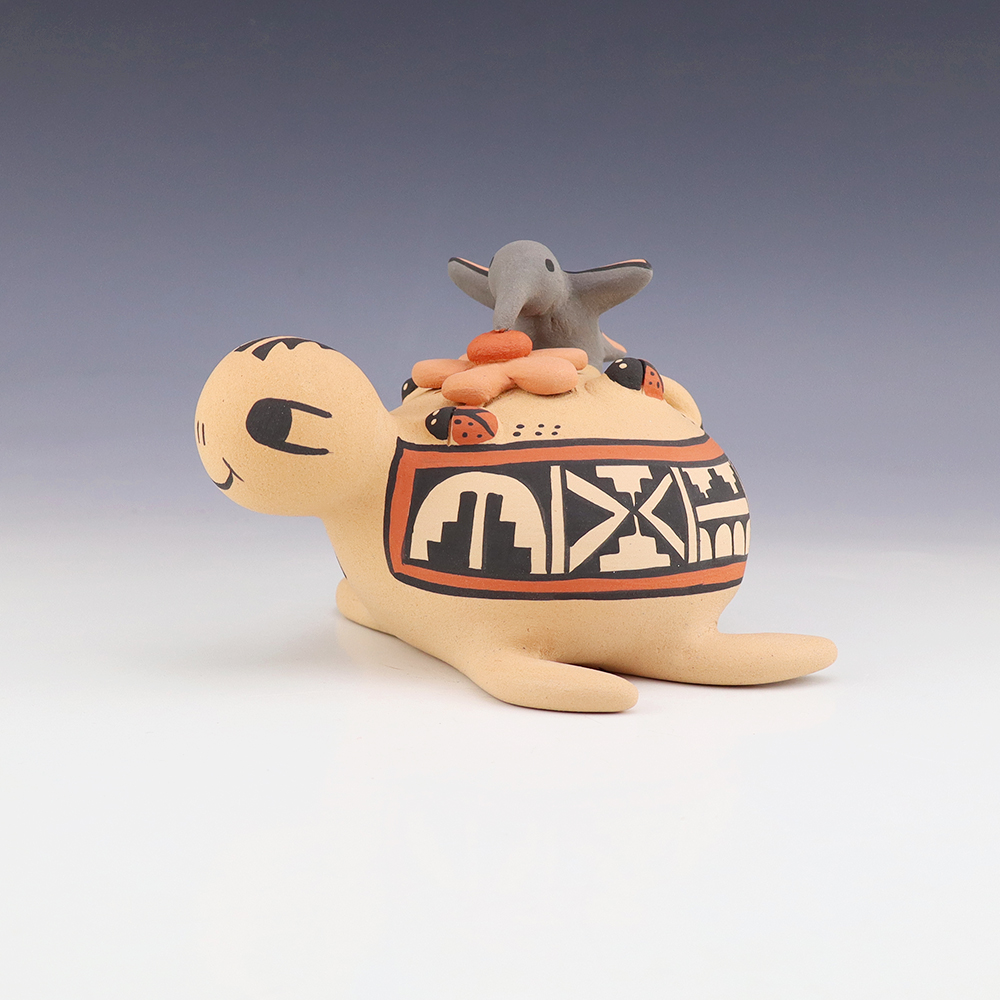 This wonderfully painted storyteller was handmade by Jemez Pueblo potter Chrislyn Fragua and depicts a Turtle with a hummingbird, flower and ladybugs on her back. Chrislyn uses both the coil method and pinch method to create her pottery piece and as in traditional storytellers, Chrislyn’s storytellers have their mouths open. Storytellers represent the passing down of stories orally through Pueblo tradition. Signed