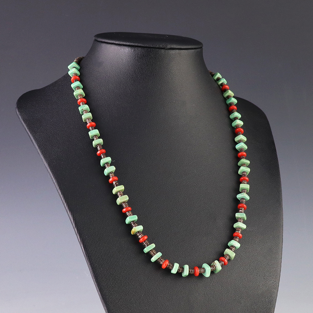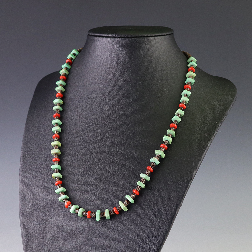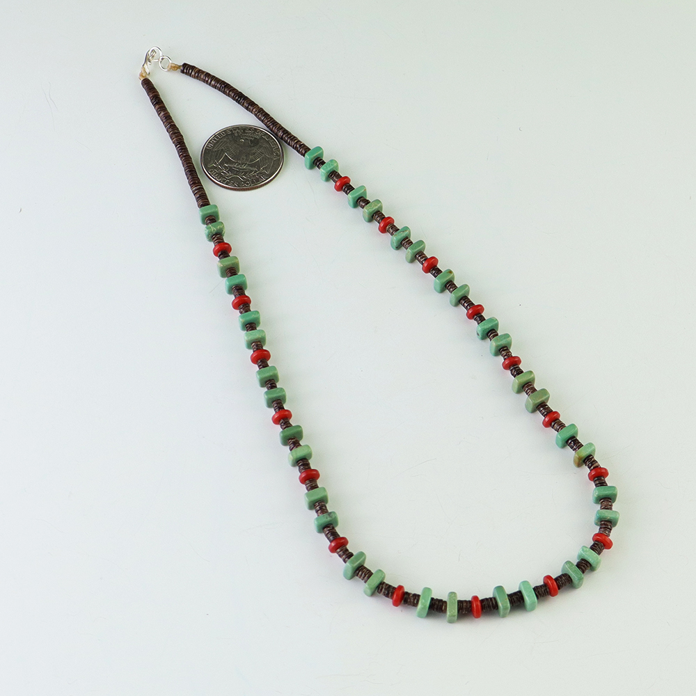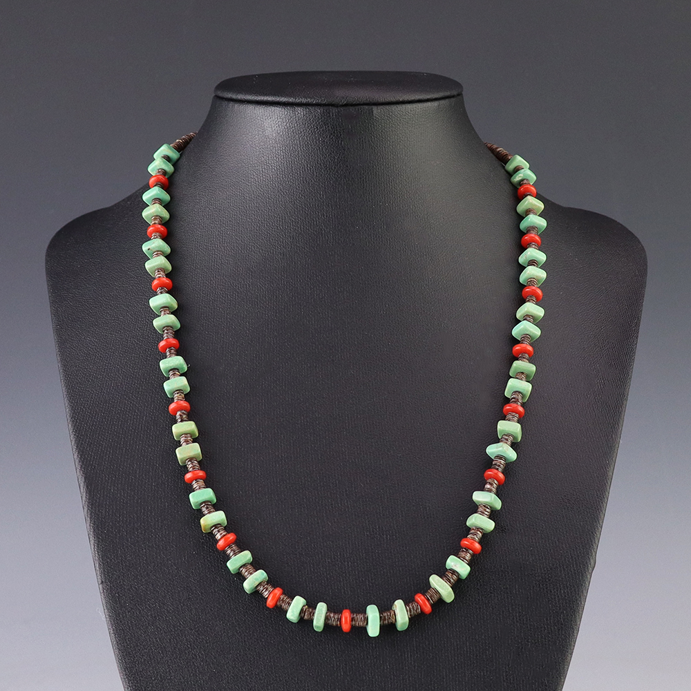 Kewa (Santo Domingo) artists are known for their heishi. The word “heishi“ means “shell” in the Keresan language. Traditionally Kewa jewelry makers created their heishi jewelry out of shell. The shell is hand cut into a flat disc. Today, other stones that Santo Domingo artists cut in this manner, are also referred to as heishi. With modern tools and innovations, artists can create different styles of beads and use different gemstones like turquoise, coral, jet, serpentine, and spiny oyster.