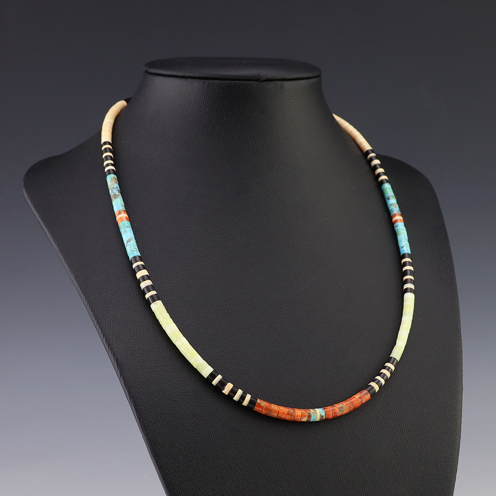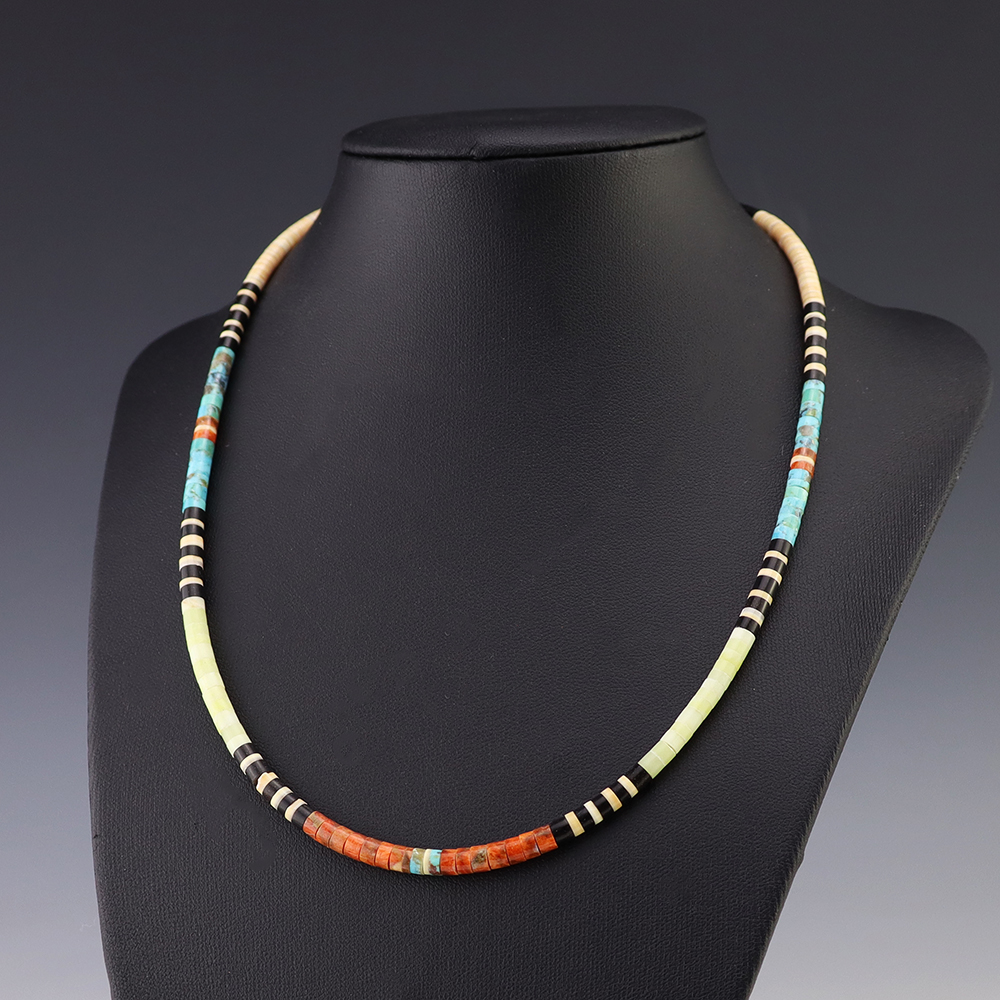 Kewa (Santo Domingo) artists are known for their heishi. The word “heishi“ means “shell” in the Keresan language. Traditionally Santo Domingo jewelry makers created their heishi jewelry out of shell. The shell is hand cut into a flat disc. Today, other stones that Santo Domingo artists cut in this manner, are also referred to as heishi. With modern tools and innovations, artists can create different styles of beads and use different gemstones like turquoise, coral, jet, serpentine, and spiny oyster.