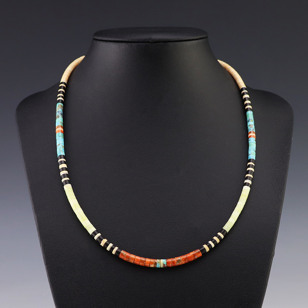Kewa (Santo Domingo) artists are known for their heishi. The word “heishi“ means “shell” in the Keresan language. Traditionally Santo Domingo jewelry makers created their heishi jewelry out of shell. The shell is hand cut into a flat disc. Today, other stones that Santo Domingo artists cut in this manner, are also referred to as heishi. With modern tools and innovations, artists can create different styles of beads and use different gemstones like turquoise, coral, jet, serpentine, and spiny oyster.