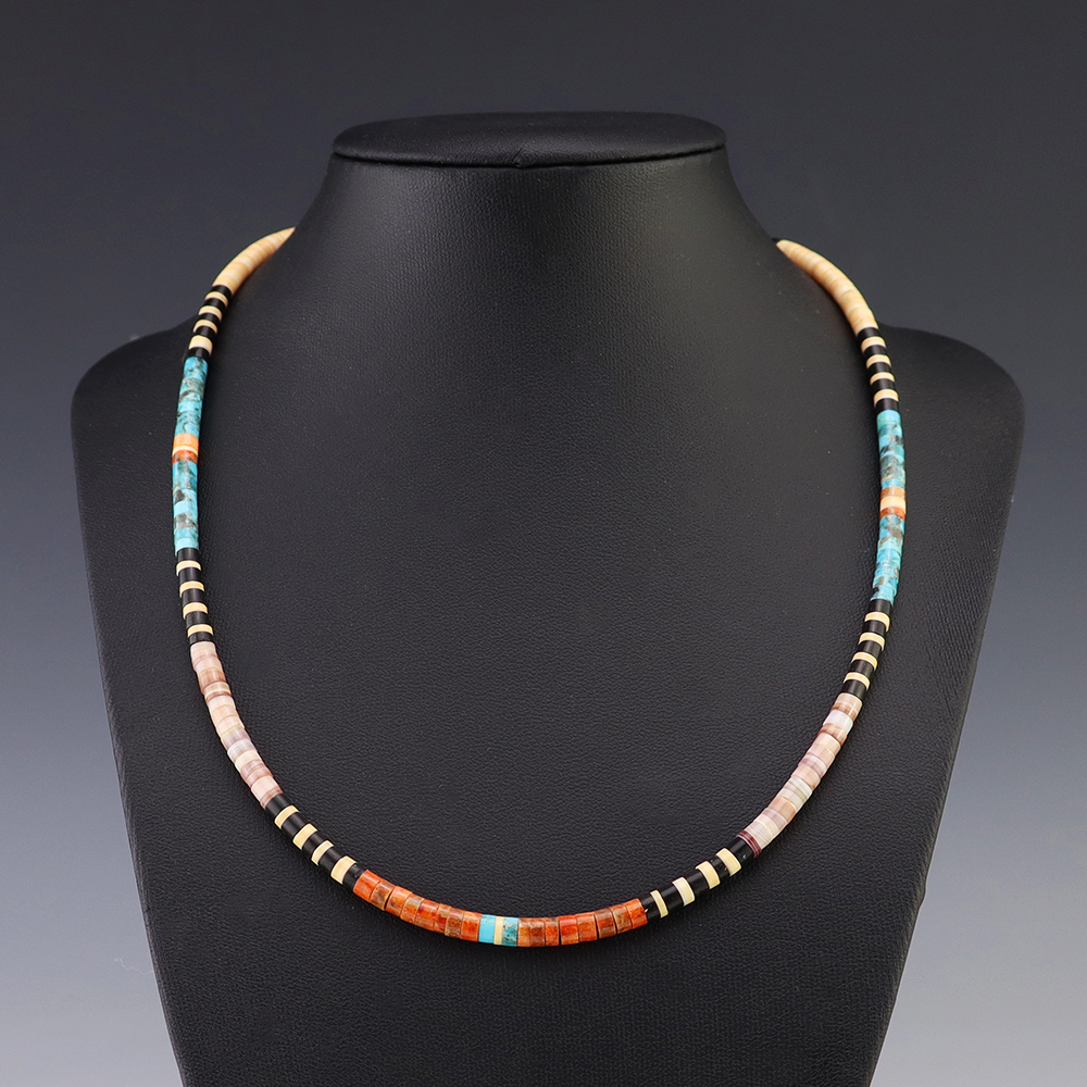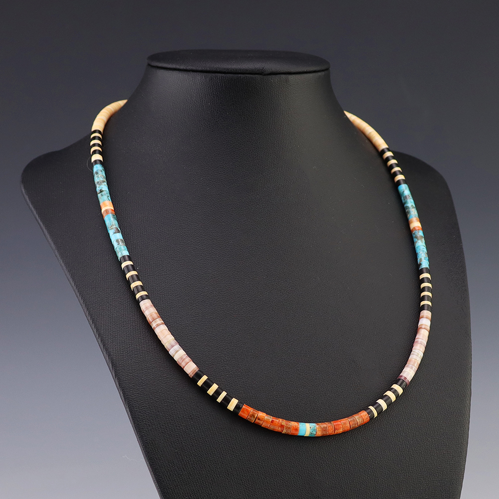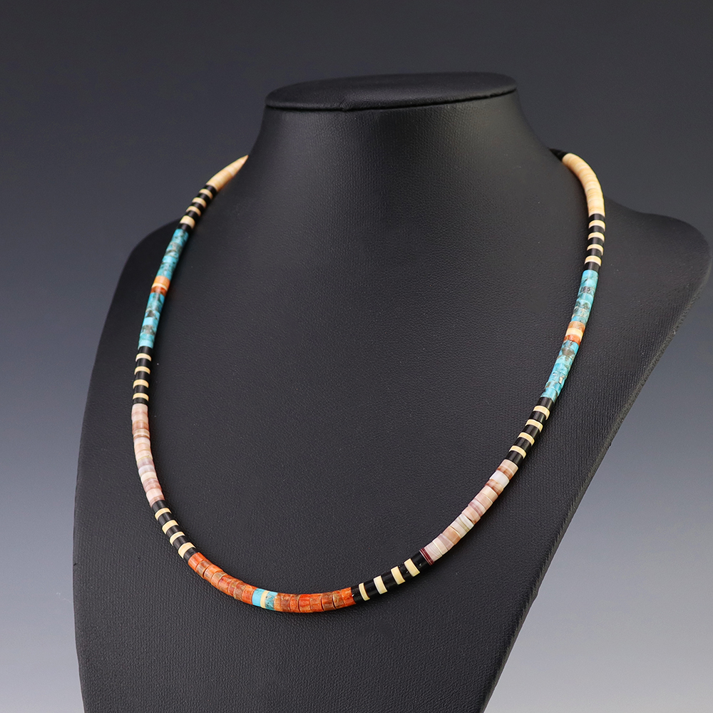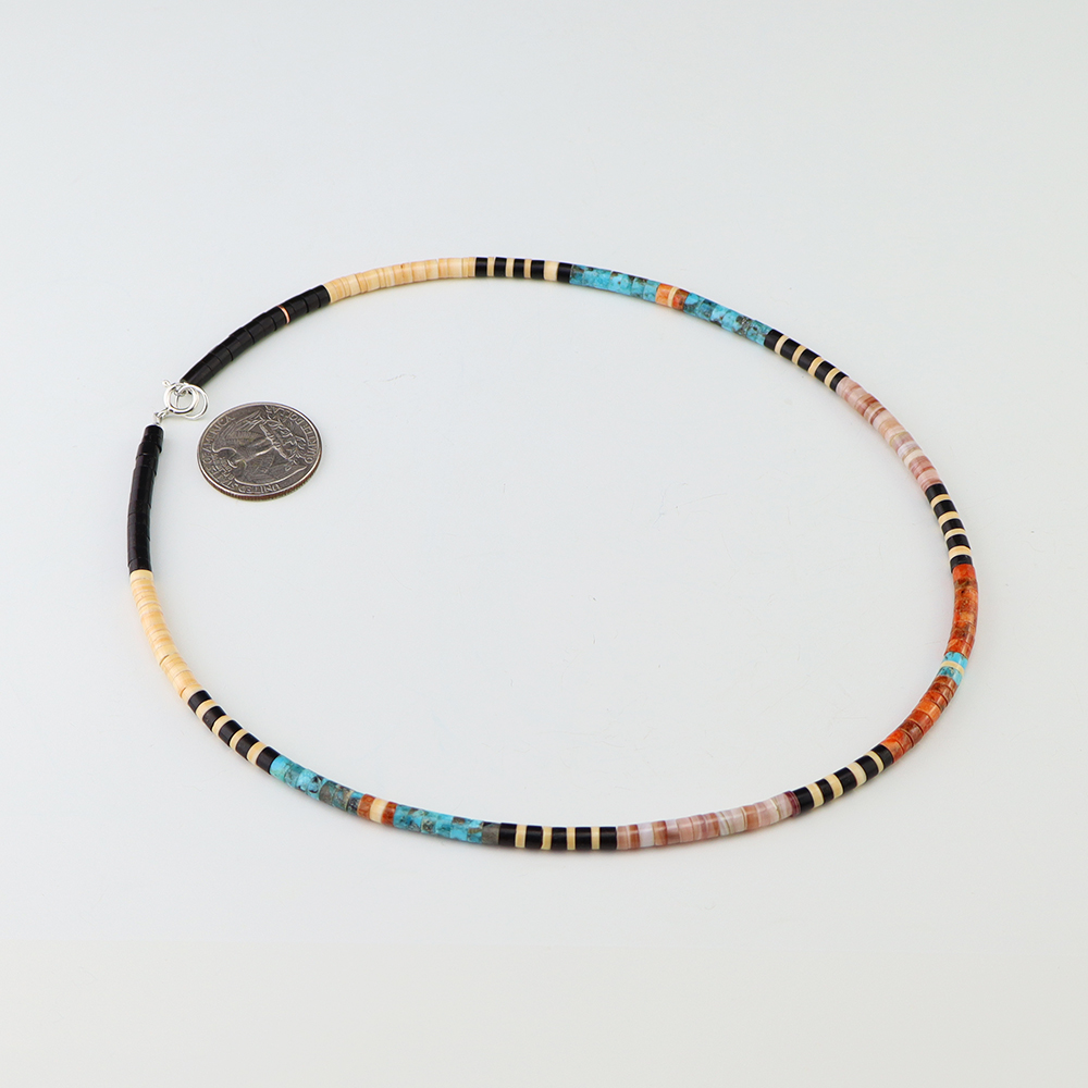 Kewa (Santo Domingo) artists are known for their heishi. The word “heishi“ means “shell” in the Keresan language. Traditionally Santo Domingo jewelry makers created their heishi jewelry out of shell. The shell is hand cut into a flat disc. Today, other stones that Santo Domingo artists cut in this manner, are also referred to as heishi. With modern tools and innovations, artists can create different styles of beads and use different gemstones like turquoise, coral, jet, serpentine, and spiny oyster.