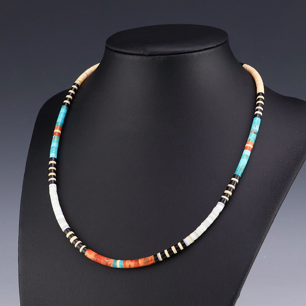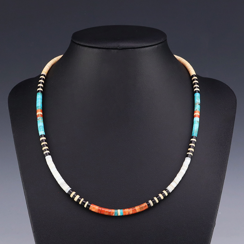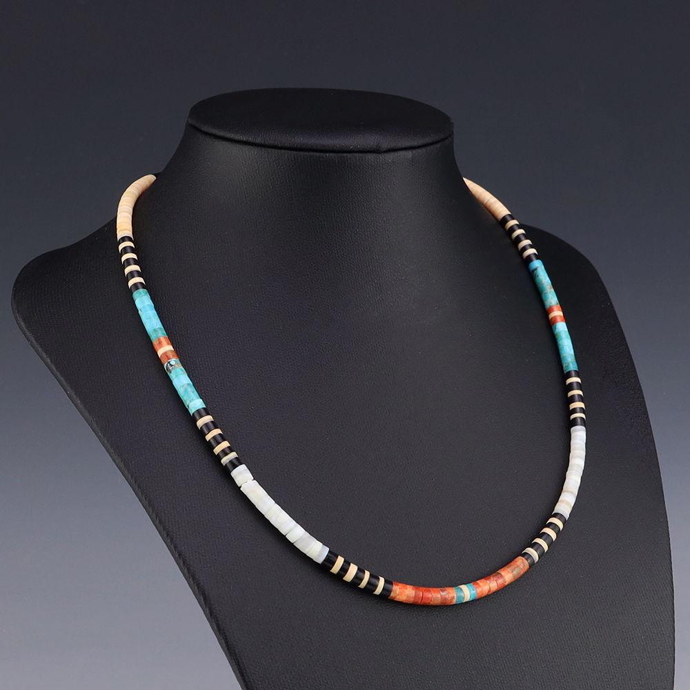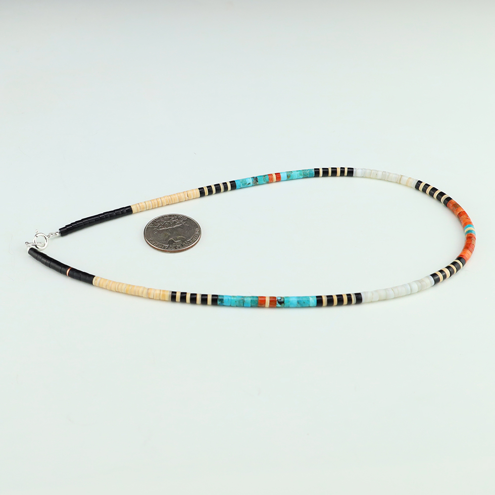 Kewa artists Mary and Gerard Calabaza made this beautiful necklace out of Melon Shell, Turquoise, Jet, Mother of Pearl Shell, and Apple Coral. Traditionally made by hand cutting, drilling, rolling, and stringing. A great strand of heishi that is finished off with sterling silver clasp. Weighs 10 grams. Fabulous colors that will look great with any outfit.