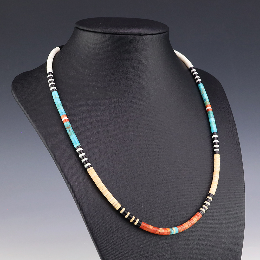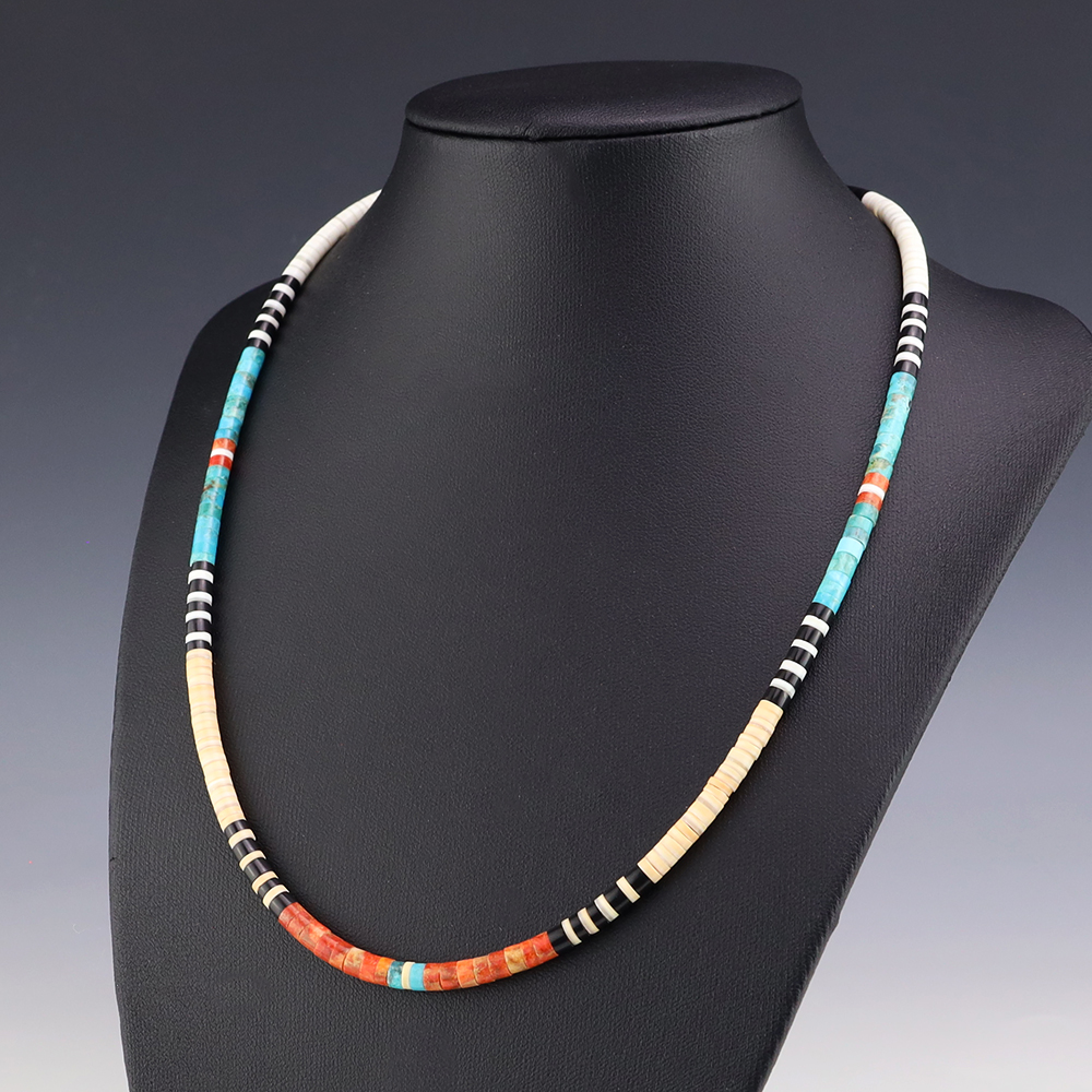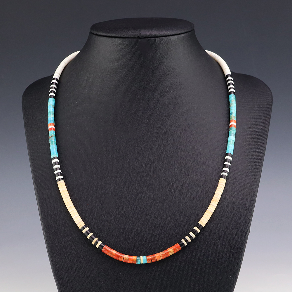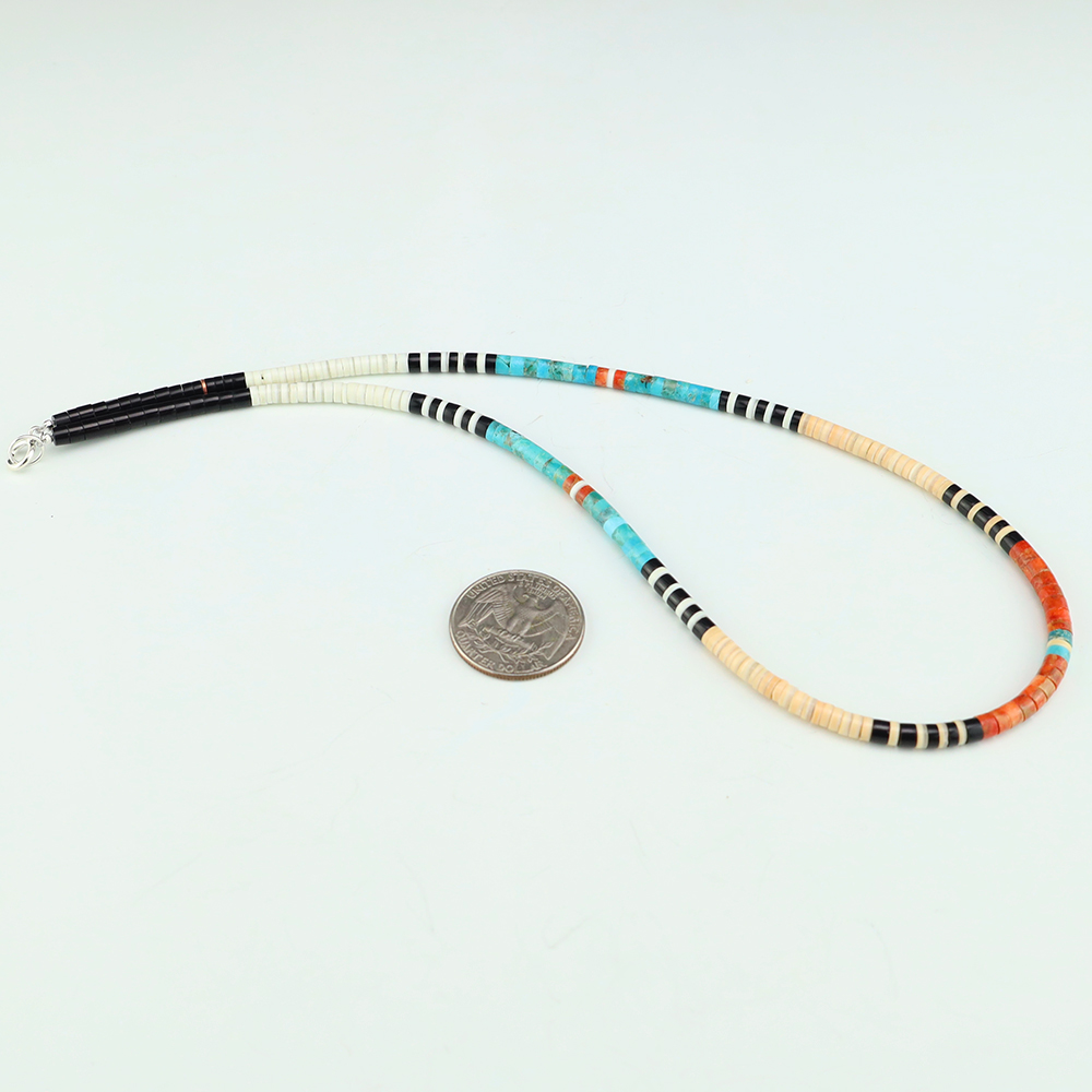 Kewa artists Mary and Gerard Calabaza made this lovely necklace out of White Clam Shell, Turquoise, Melon Shell, Jet, and Apple Coral. Traditionally made by hand cutting, drilling, rolling, and stringing. A great strand of heishi that is finished off with sterling silver clasp. Weighs 12 grams. Fabulous colors that will look great with any outfit.