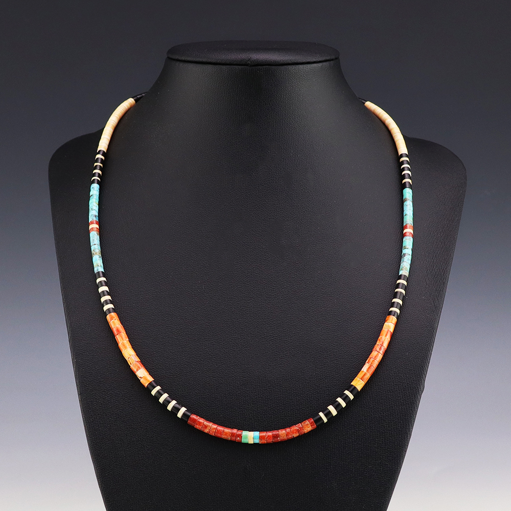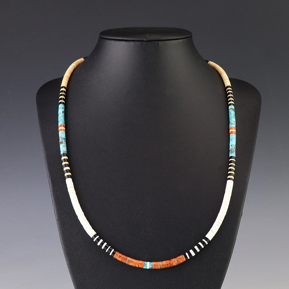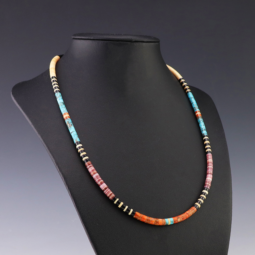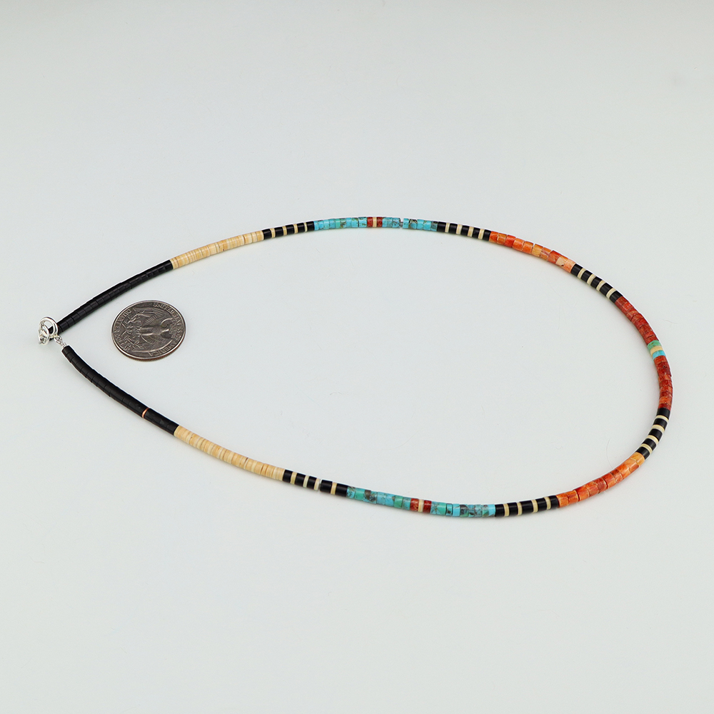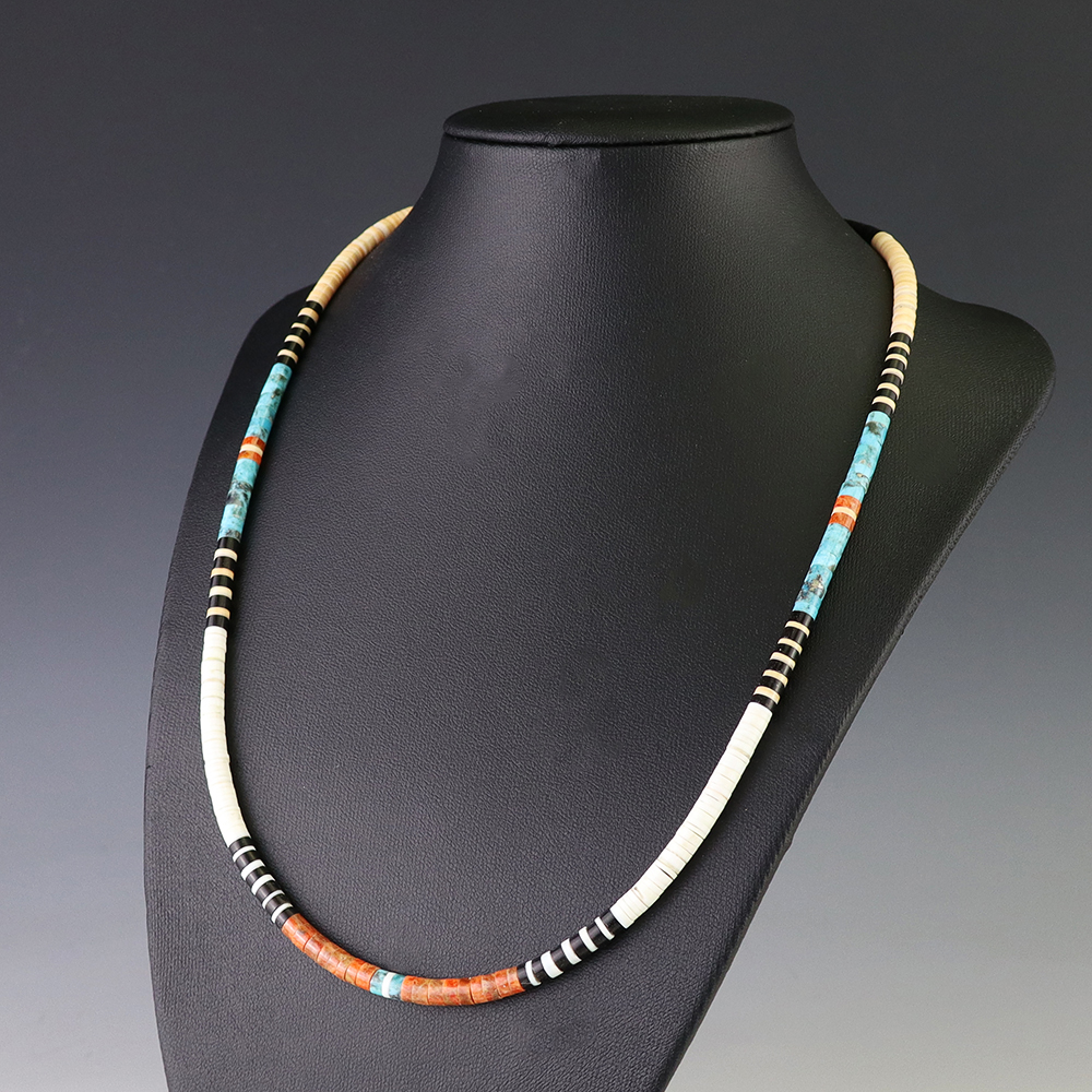 Kewa (Santo Domingo) artists are known for their heishi. The word “heishi“ means “shell” in the Keresan language. Traditionally Santo Domingo jewelry makers created their heishi jewelry out of shell. The shell is hand cut into a flat disc. Today, other stones that Santo Domingo artists cut in this manner, are also referred to as heishi. With modern tools and innovations, artists can create different styles of beads and use different gemstones like turquoise, coral, jet, serpentine, and spiny oyster.
