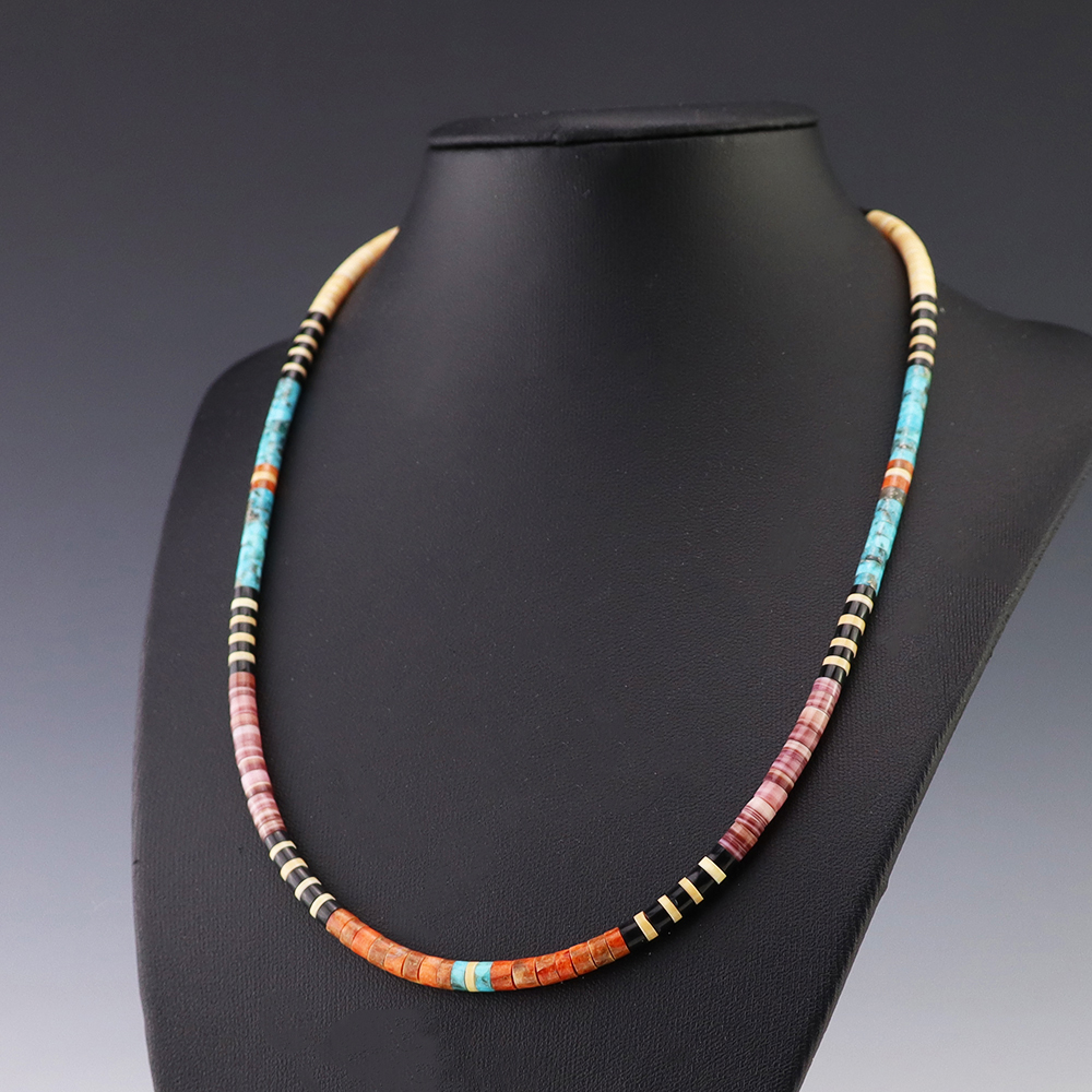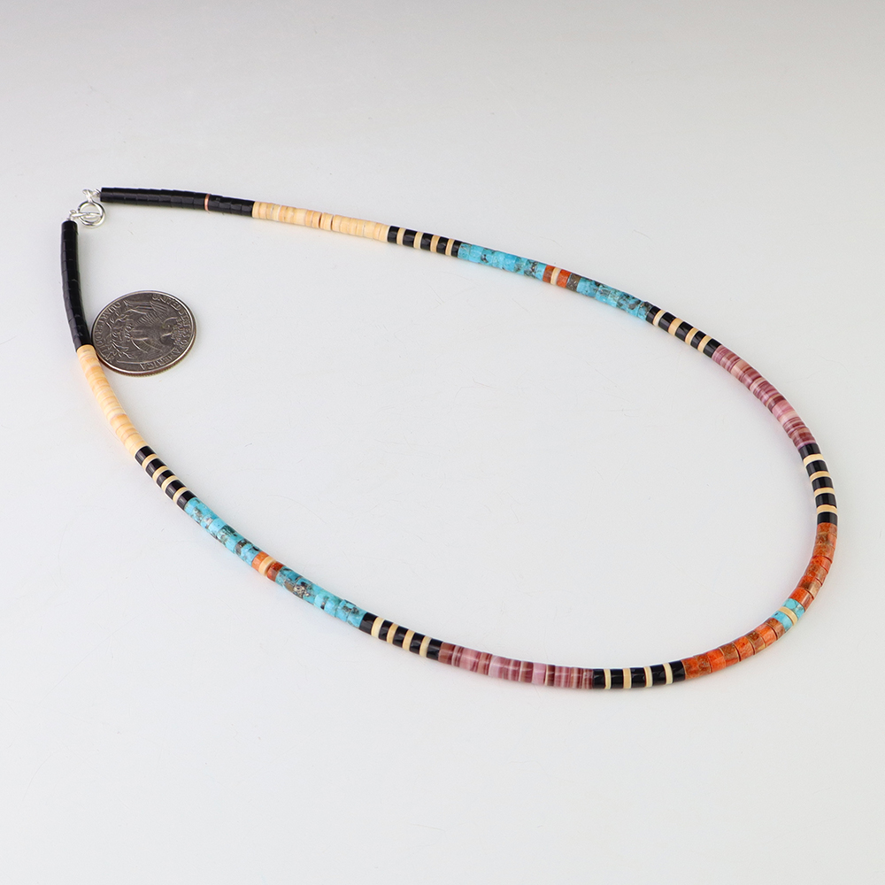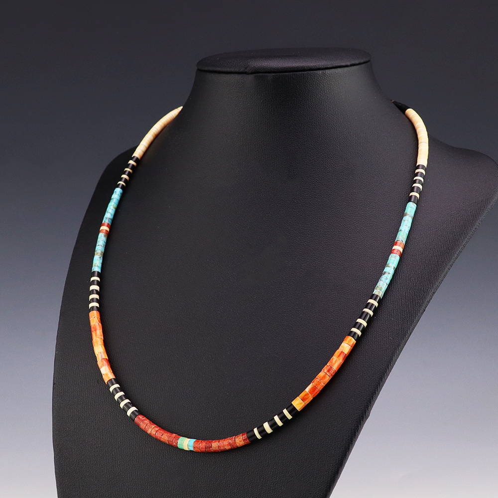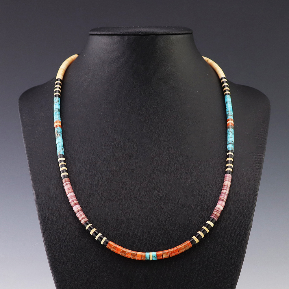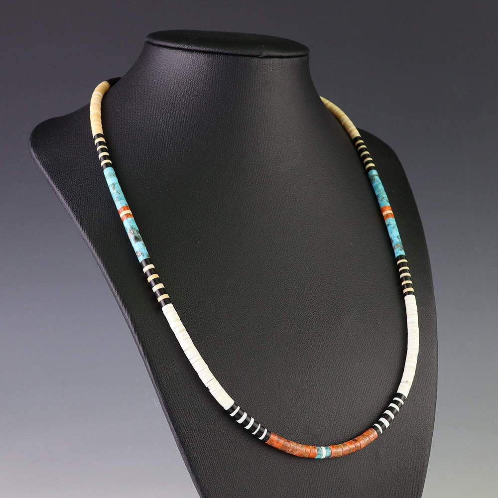 Kewa (Santo Domingo) artists are known for their heishi. The word “heishi“ means “shell” in the Keresan language. Traditionally Santo Domingo jewelry makers created their heishi jewelry out of shell. The shell is hand cut into a flat disc. Today, other stones that Santo Domingo artists cut in this manner, are also referred to as heishi. With modern tools and innovations, artists can create different styles of beads and use different gemstones like turquoise, coral, jet, serpentine, and spiny oyster.