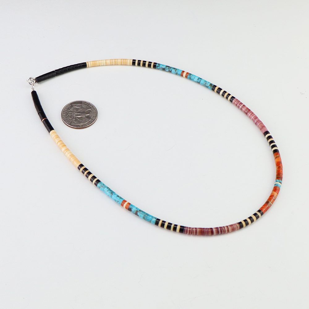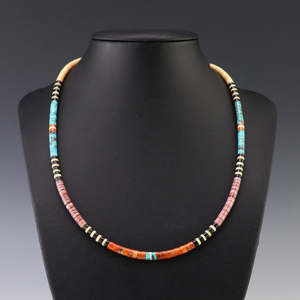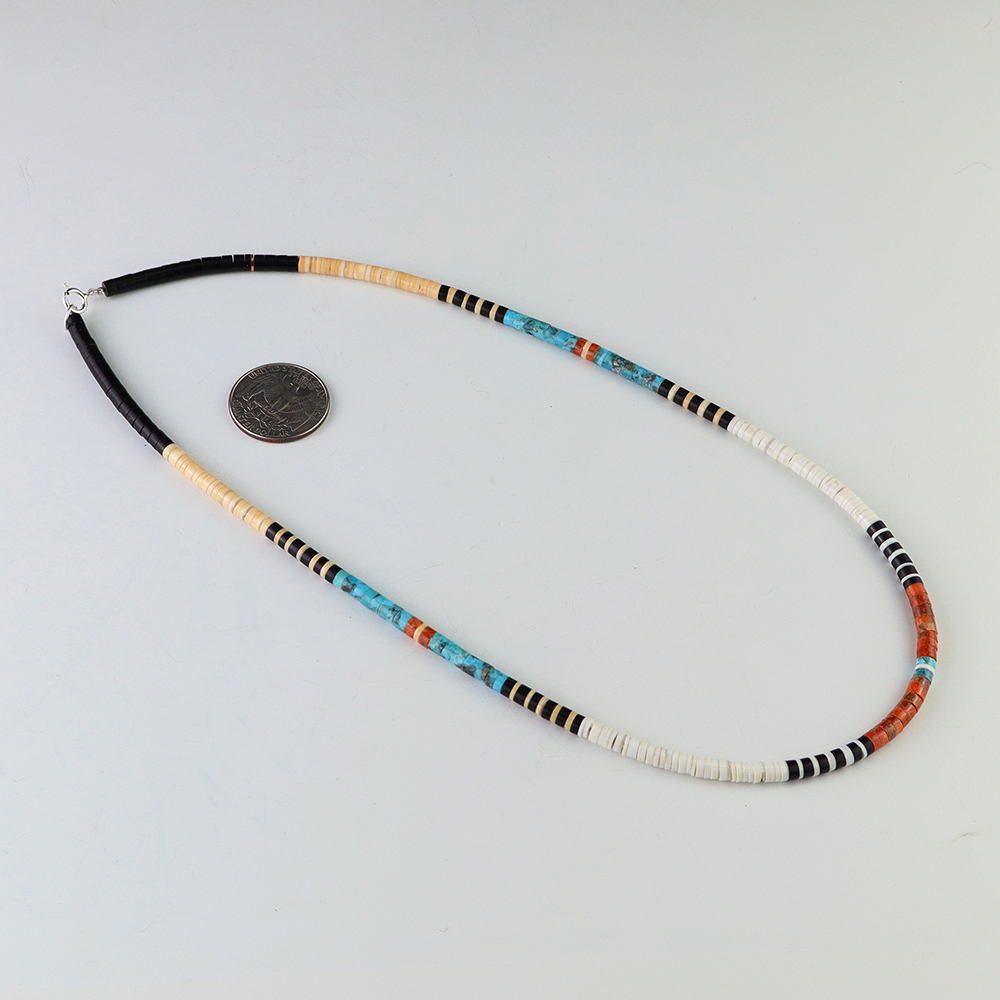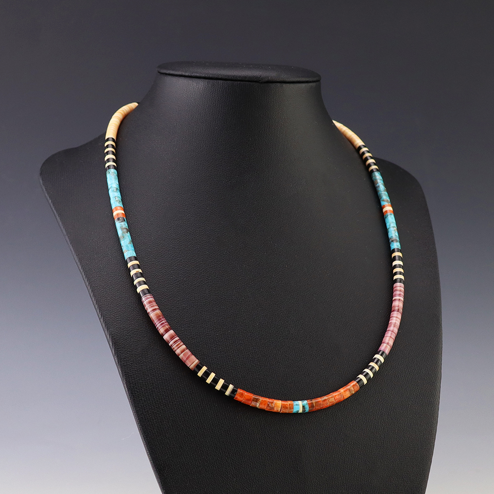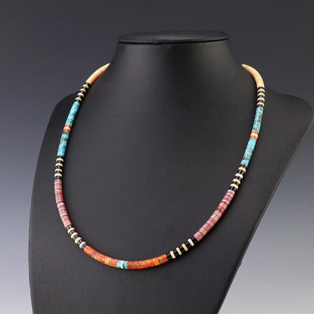 Kewa (Santo Domingo) artists are known for their heishi. The word “heishi“ means “shell” in the Keresan language. Traditionally Santo Domingo jewelry makers created their heishi jewelry out of shell. The shell is hand cut into a flat disc. Today, other stones that Santo Domingo artists cut in this manner, are also referred to as heishi. With modern tools and innovations, artists can create different styles of beads and use different gemstones like turquoise, coral, jet, serpentine, and spiny oyster.
