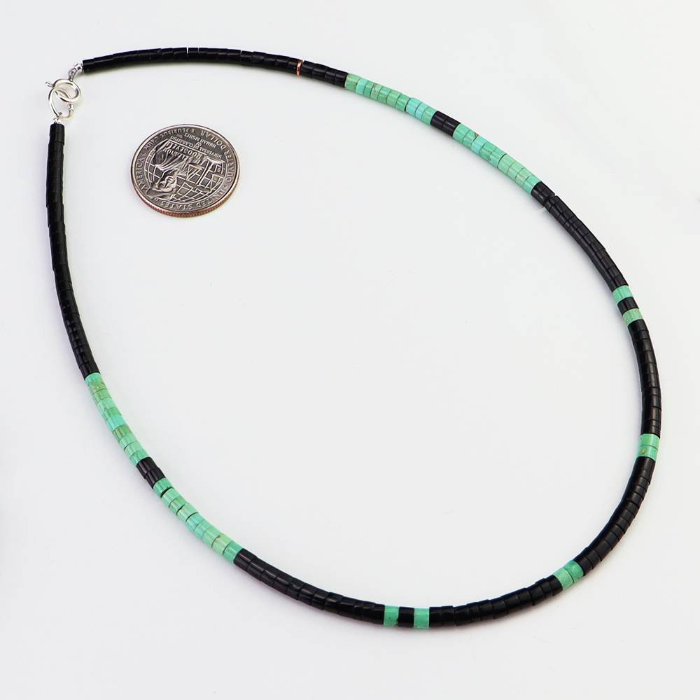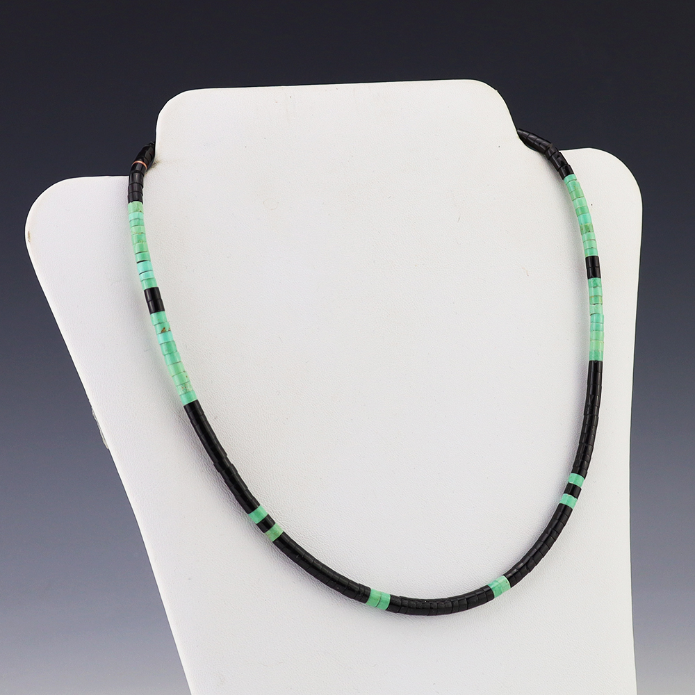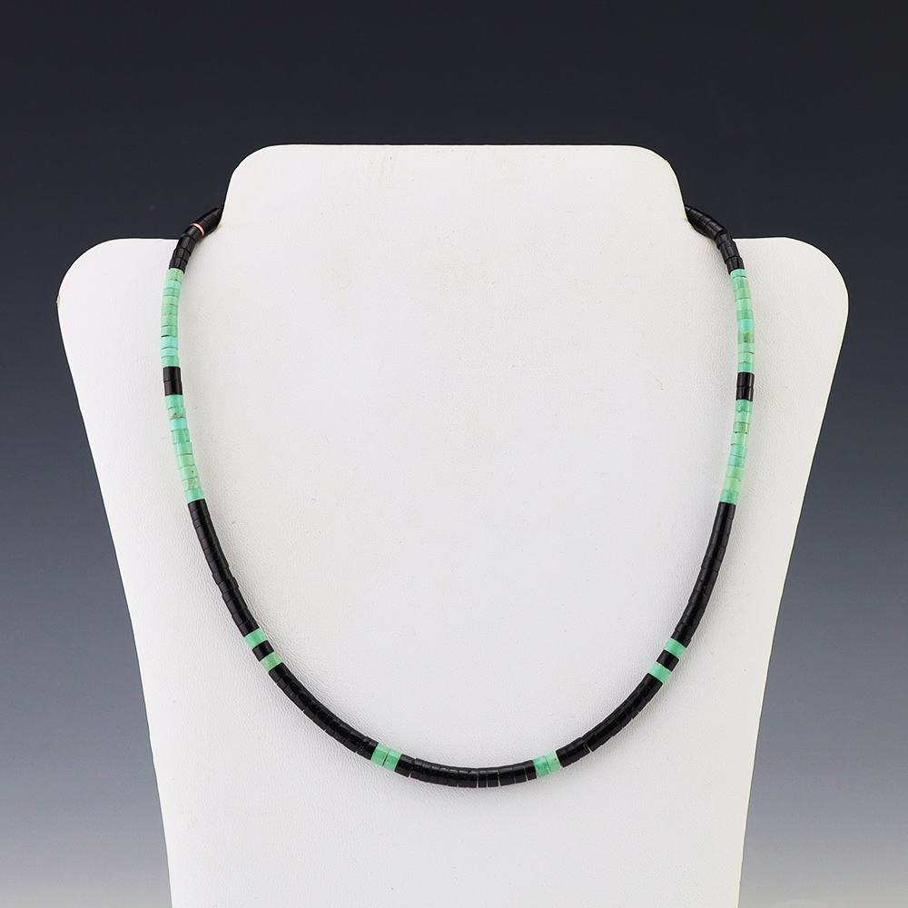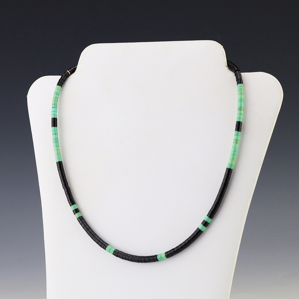 Kewa (Santo Domingo) artists are known for their heishi. The word “heishi“ means “shell” in the Keresan language. Traditionally Santo Domingo jewelry makers created their heishi jewelry out of shell. The shell is hand cut into a flat disc. Today, other stones that Santo Domingo artists cut in this manner, are also referred to as heishi. With modern tools and innovations, artists can create different styles of beads and use different gemstones like turquoise, coral, jet, serpentine, and spiny oyster.