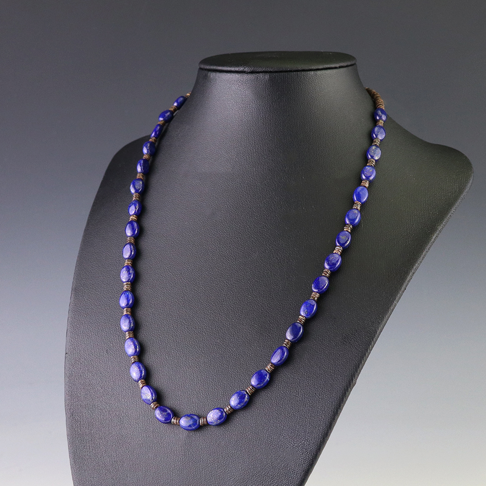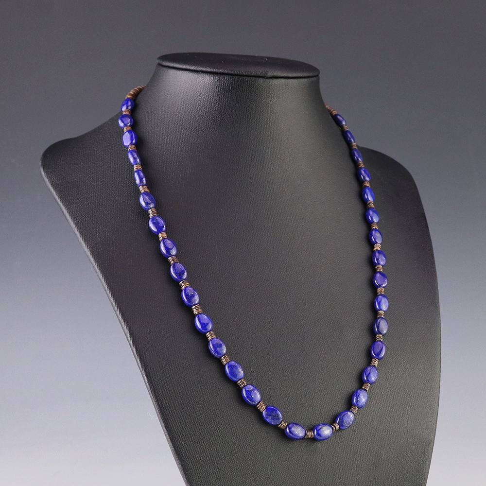 This necklace, hand made by Kewa artist Jeanette Calabaza, is a lovely statement piece. The necklace showcases fine Olive Shell and Lapis. The strand of heishi is finished off with a hook and eye. Weighs 12 grams.