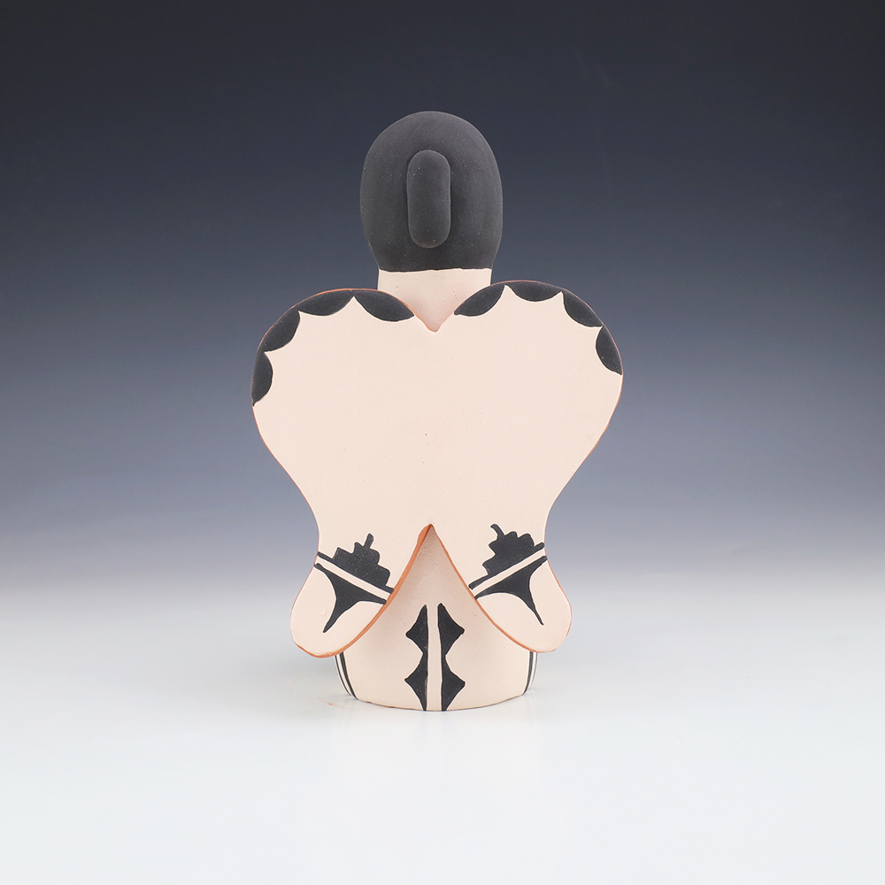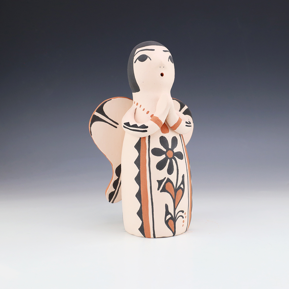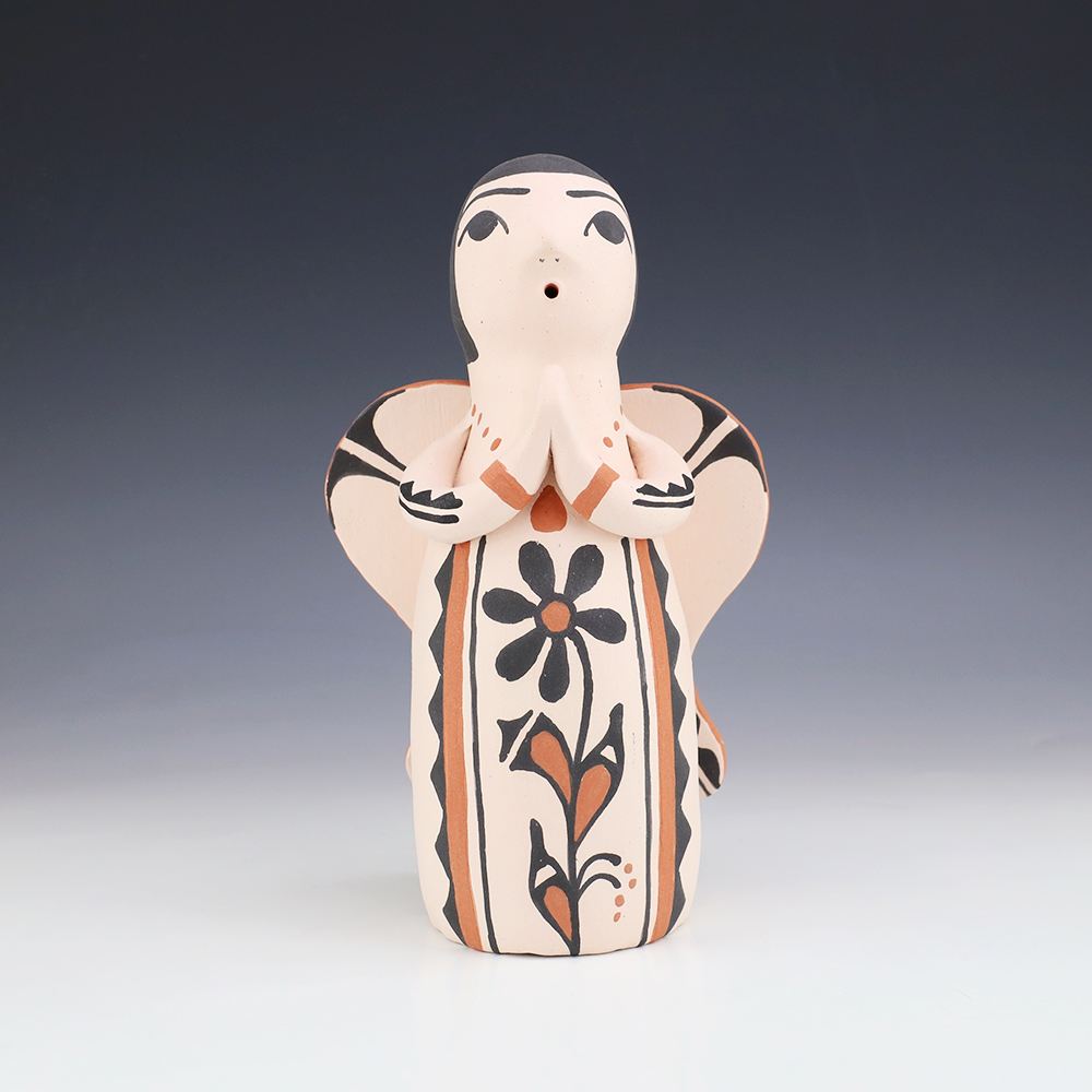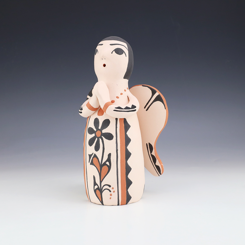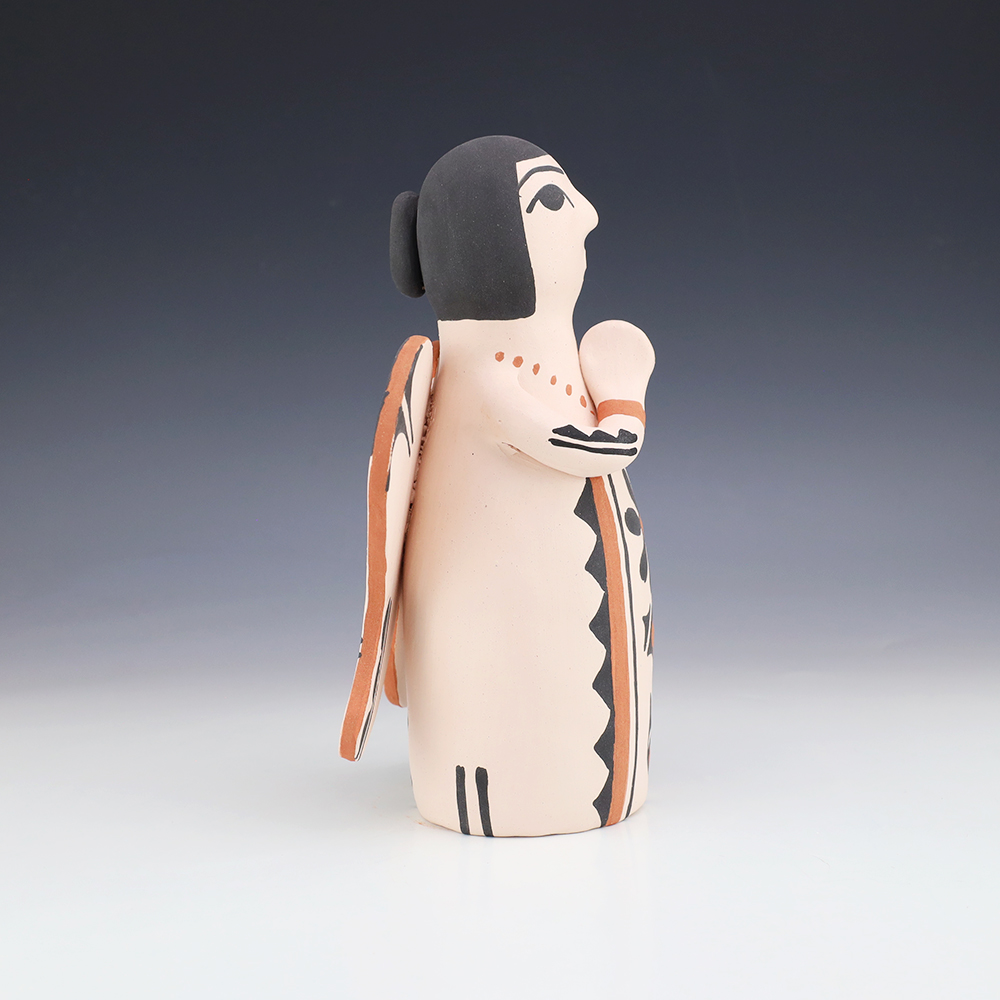 Kewa potters, Angel and Ralph made this lovely pottery angel. Traditionally made and fired using an outdoor kiln. Great colors and patterns. This pottery storyteller would be a great addition to your collection of Native American art or pottery. Signed