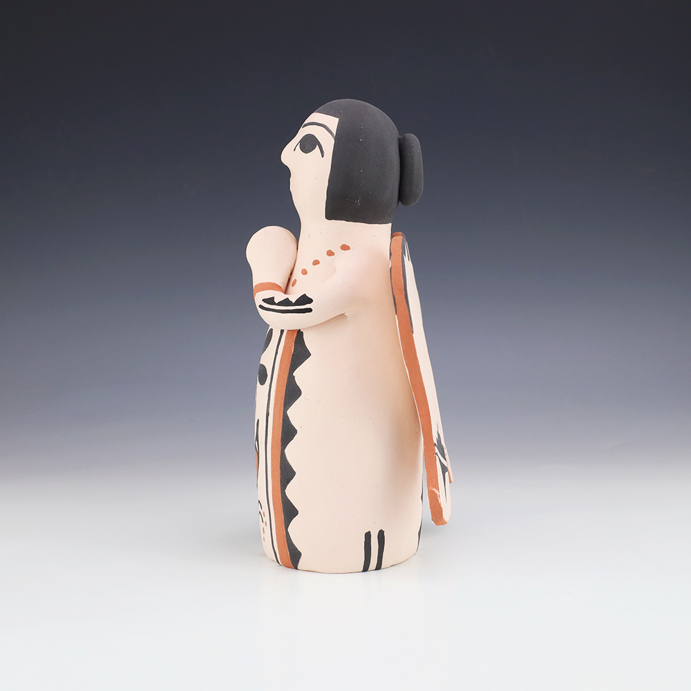 This wonderfully painted storyteller was handmade by Jemez Pueblo potter Chrislyn Fragua and depicts a woman with three children. Chrislyn uses both the coil method and pinch method to create her pottery piece and as in traditional storytellers, Chrislyn’s storytellers have their mouths open. Storytellers represent the passing down of...