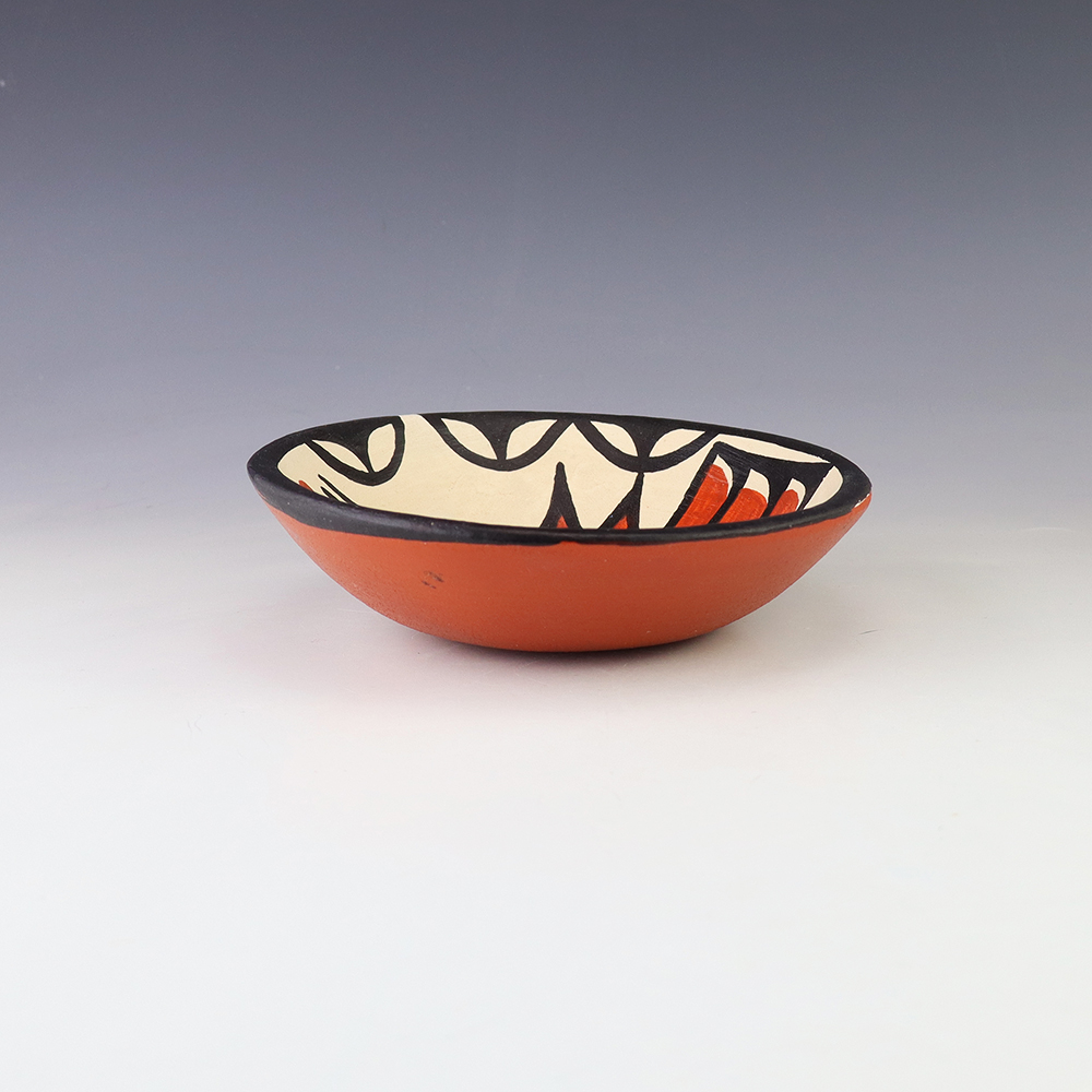 Kewa (Santo Domingo) pueblo one of the largest of the Northern pueblos. Santo Domingo pottery can be distinguished by its buff colored clay, cream slip, and dark black geometric designs. The elastic clay at Santo Domingo lends itself to large forms such as storage jars, dough bowls, and large ollas. The designs are mainly geometric with particular attention to the negative spaces. Occasionally there will also be elaborate bird motifs and polychrome designs.