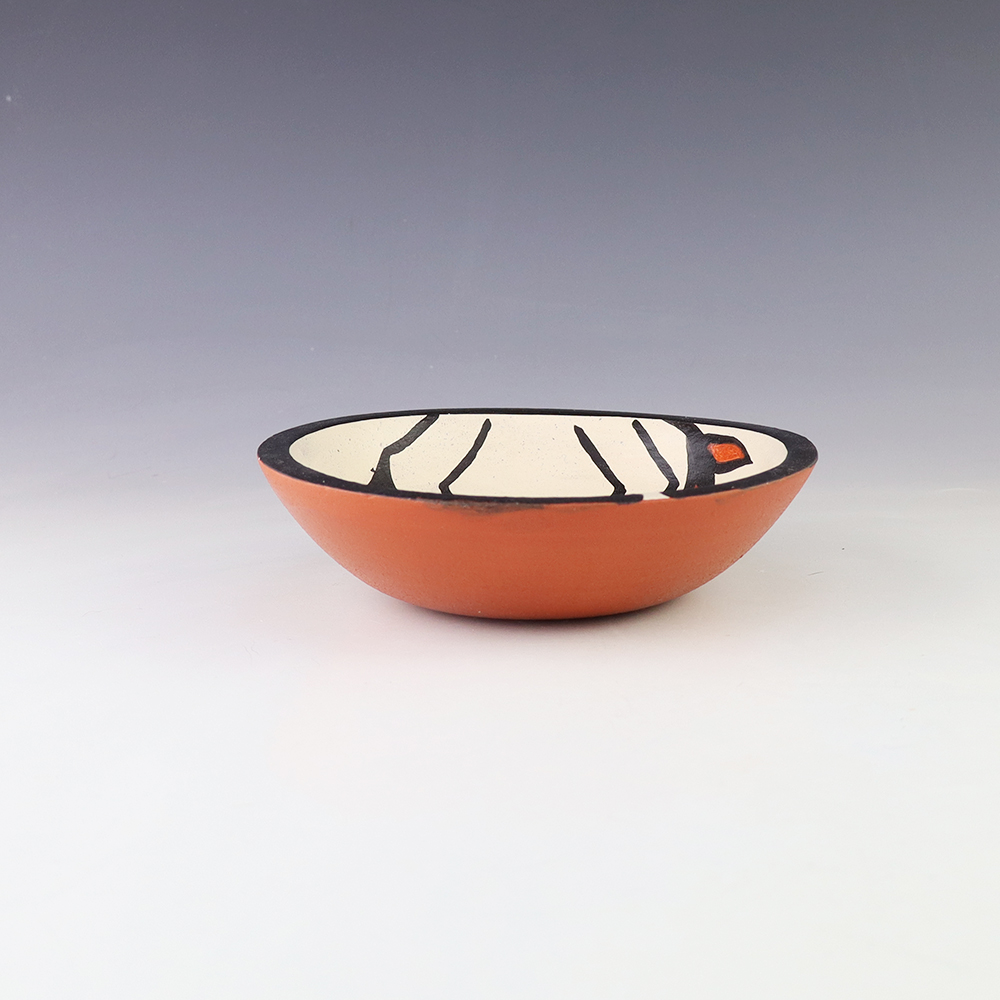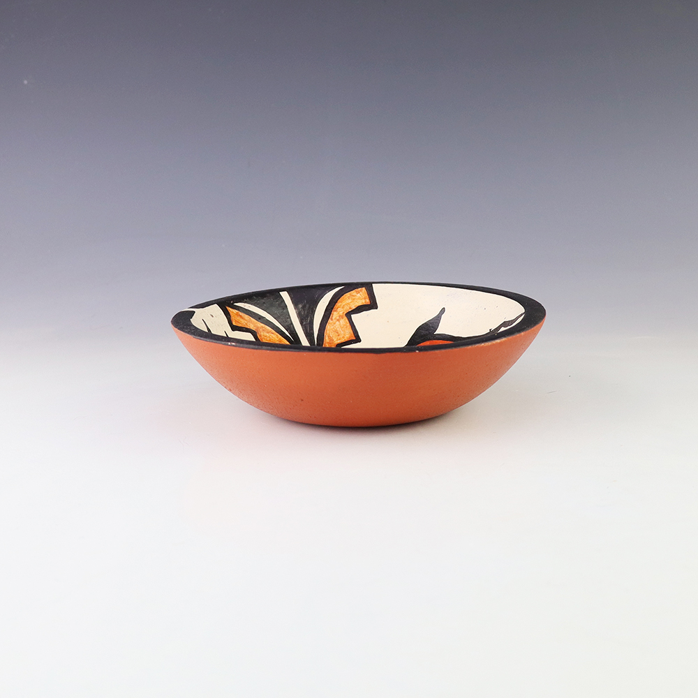 Kewa (Santo Domingo) pueblo one of the largest of the Northern pueblos. Santo Domingo pottery can be distinguished by its buff colored clay, cream slip, and dark black geometric designs. The elastic clay at Santo Domingo lends itself to large forms such as storage jars, dough bowls, and large ollas. The designs are mainly geometric with particular attention to the negative spaces. Occasionally there will also be elaborate bird motifs and polychrome designs.