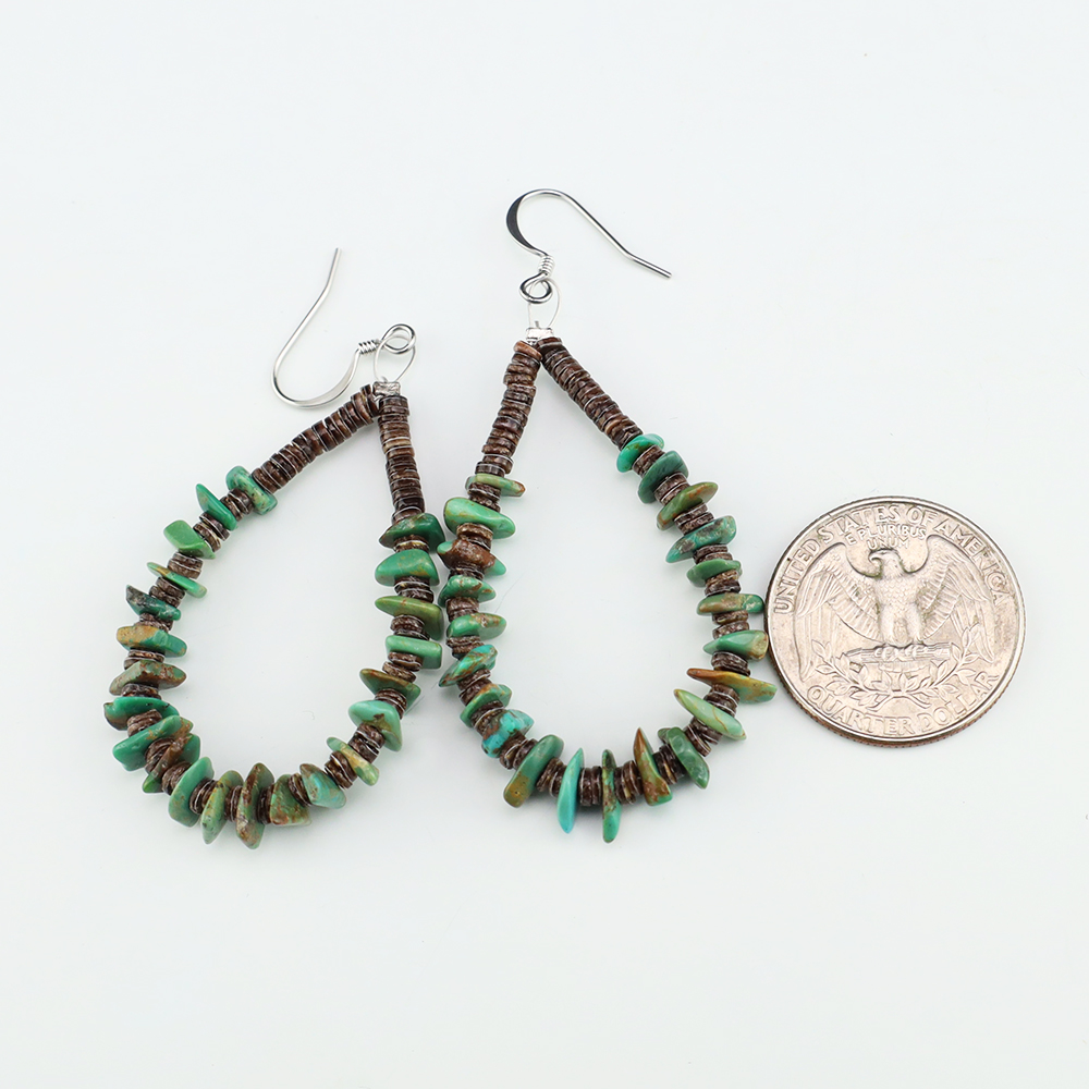 Kewa artist Jeanette Calabaza handcrafted these lovely earrings out of Turquoise and Olive Shell. These earrings will look fabulous with any outfit. Weighs 8 grams.