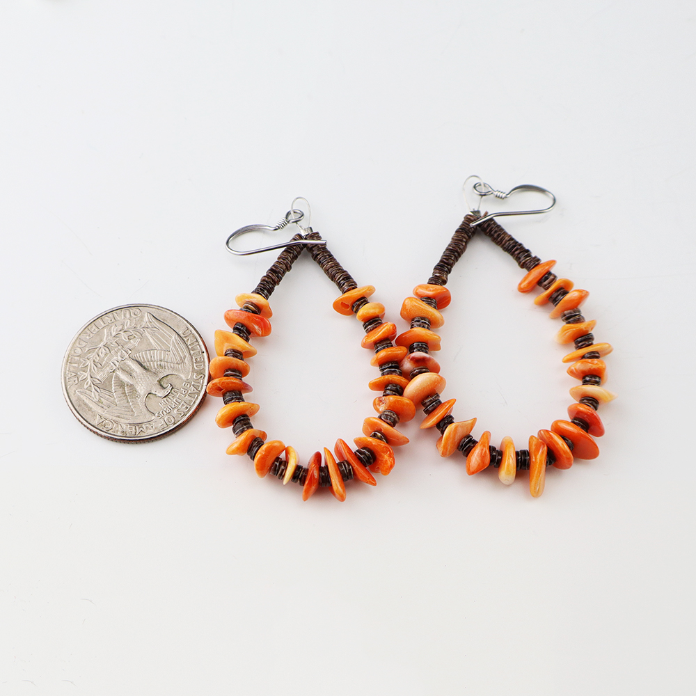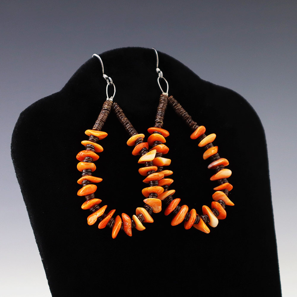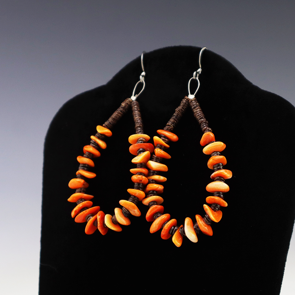 Kewa artist Jeanette Calabaza handcrafted these lovely earrings out of Spiny Oyster and Olive Shell. These earrings will look fabulous with any outfit. Weighs 6 grams.