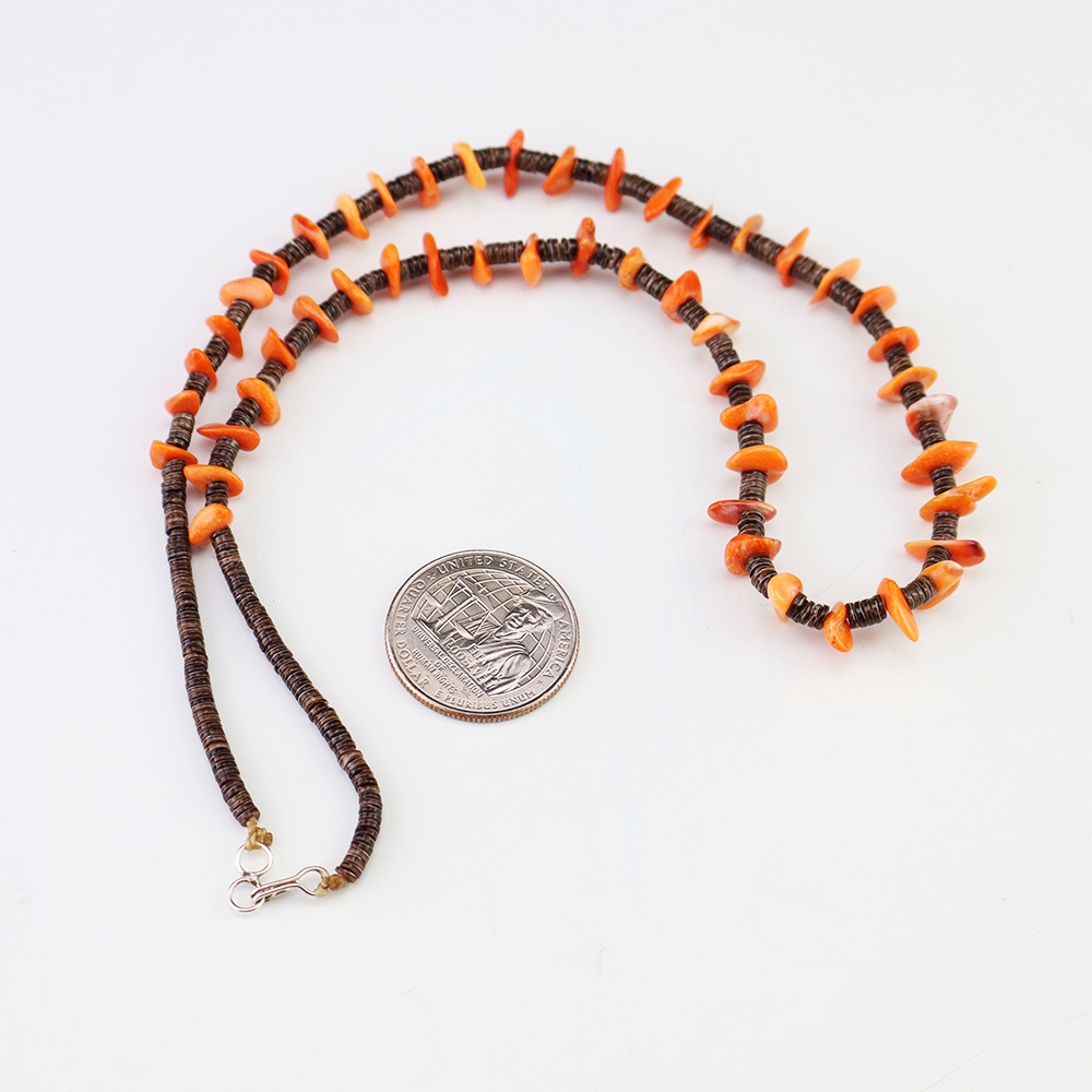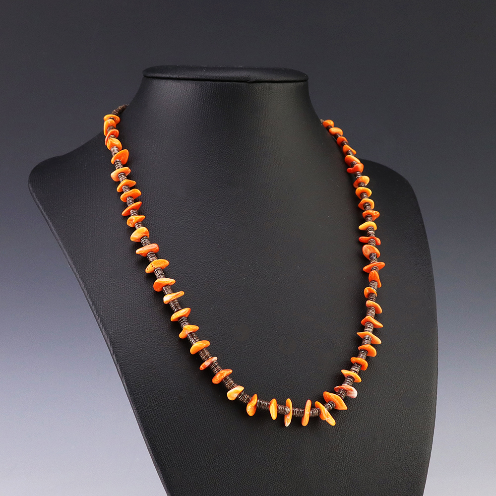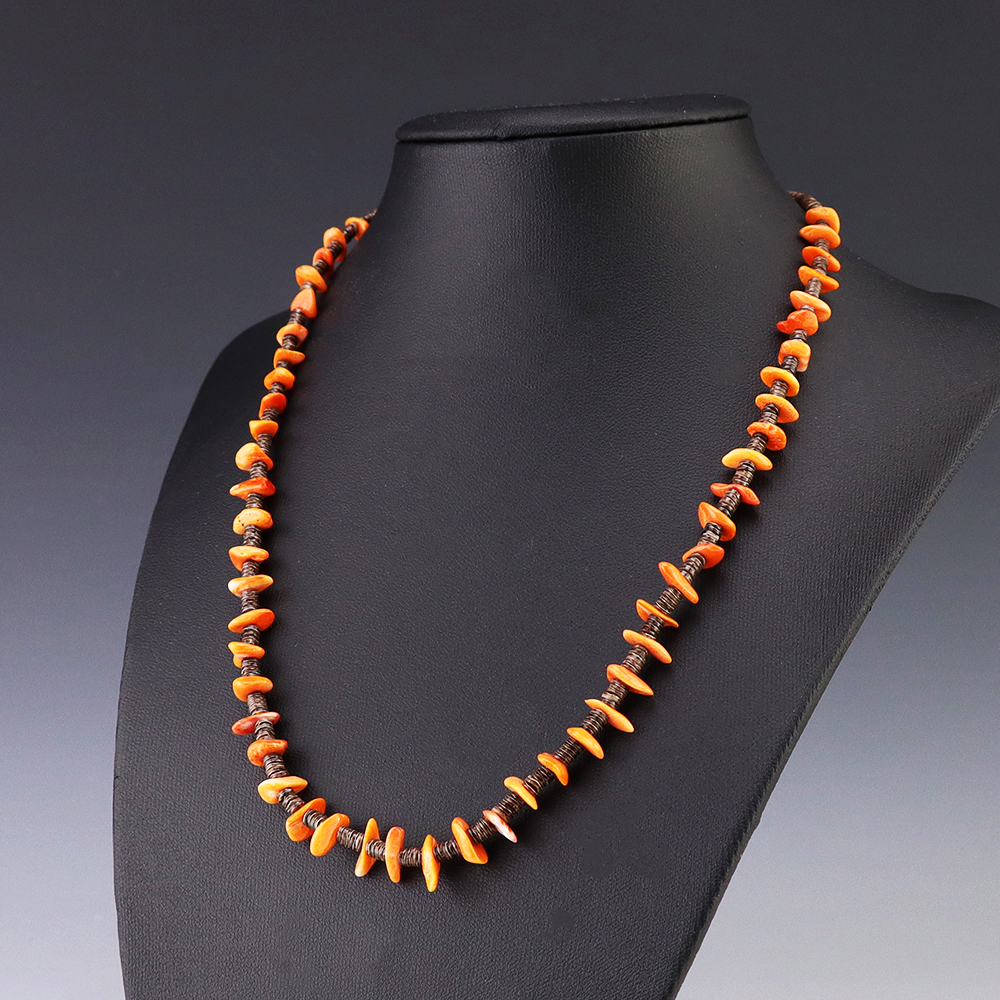 This necklace, hand made by Kewa artist Jeanette Calabaza, is a lovely statement piece. The necklace showcases fine Olive Shell and Spiny Oyster. The strand of heishi is finished off with a hook and eye. Weighs 12 grams.