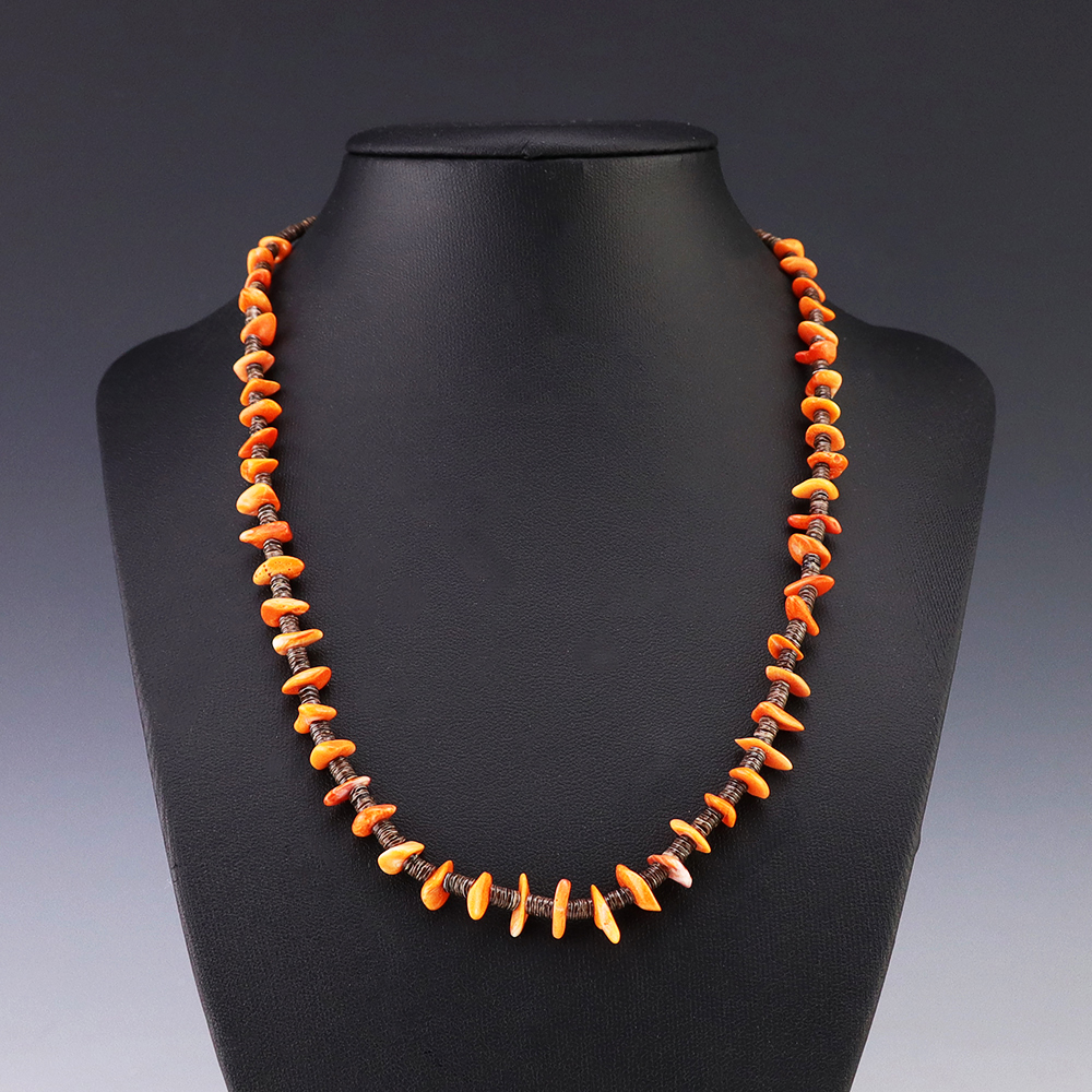Kewa (Santo Domingo) artists are known for their heishi. The word “heishi“ means “shell” in the Keresan language. Traditionally Kewa jewelry makers created their heishi jewelry out of shell. The shell is hand cut into a flat disc. Today, other stones that Santo Domingo artists cut in this manner, are also referred to as heishi. With modern tools and innovations, artists can create different styles of beads and use different gemstones like turquoise, coral, jet, serpentine, and spiny oyster.