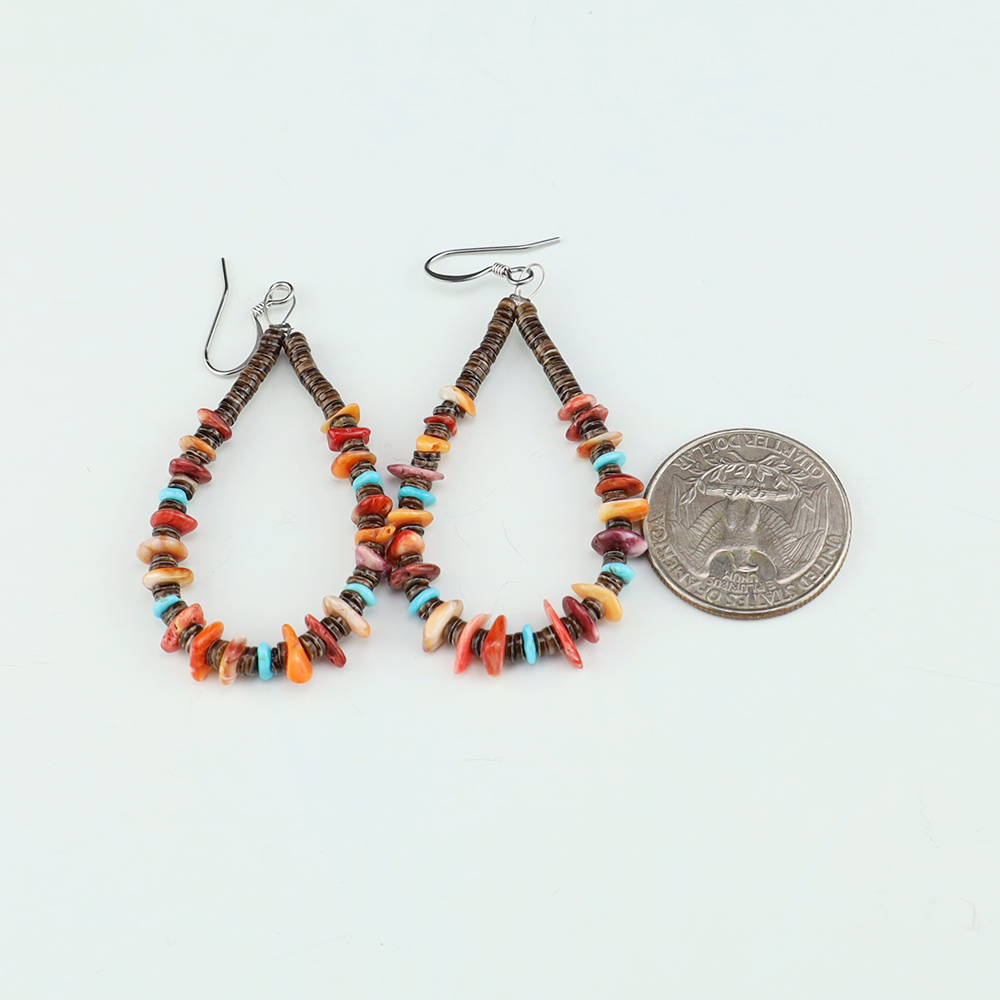 Kewa artist Jeanette Calabaza handcrafted these lovely earrings out of Turquoise, Spiny Oyster, and Olive Shell. These earrings will look fabulous with any outfit. Weighs 6 grams.