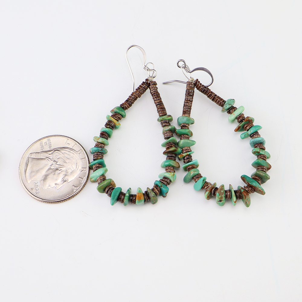 Kewa artist Jeanette Calabaza handcrafted these lovely earrings out of Turquoise and Olive Shell. These earrings will look fabulous with any outfit. Weighs 6 grams.