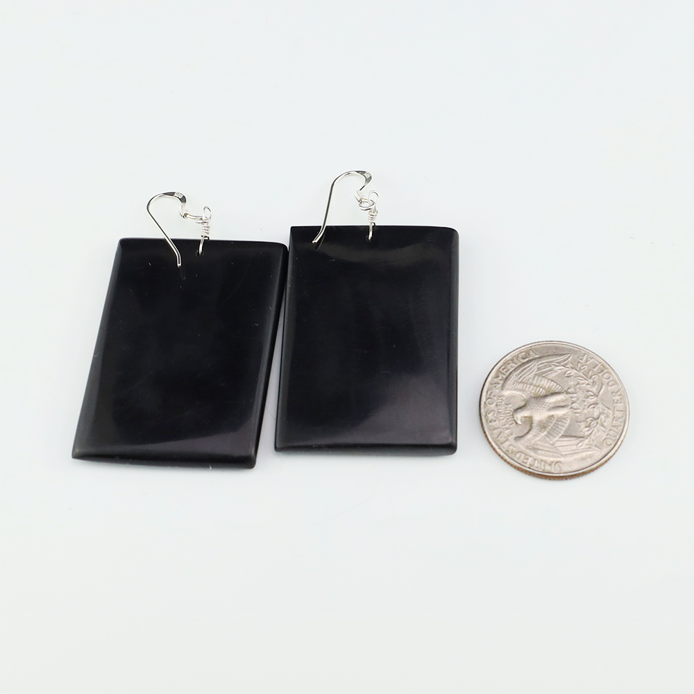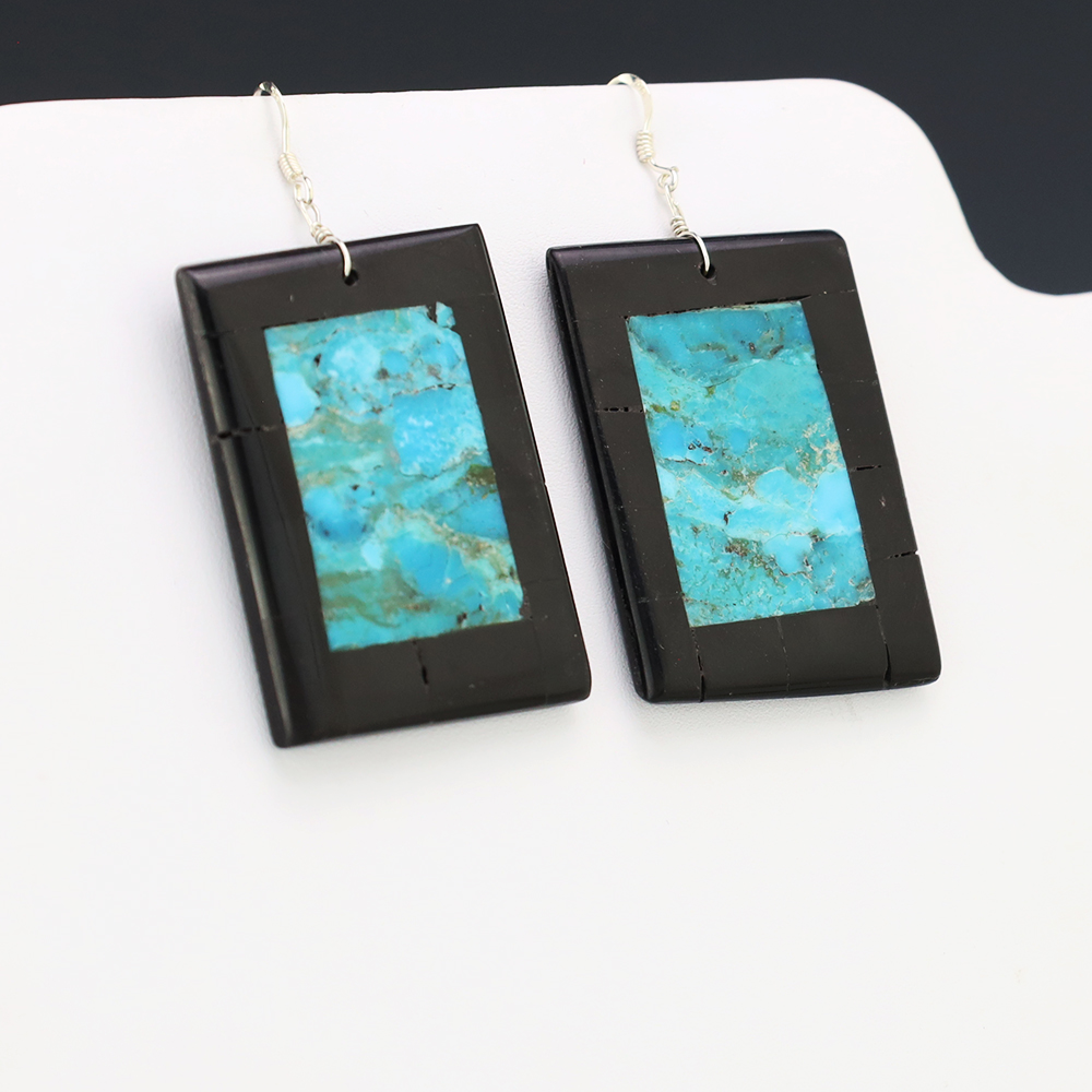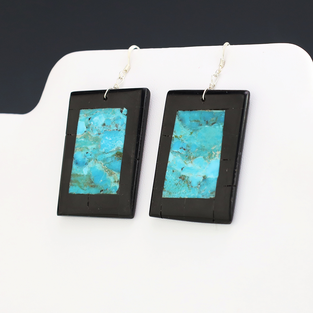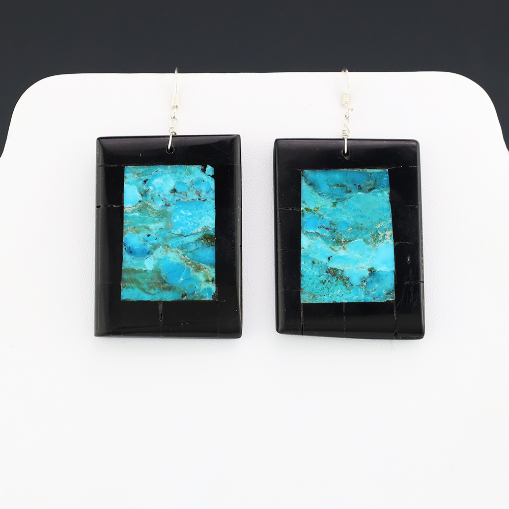 Hand made by Kewa artist Torevia Crespin, these beautiful mosaic earrings have a distinctive look. Made out of Turquoise and Jet. A great addition to your Native American jewelry collection. Weighs 20 grams.