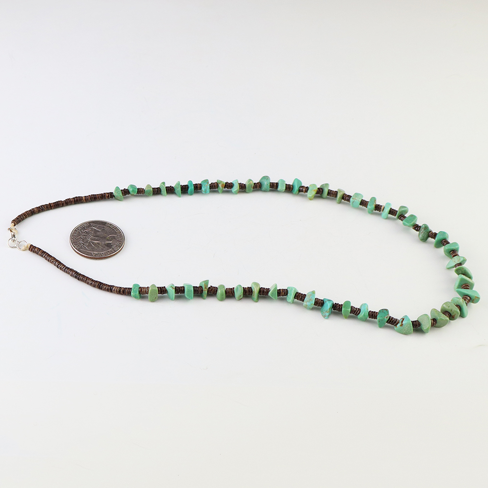 This necklace, hand made by Kewa artist Jeanette Calabaza, is a lovely statement piece. The necklace showcases fine Olive Shell and Turquoise. The strand of heishi is finished off with a hook and eye. Weighs 14 grams.
