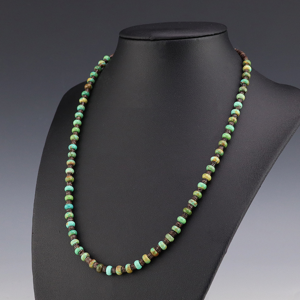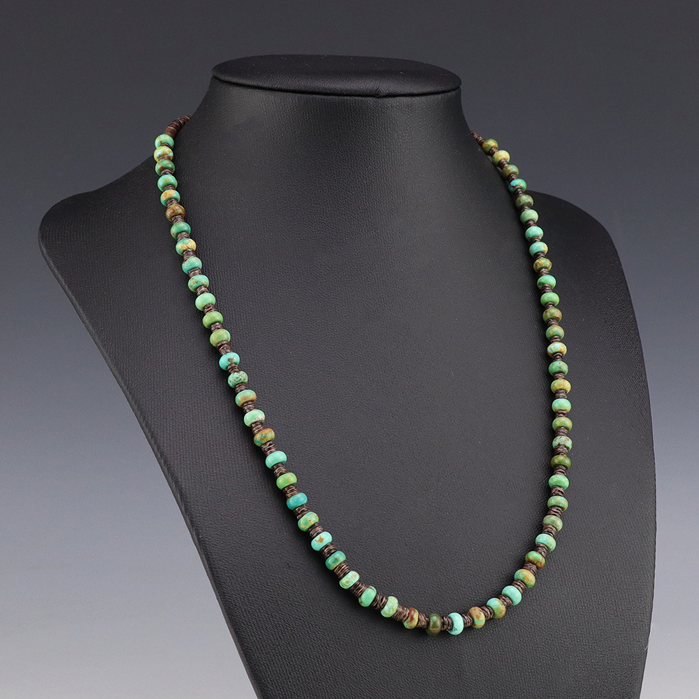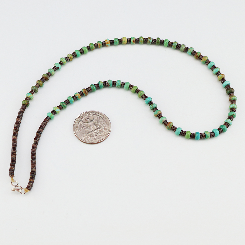 This necklace, hand made by Kewa artist Jeanette Calabaza, is a lovely statement piece. The necklace showcases fine Olive Shell and Turquoise. The strand of heishi is finished off with a hook and eye. Weighs 12 grams.