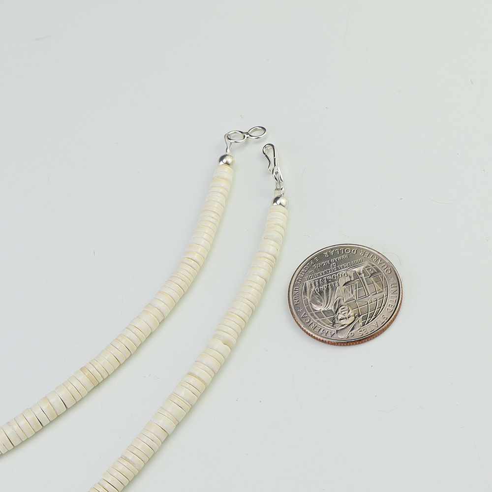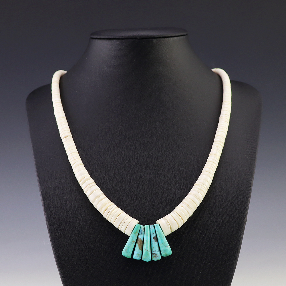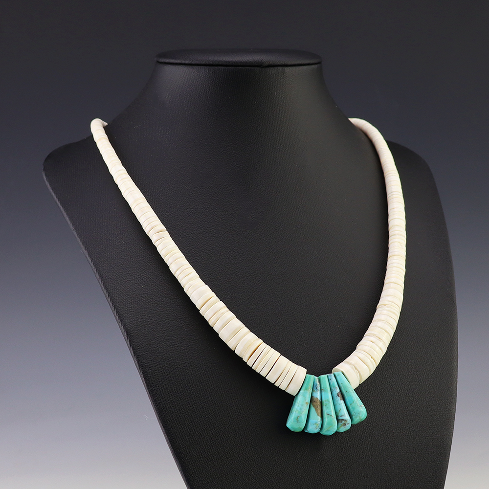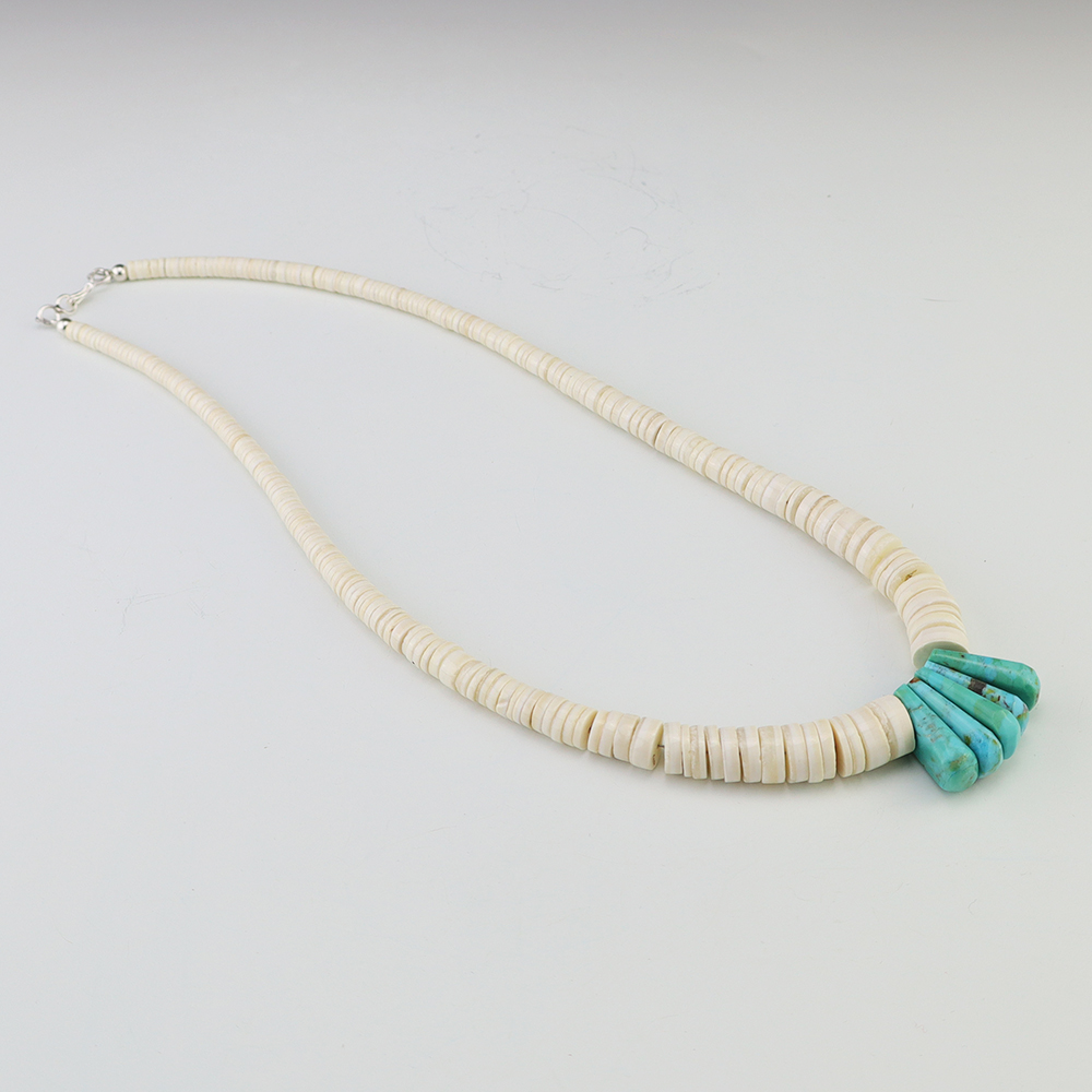 Amazing color combination! Kewa artist Lupe Lovato hand crafted this gorgeous necklace out of Turquoise and White Clam. Traditionally made by hand cutting, drilling, rolling, and stringing. Weighs 48 grams. A timeless beauty that you will enjoy for years to come.